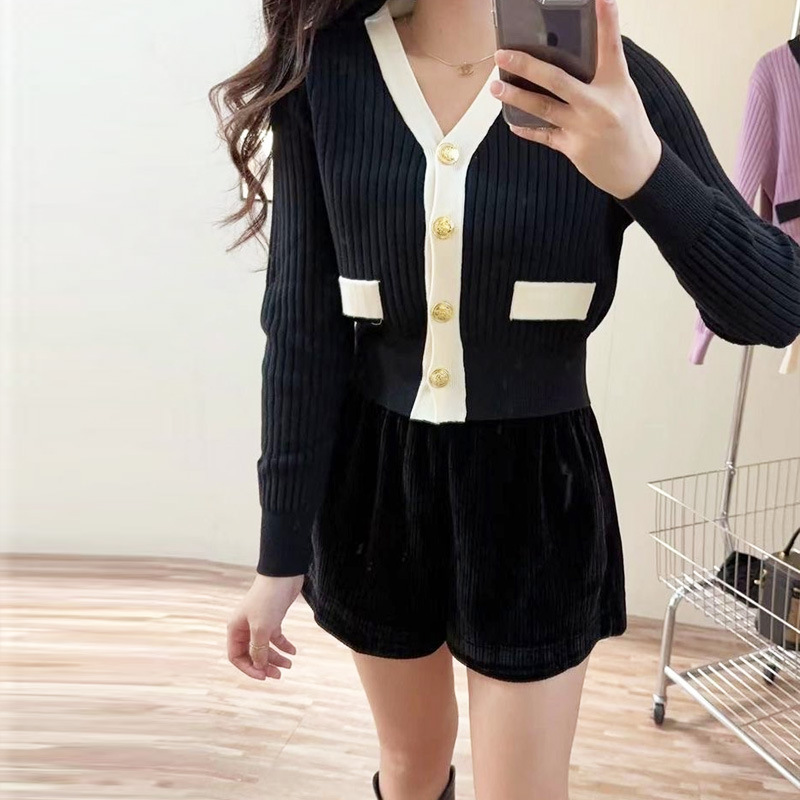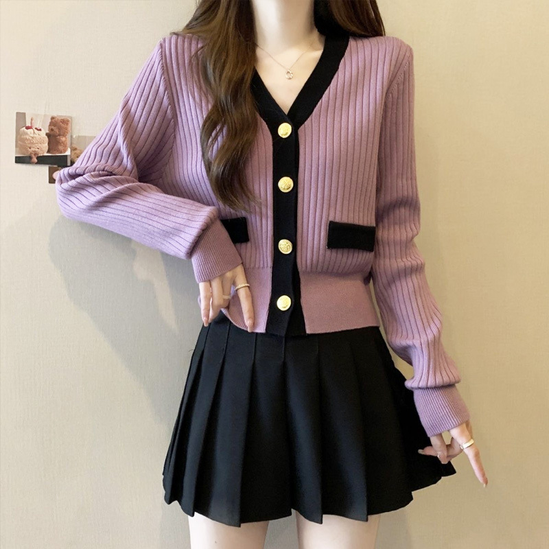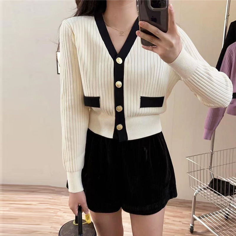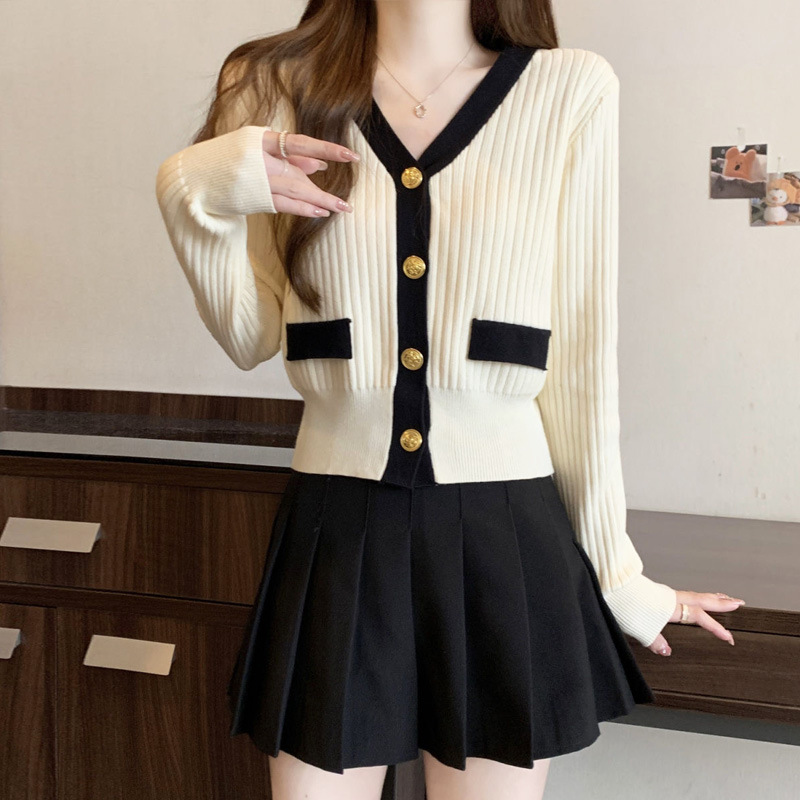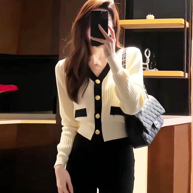 가을과 겨울 프랑스 V-넥 컬러 매칭 싱글 브레스트 긴팔 니트 카디건 스웨터 코트 여성 기질 디자인 탑스토어 가기