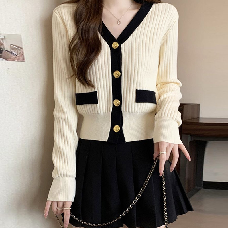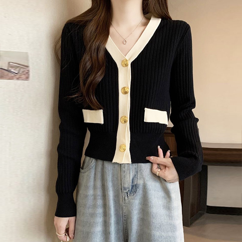 가을과 겨울 프랑스 V-넥 컬러 매칭 싱글 브레스트 긴팔 니트 카디건 스웨터 코트 여성 기질 디자인 탑