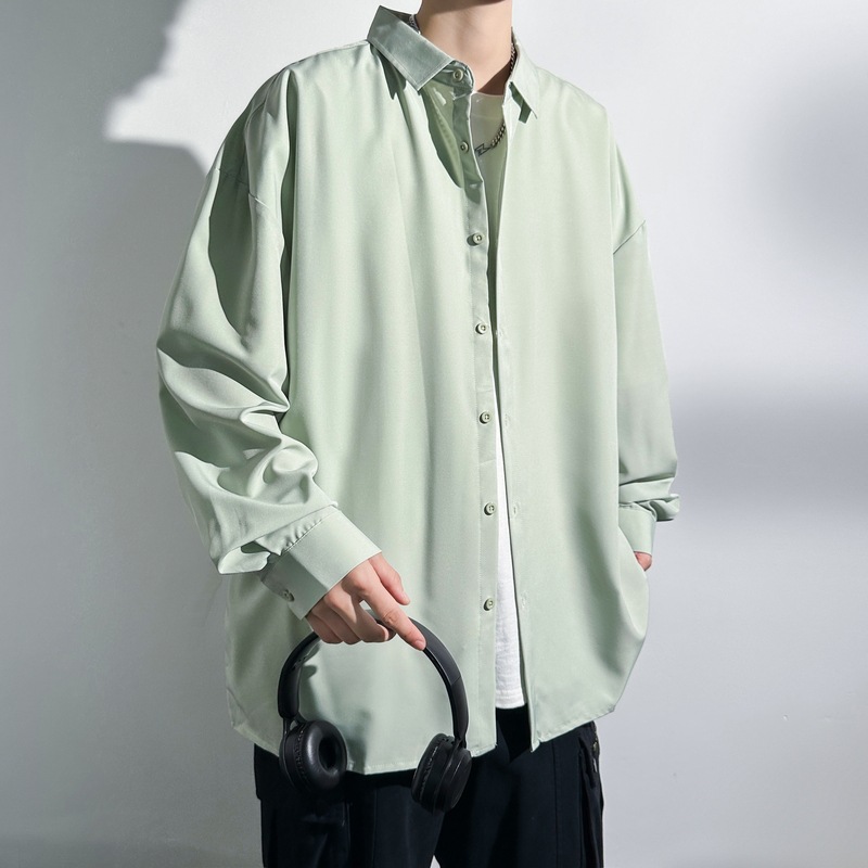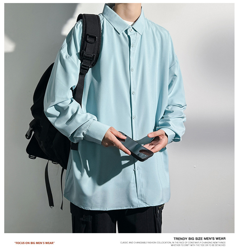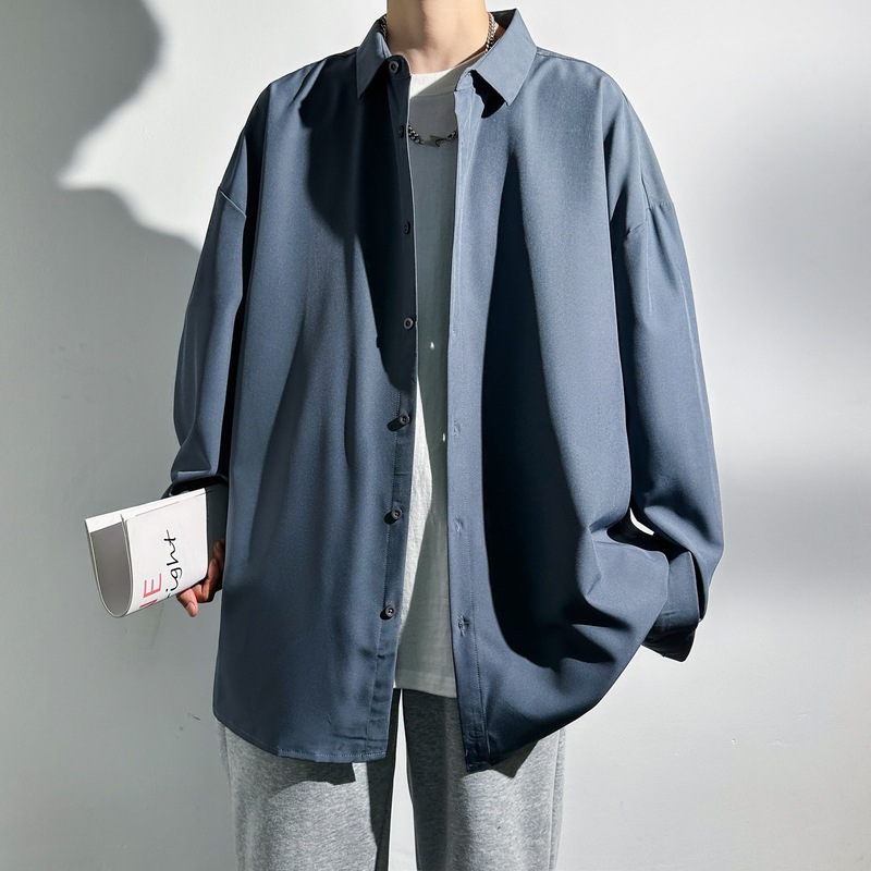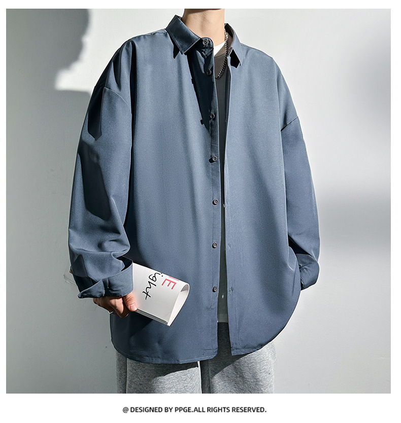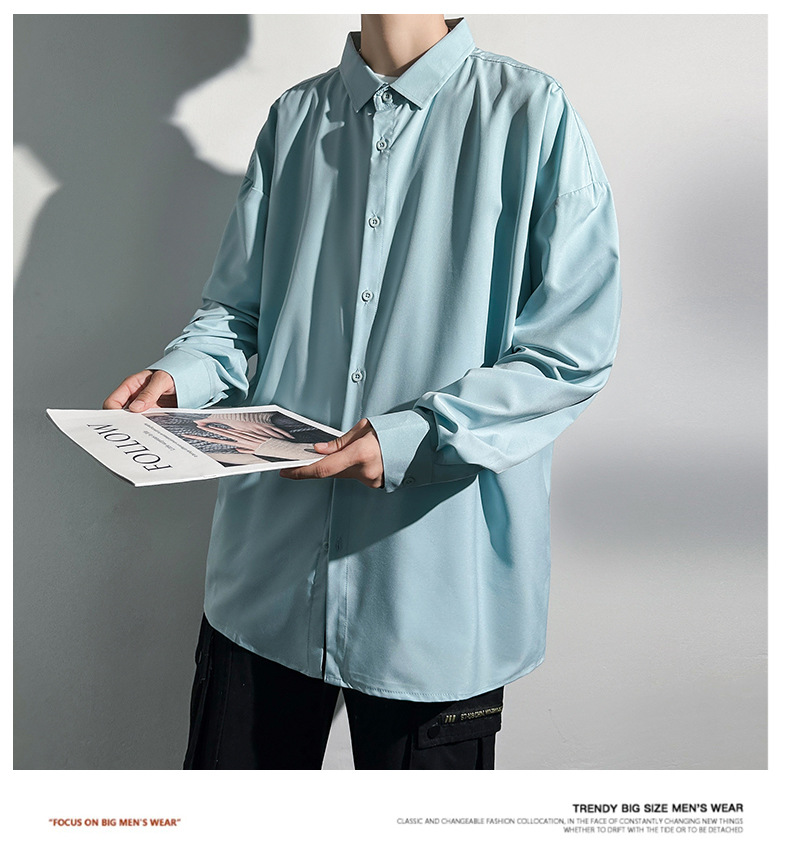 남자의 드레이프 캐주얼 재킷 느슨한 셔츠 남자의 긴 소매 한국 스타일 아이스 실크 더피 잘 생긴 디자인 스트레치 셔츠스토어 가기