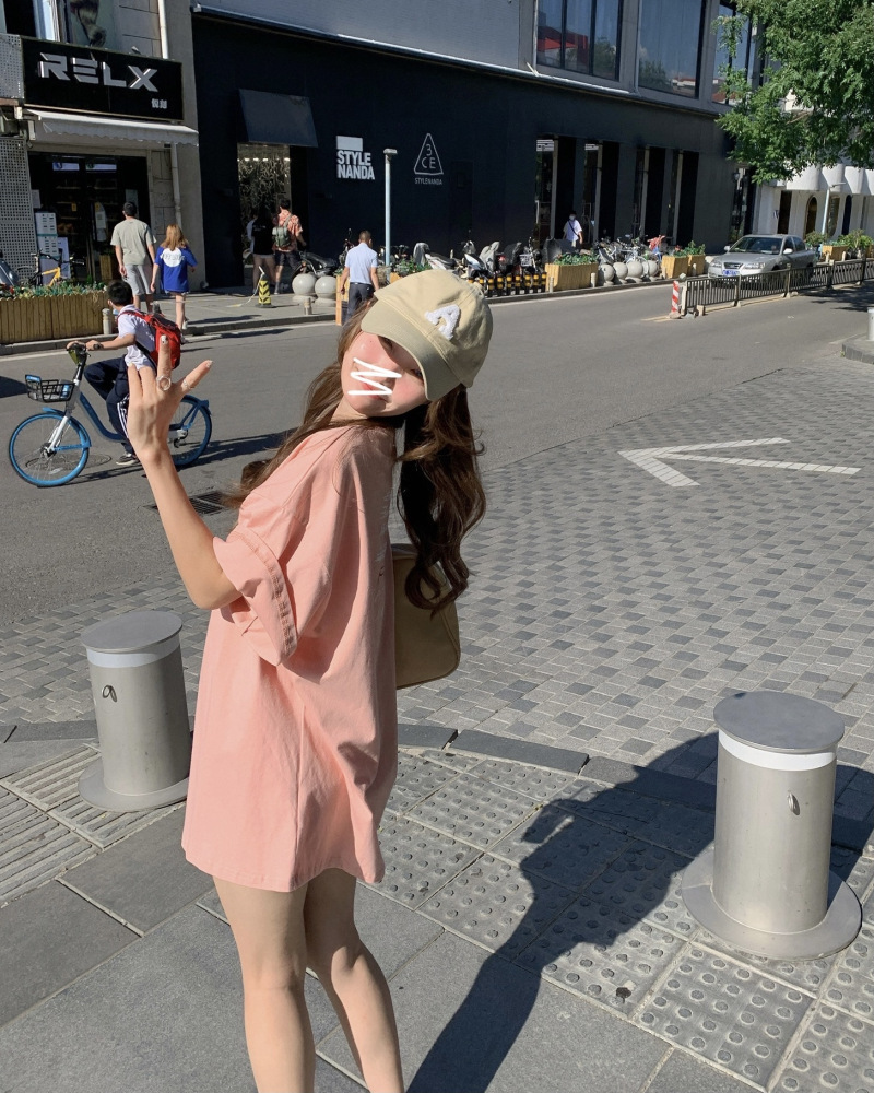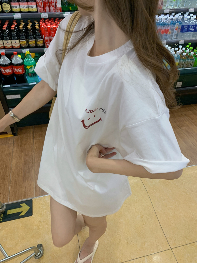 핑크 웃는 얼굴 반팔 티셔츠 여성 여름 2025 새로운 디자인 감각 느슨한 누락 하의 반팔 학생 탑스토어 가기