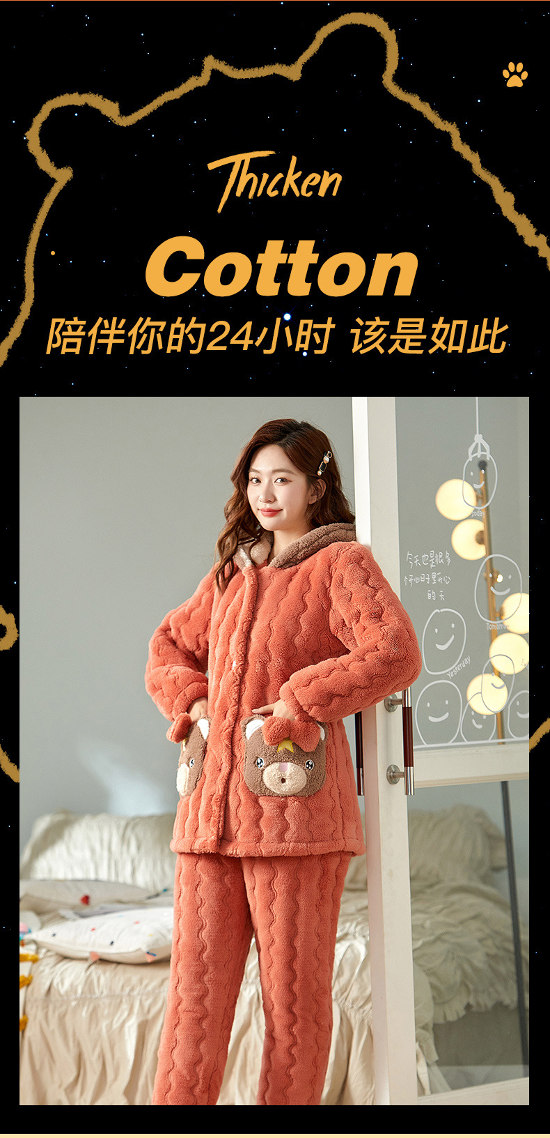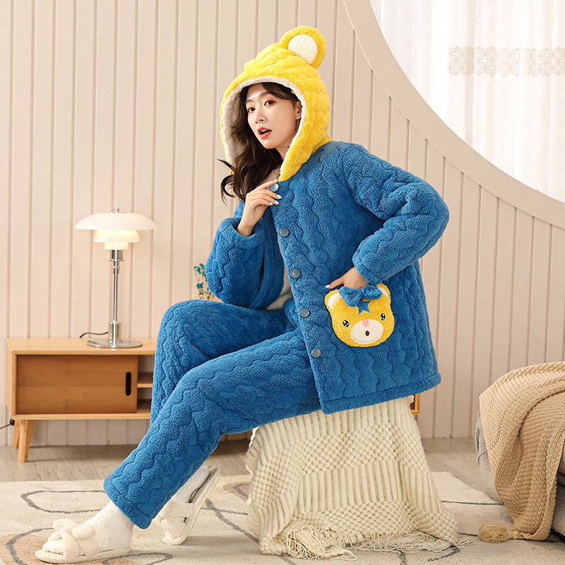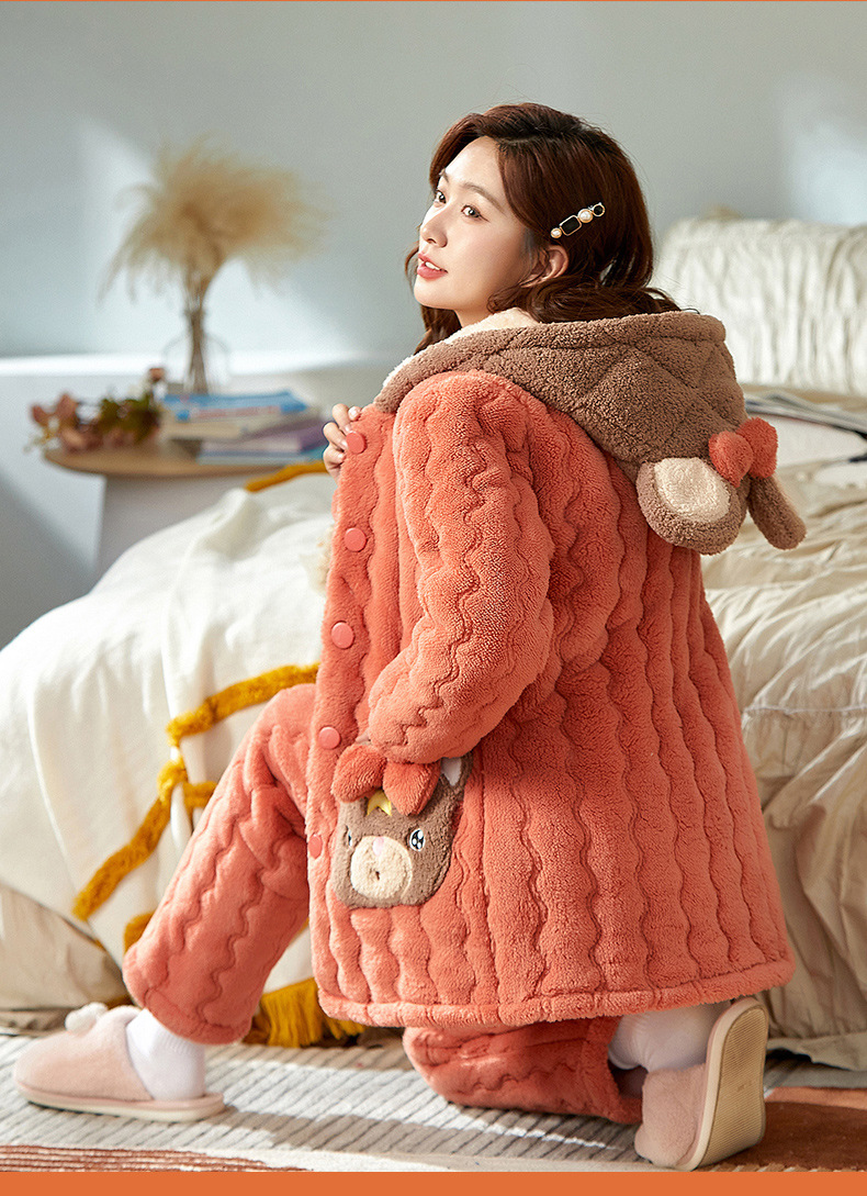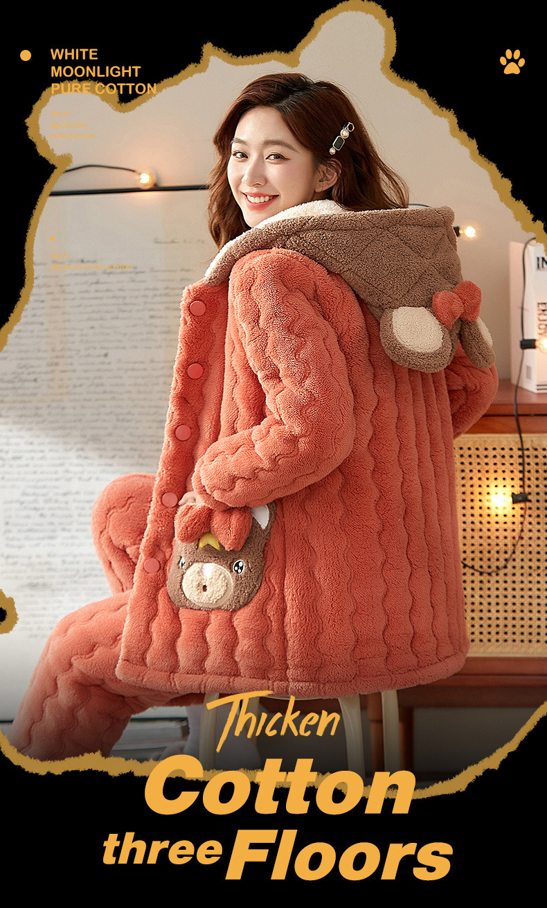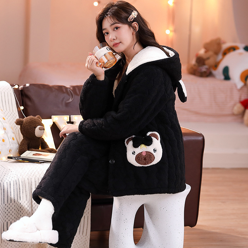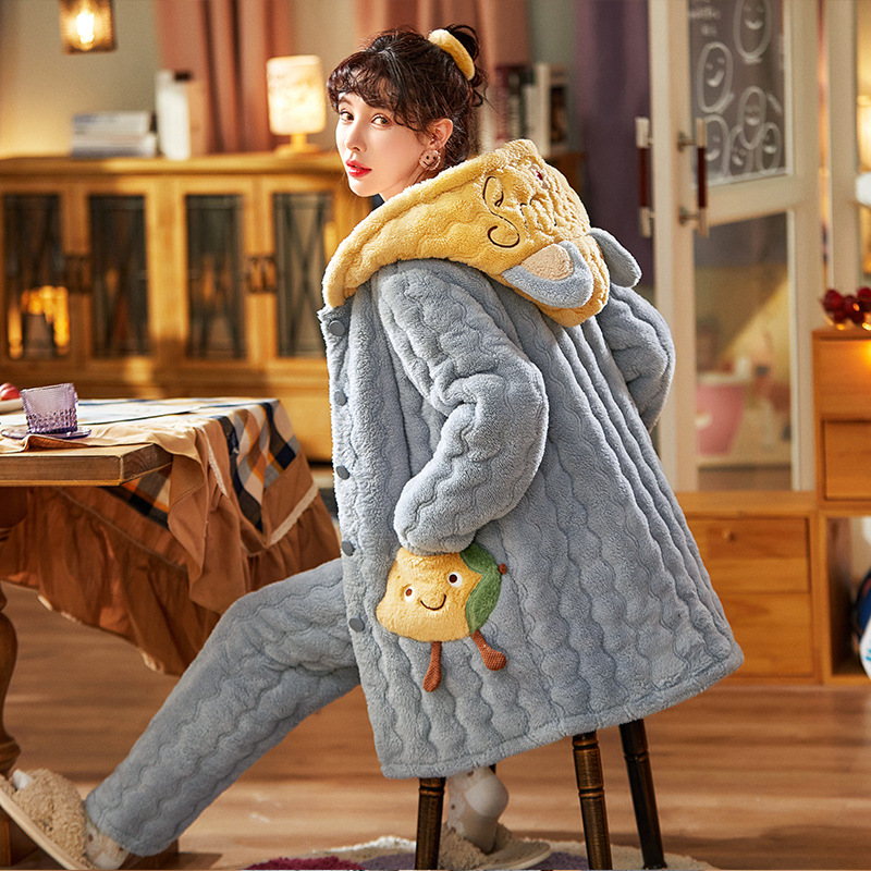 잠옷 여자의 겨울 산호 양털 3 층 두꺼운 기모 가정 옷 달콤한 귀여운 플란넬 따뜻한 느슨한 세트