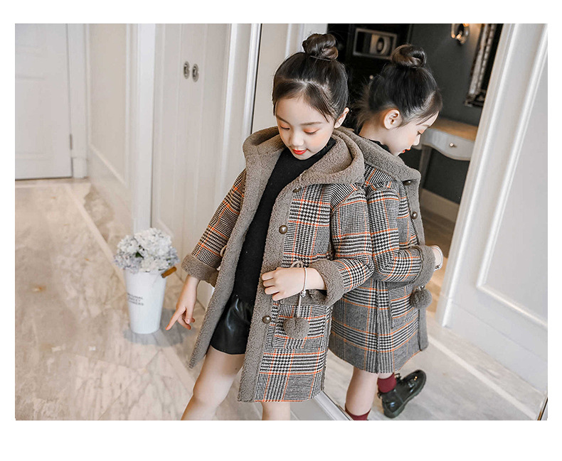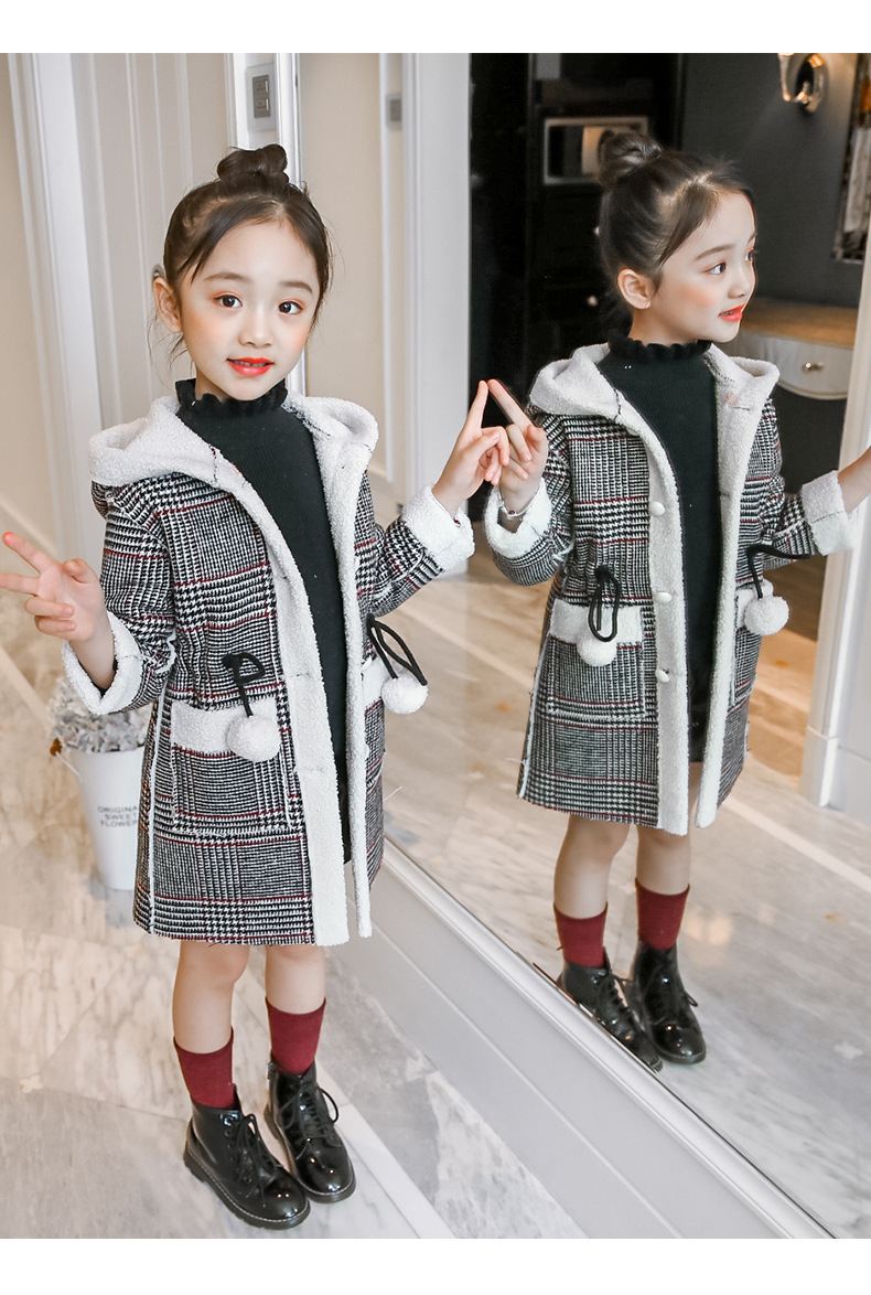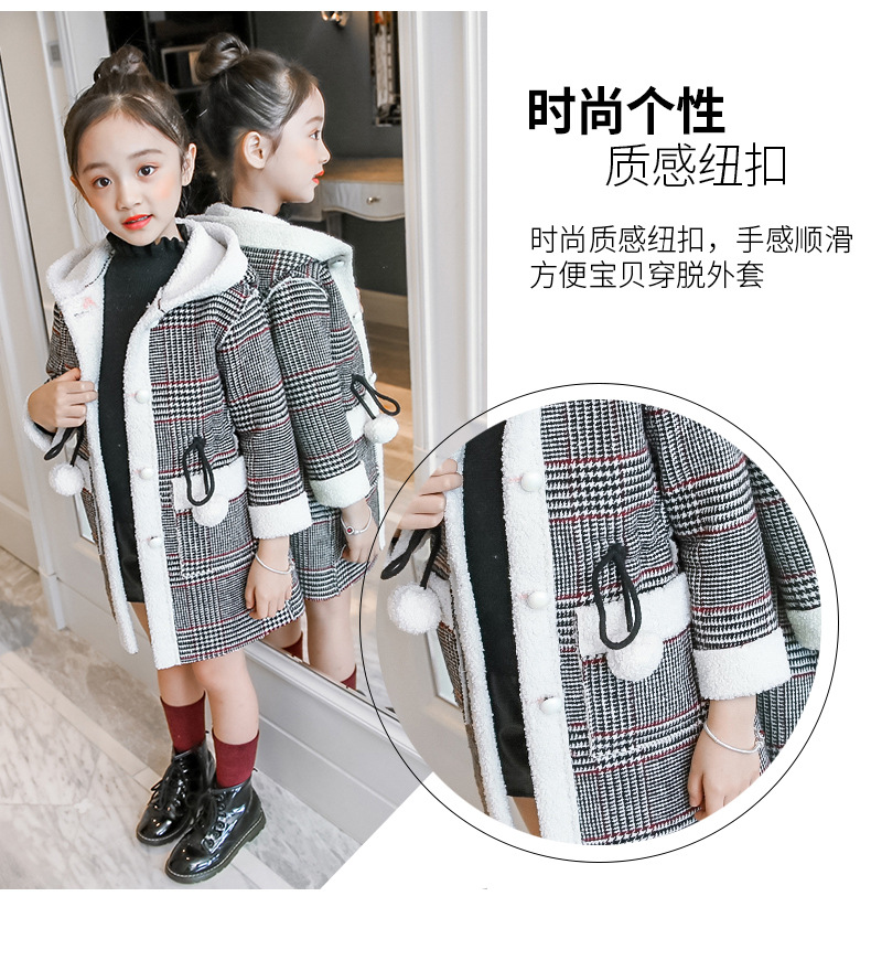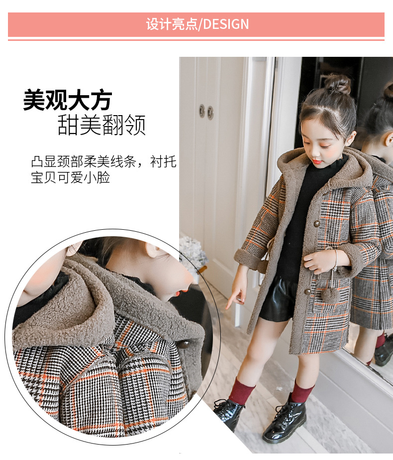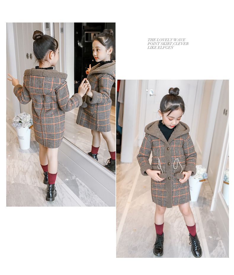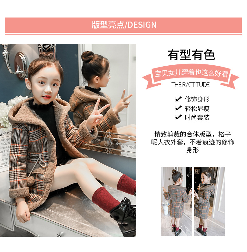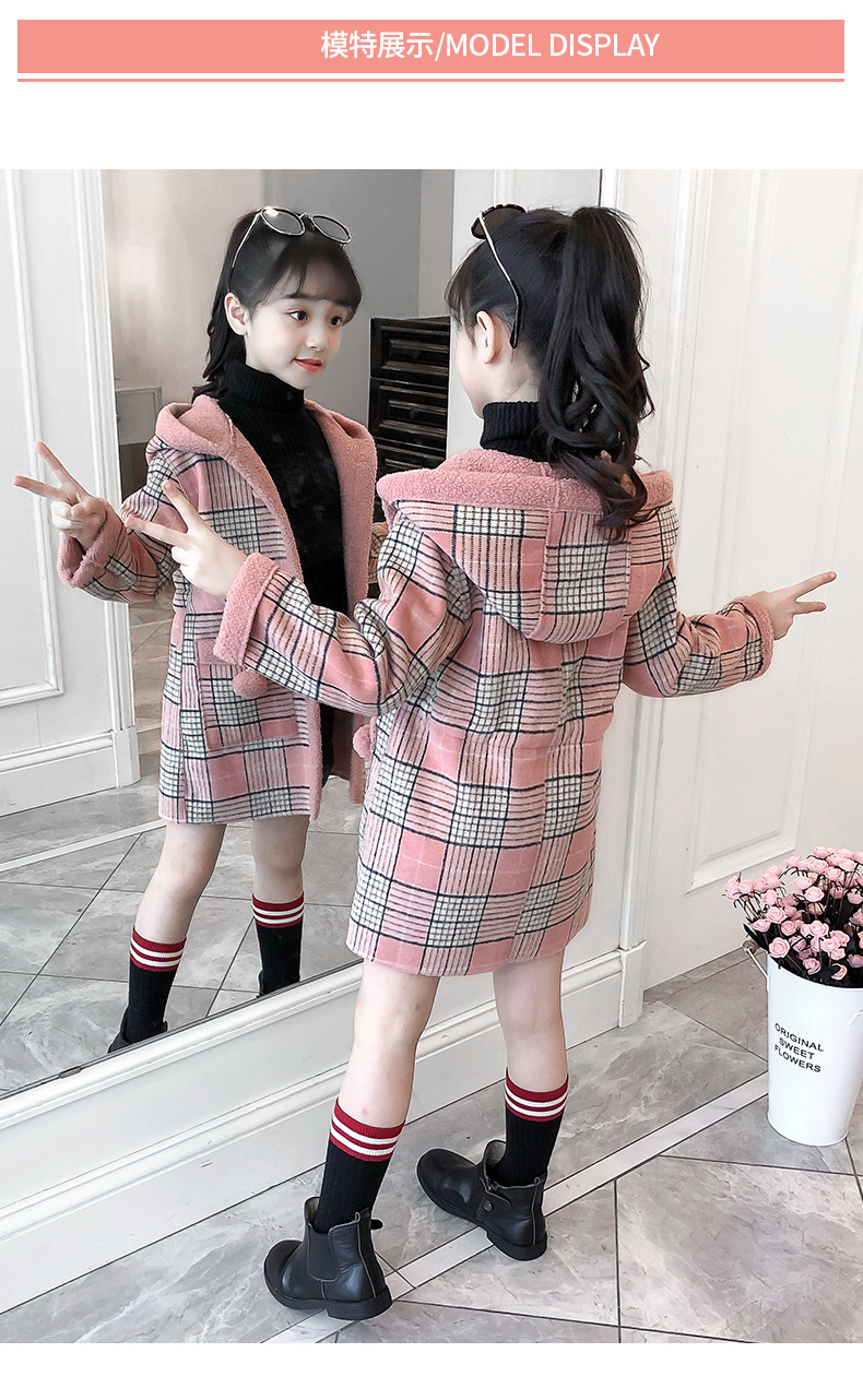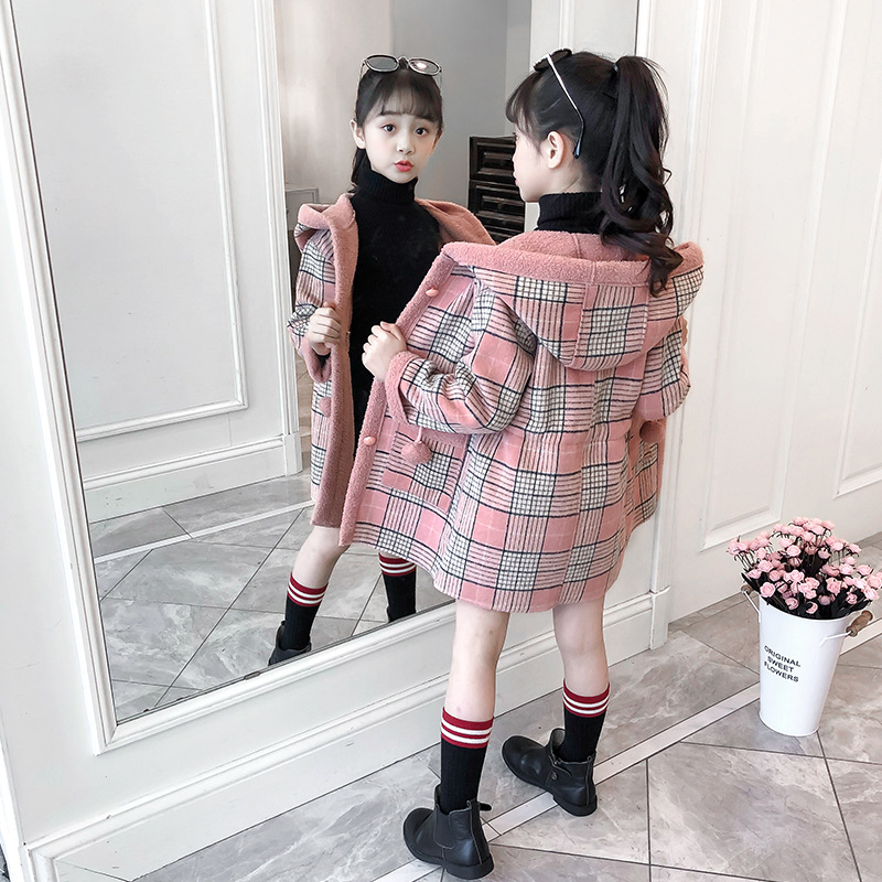 아동복 겨울 신상 여아용 플리스 안감 한국 스타일 체크무늬 코트 2023 아동 패션 후드 따뜻한 재킷 트렌디