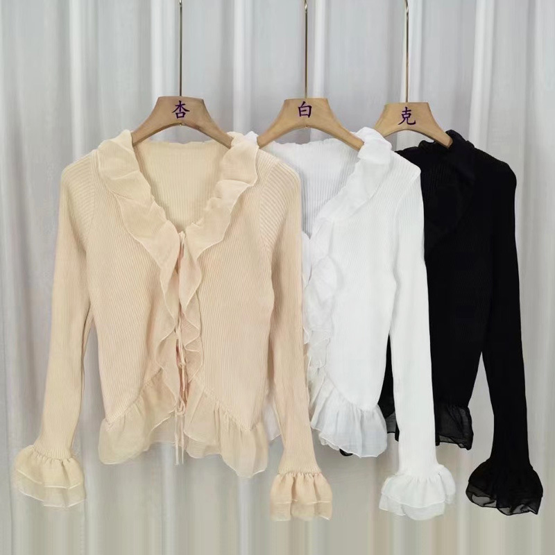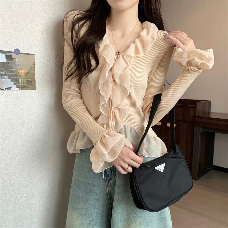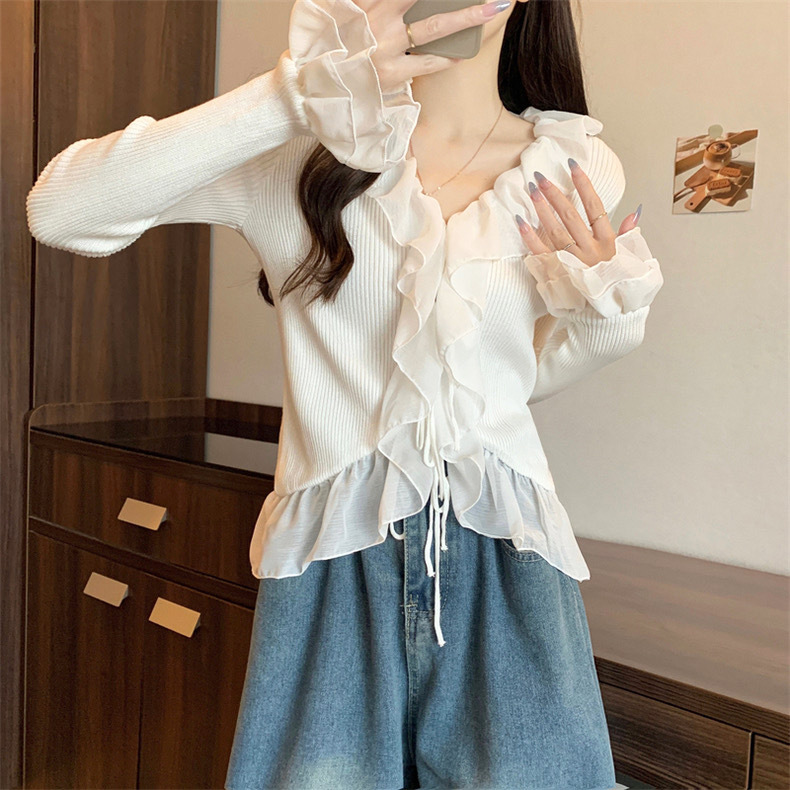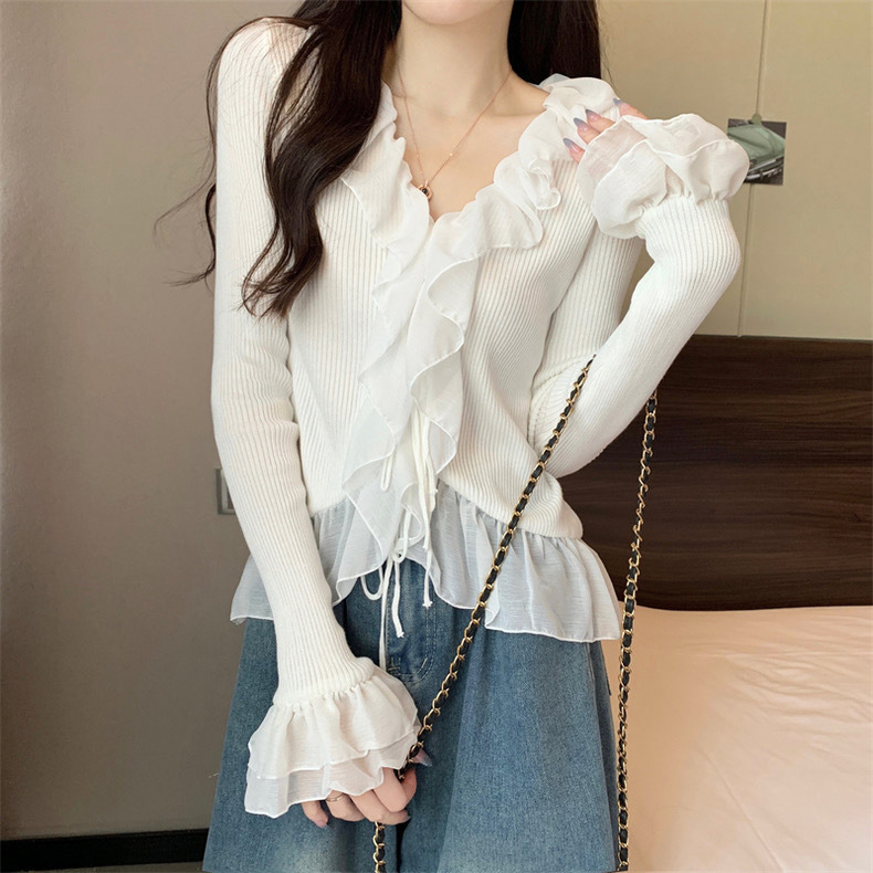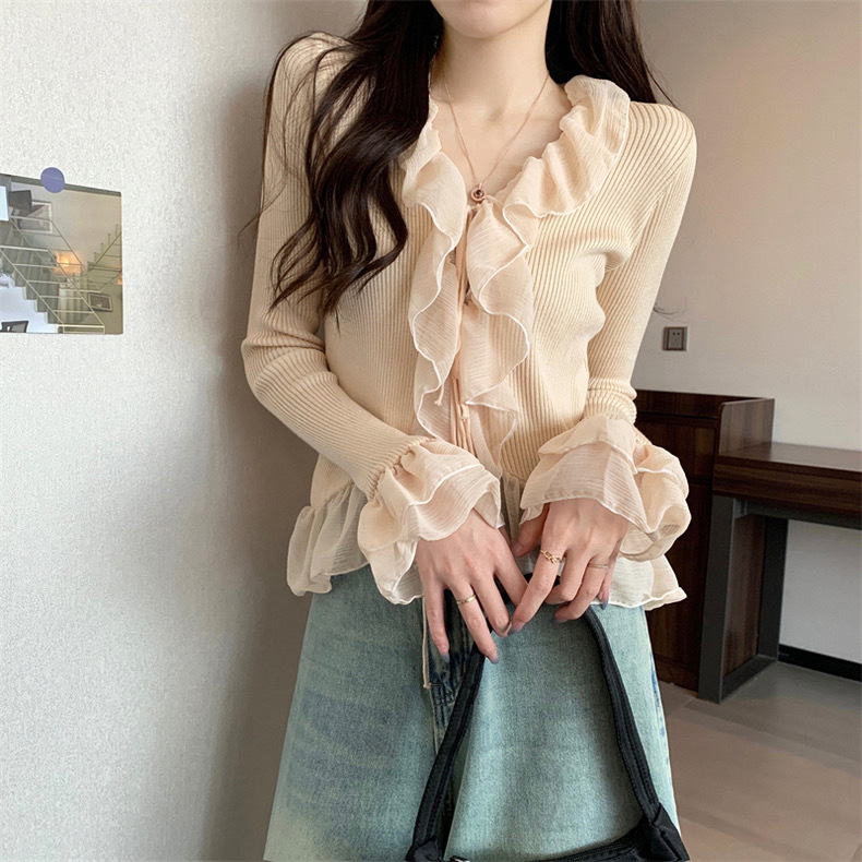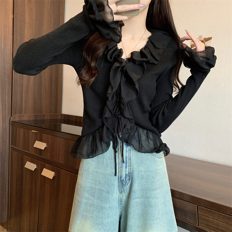 가을과 겨울 새로운 디자인 센스 틈새 러플 스트랩 긴팔 스웨터 여성용 우아한 모든 매치 여성용 쇼트 탑스토어 가기