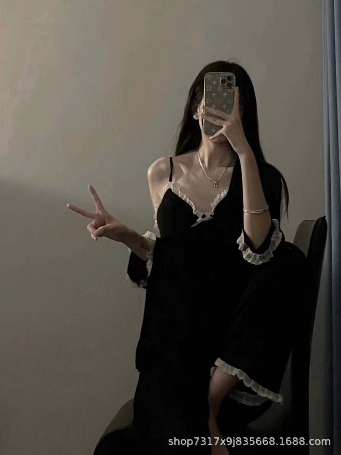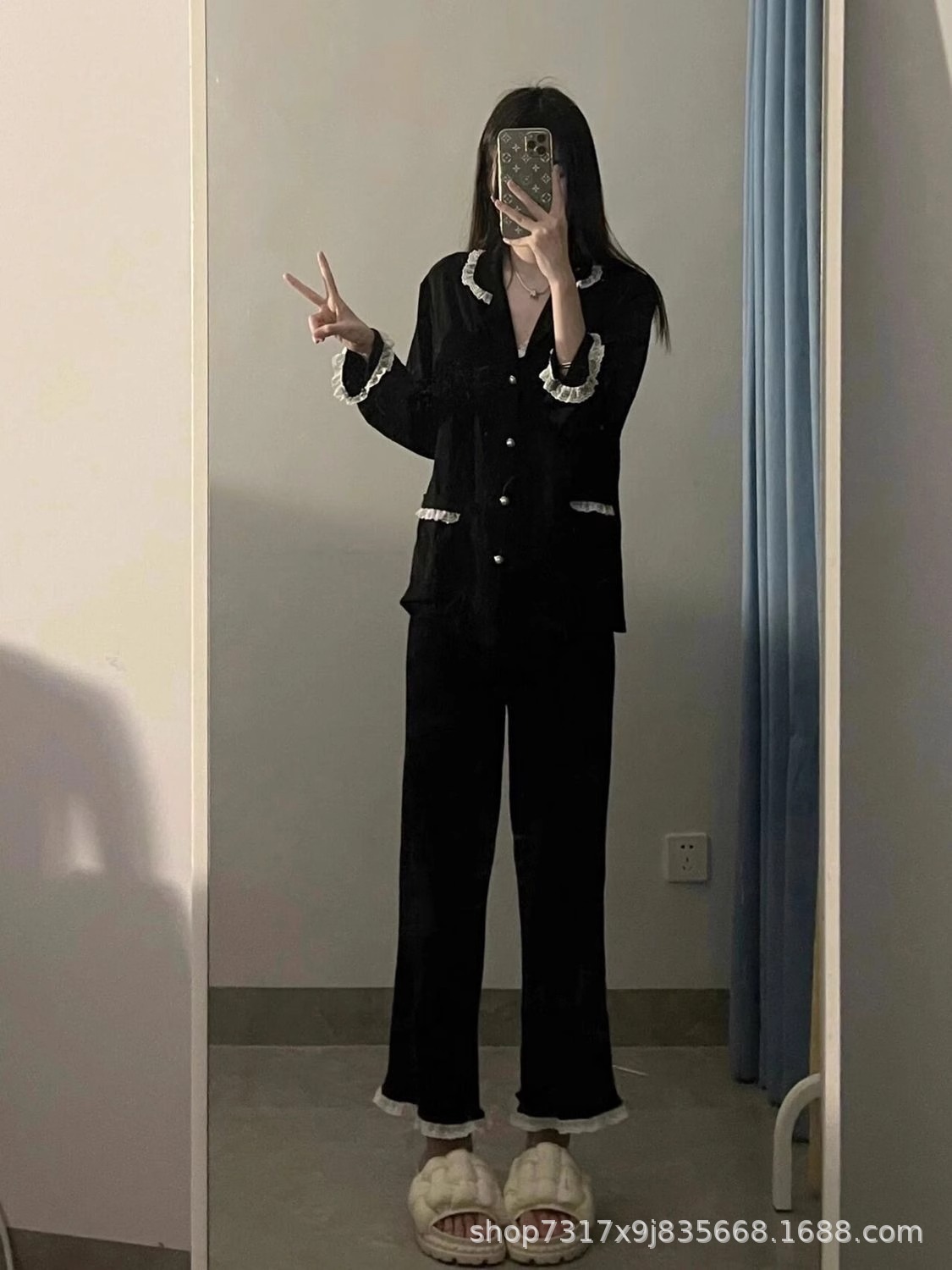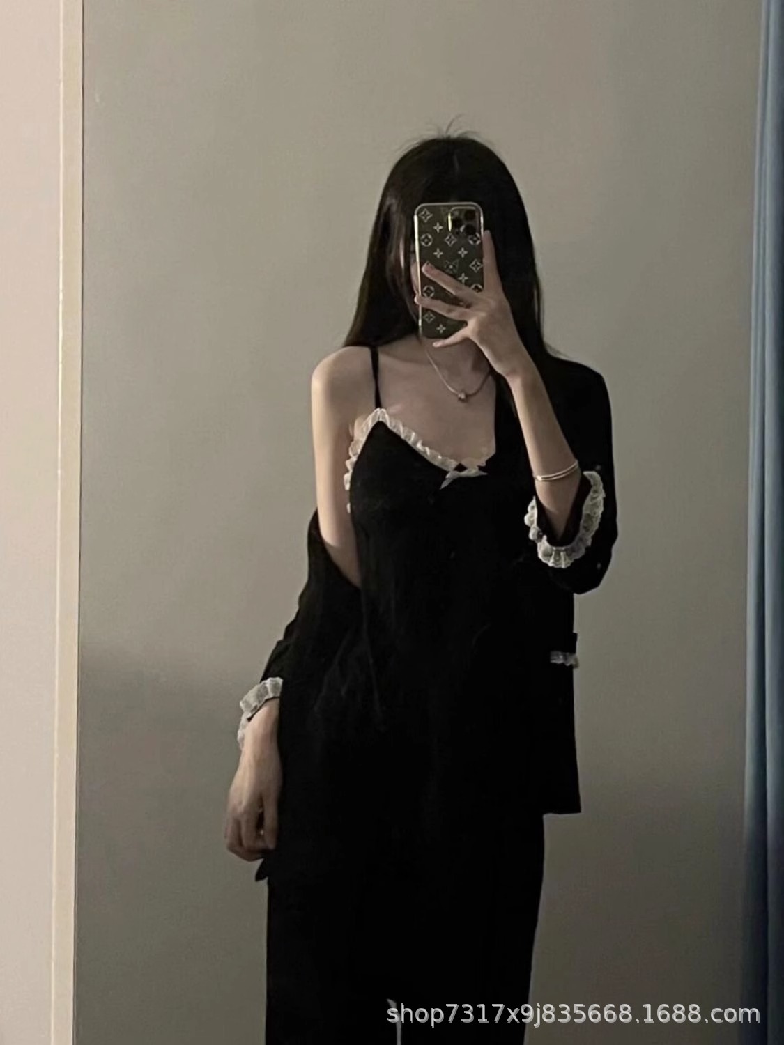 여성을위한 프랑스 고급 서스펜더 잠옷 봄, 가을 인터넷 연예인 스타일 소녀의 달콤한 바지 홈웨어 3 피스 슈트스토어 가기