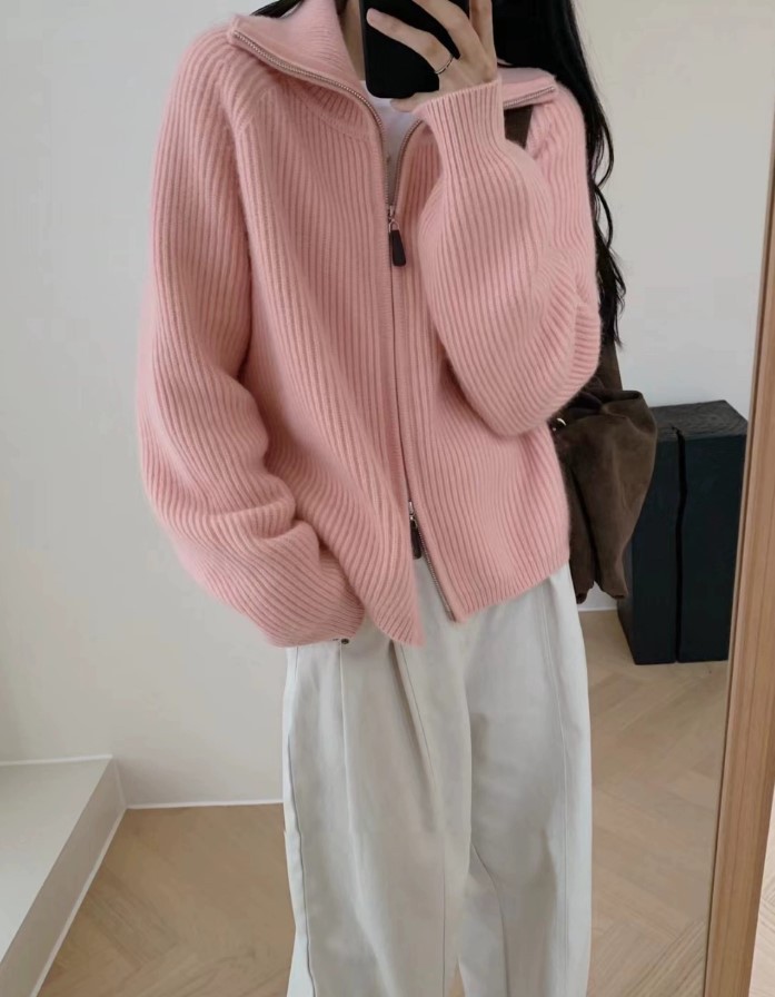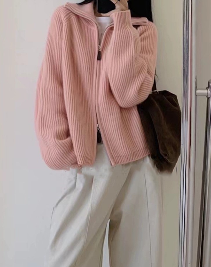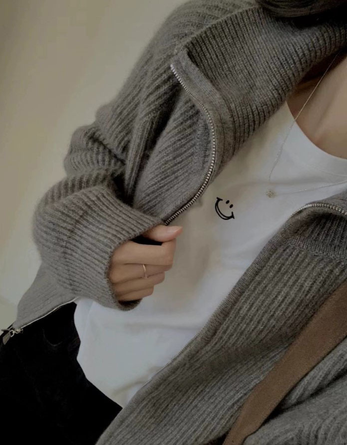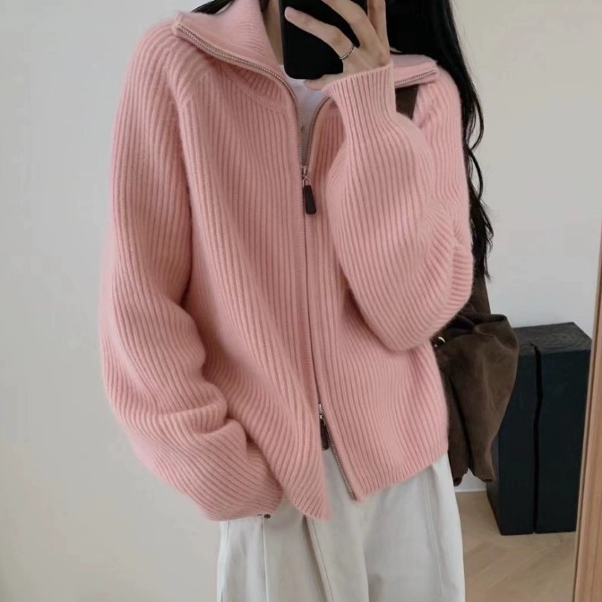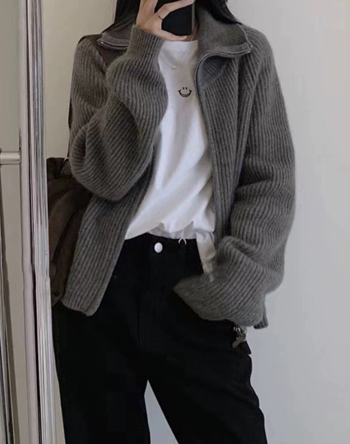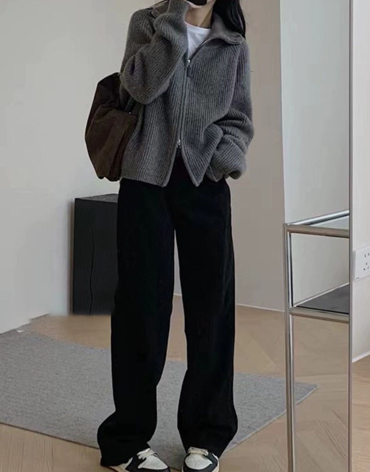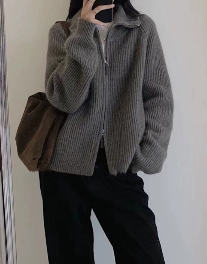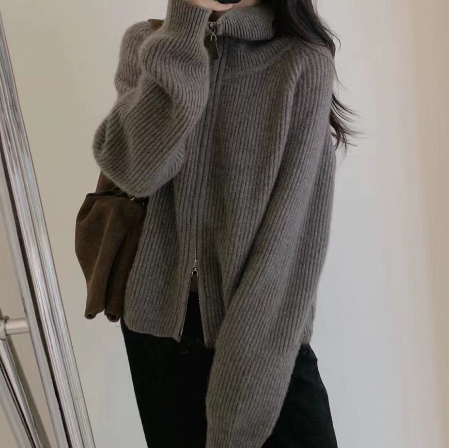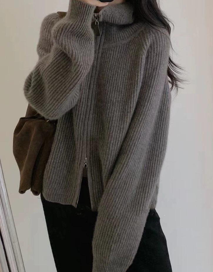 그레이 너구리 벨벳 하프 하이 칼라 세로 칼라 더블 지퍼 스웨터 재킷 여성의 가을과 겨울 두꺼운 겉옷 니트 가디건
