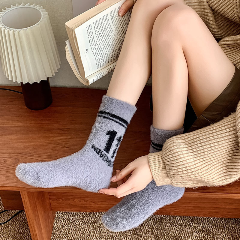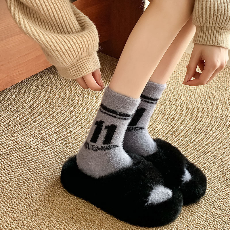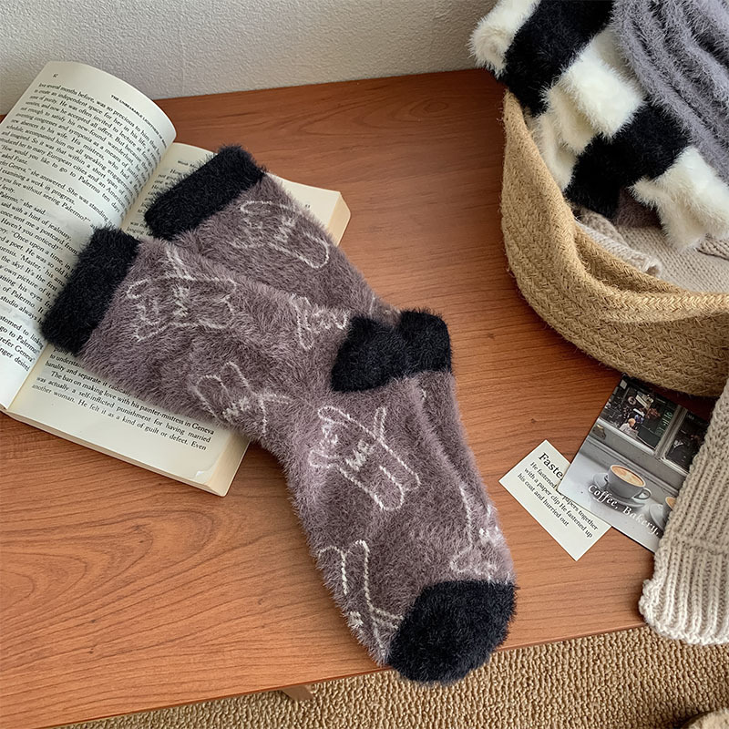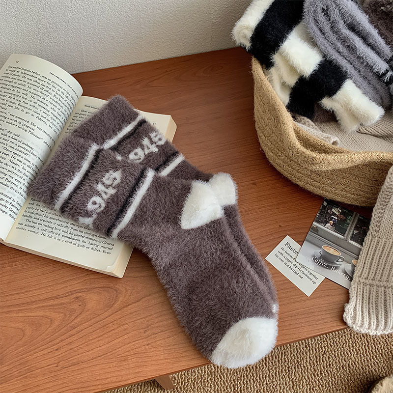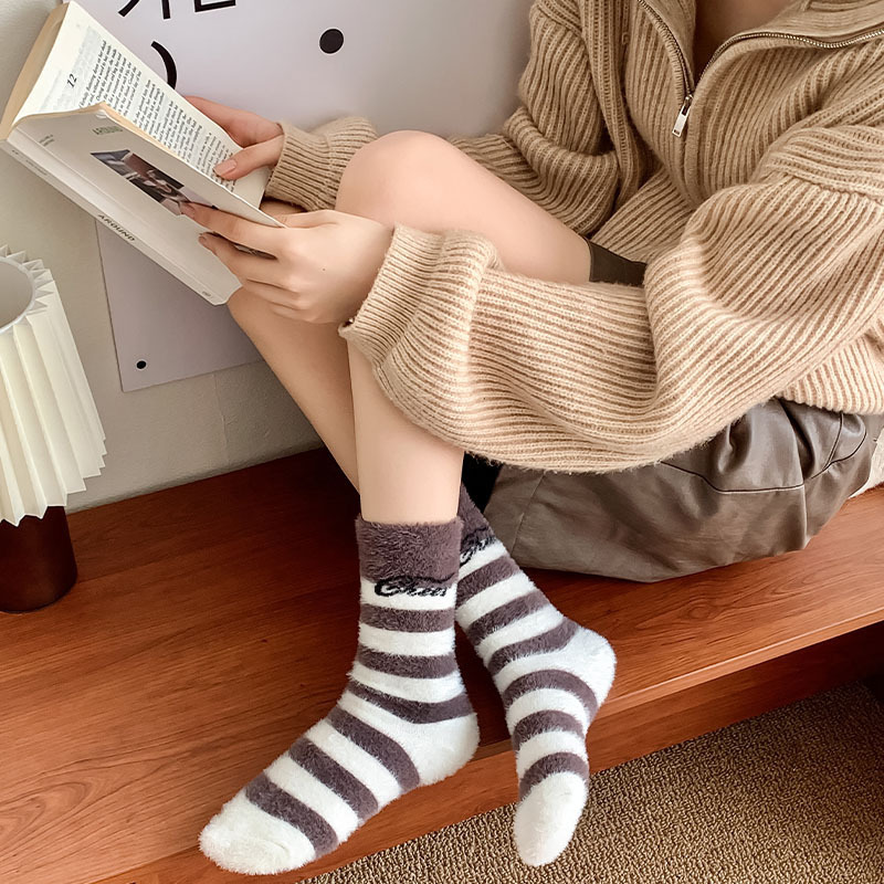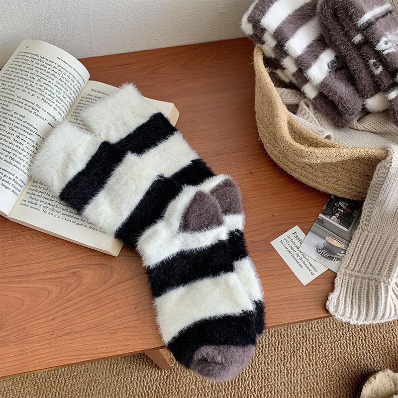 모피 양말 여자의 귀여운 만화 따뜻한 벨벳 중간 길이 양말 겨울 두꺼운 따뜻한 흑백 줄무늬 거친 슬리퍼 양말