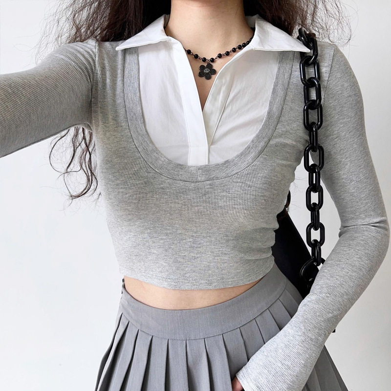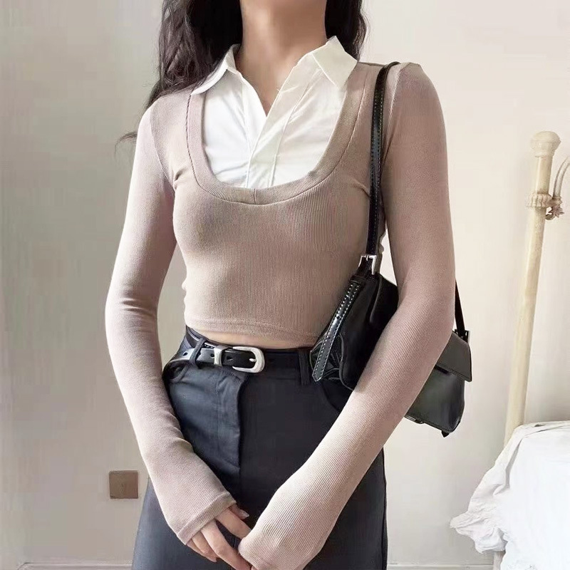 가짜 투피스 긴팔 티셔츠 여성의 가을 순수한 욕망 스티치 슬림핏 핫 걸 탑 디자인 센스 베이스 니트스토어 가기