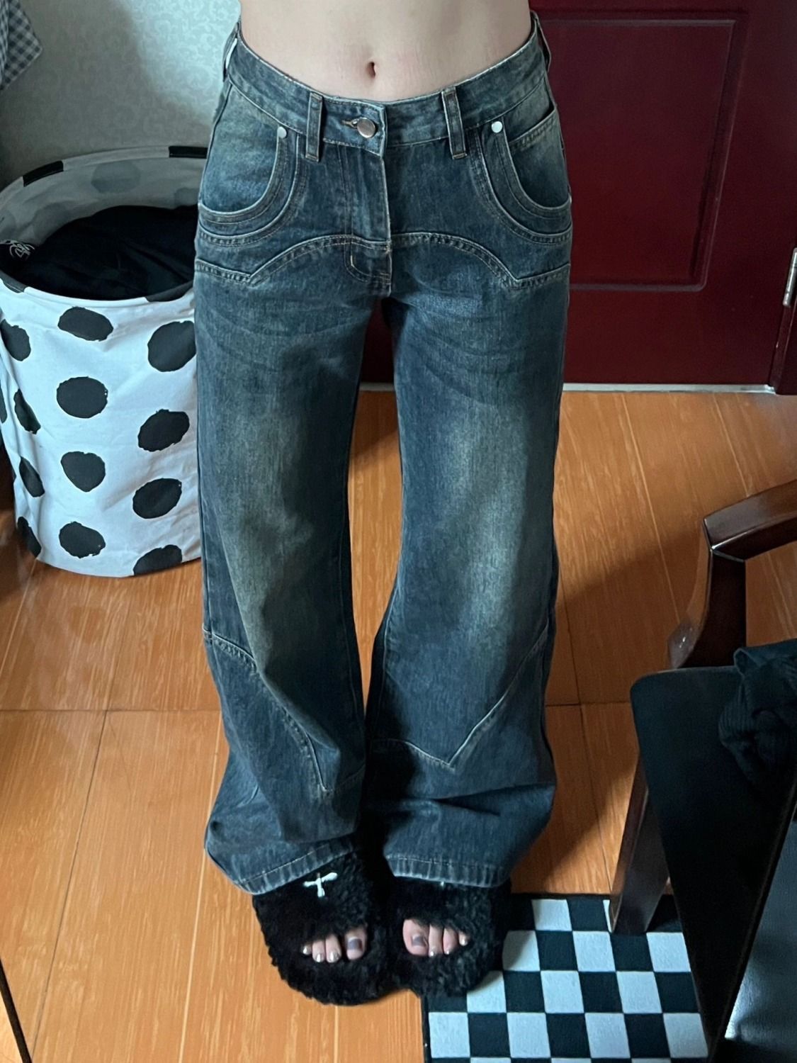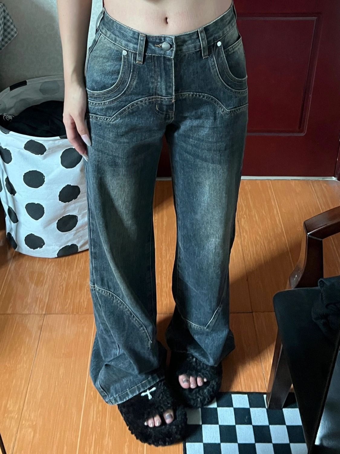 아메리칸 스타일 레트로 와이드 레그 청바지 여성의 가을 2024 새로운 높은 허리 딥 스트레이트 루스 걸레 바지스토어 가기