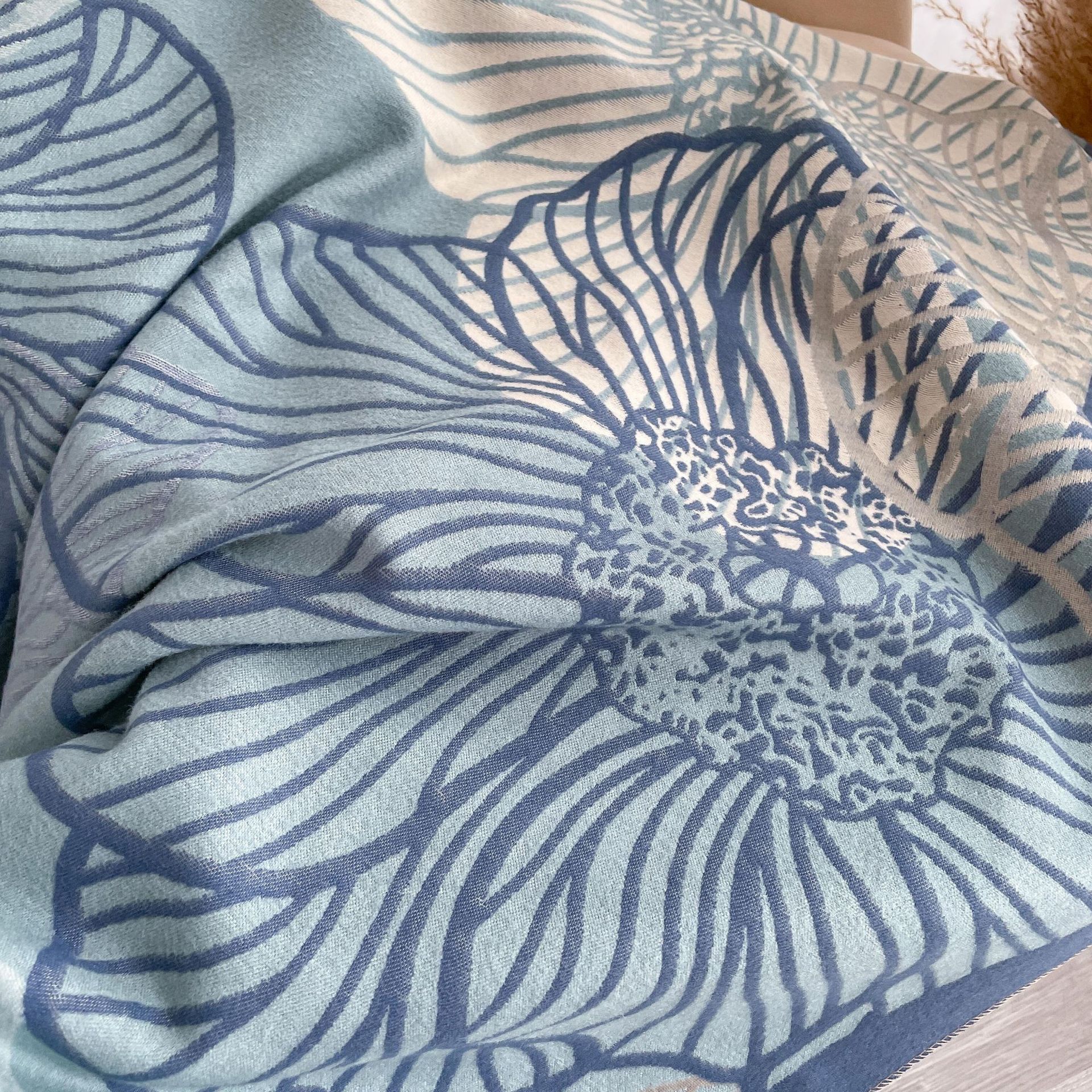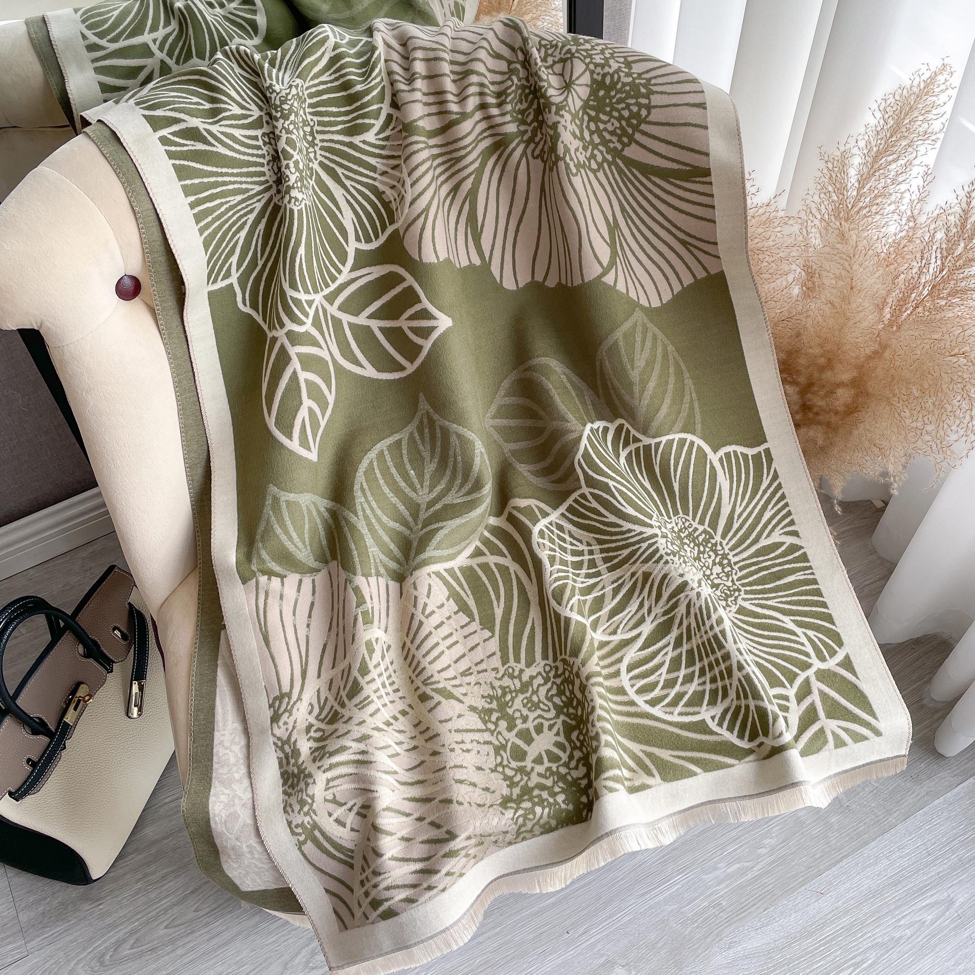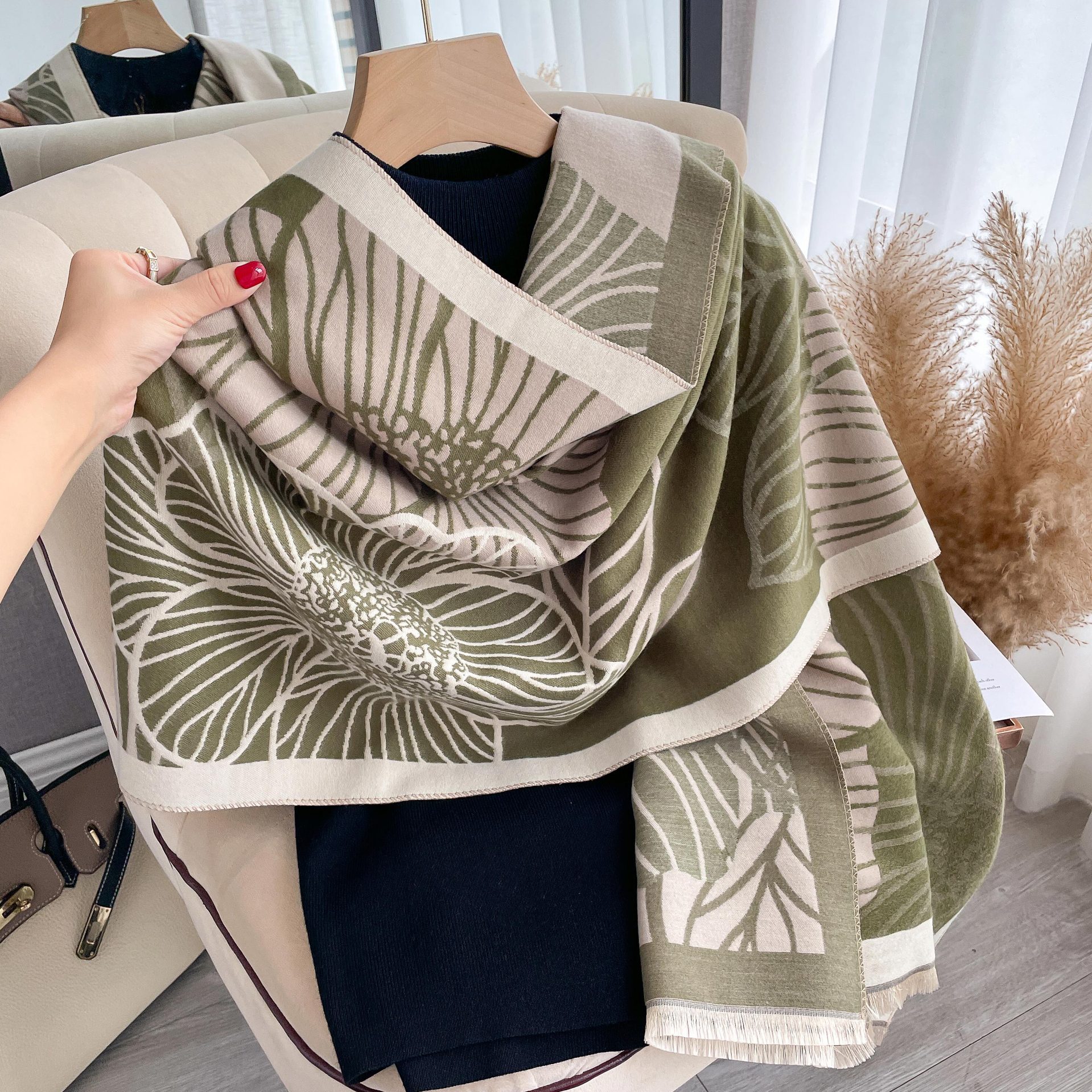 심플하고 우아한 절제 여성의 가을과 겨울 따뜻한 숄 식물 잎 자카드 캐시미어 스카프 따뜻한 목