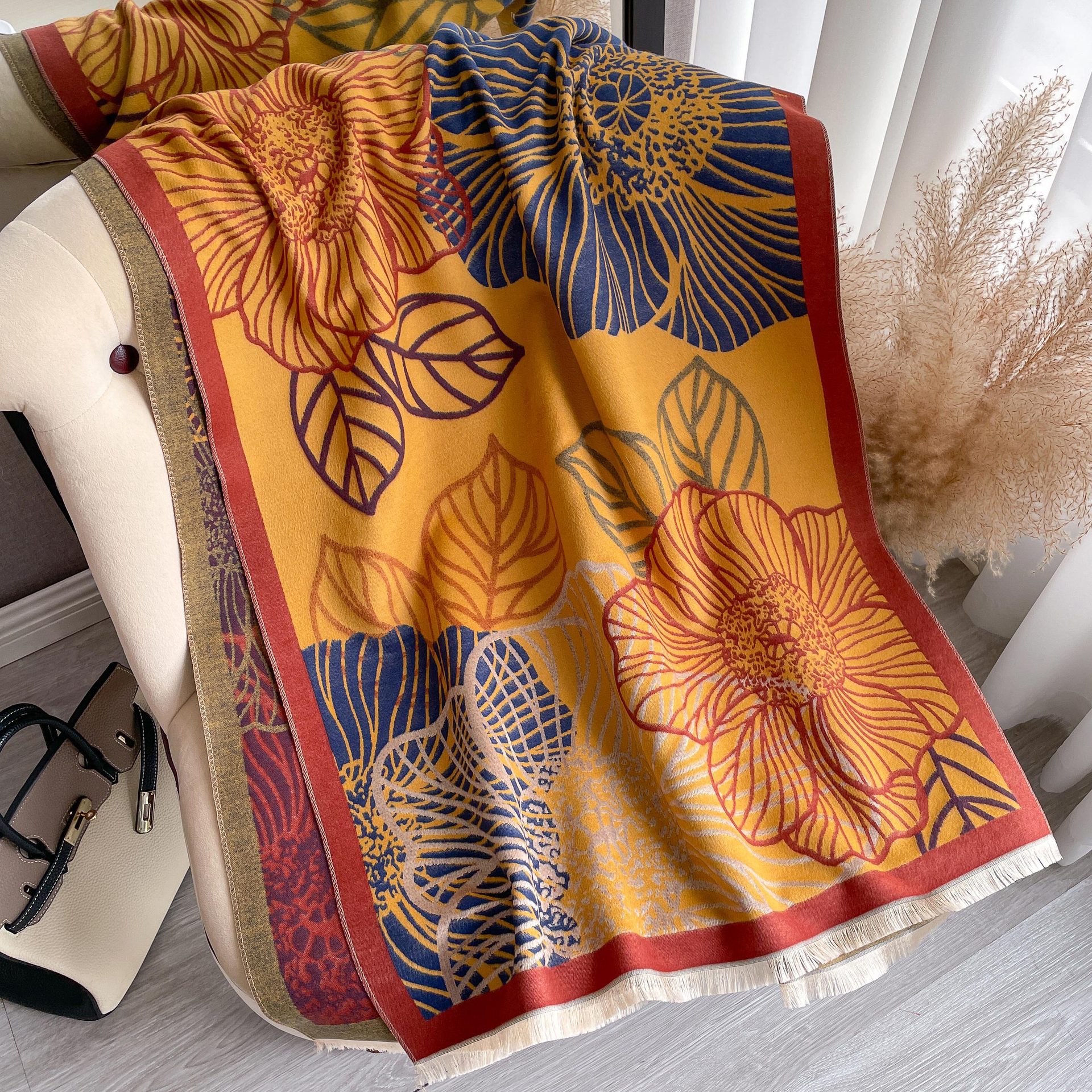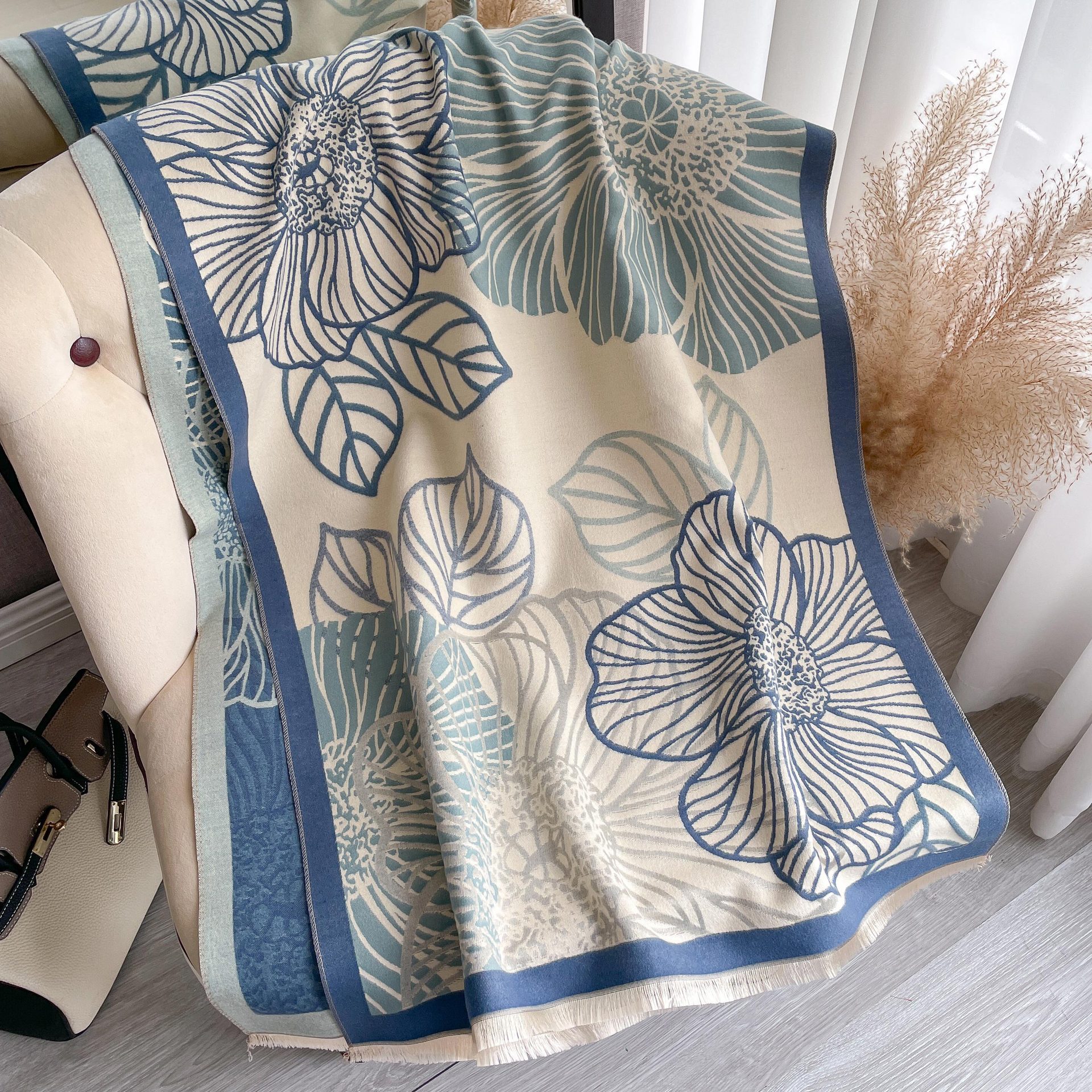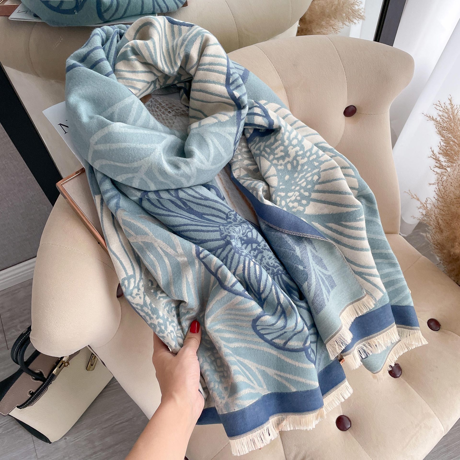 심플하고 우아한 절제 여성의 가을과 겨울 따뜻한 숄 식물 잎 자카드 캐시미어 스카프 따뜻한 목스토어 가기
