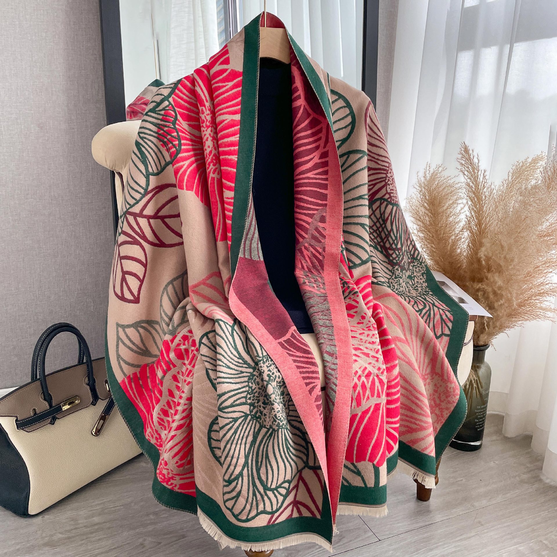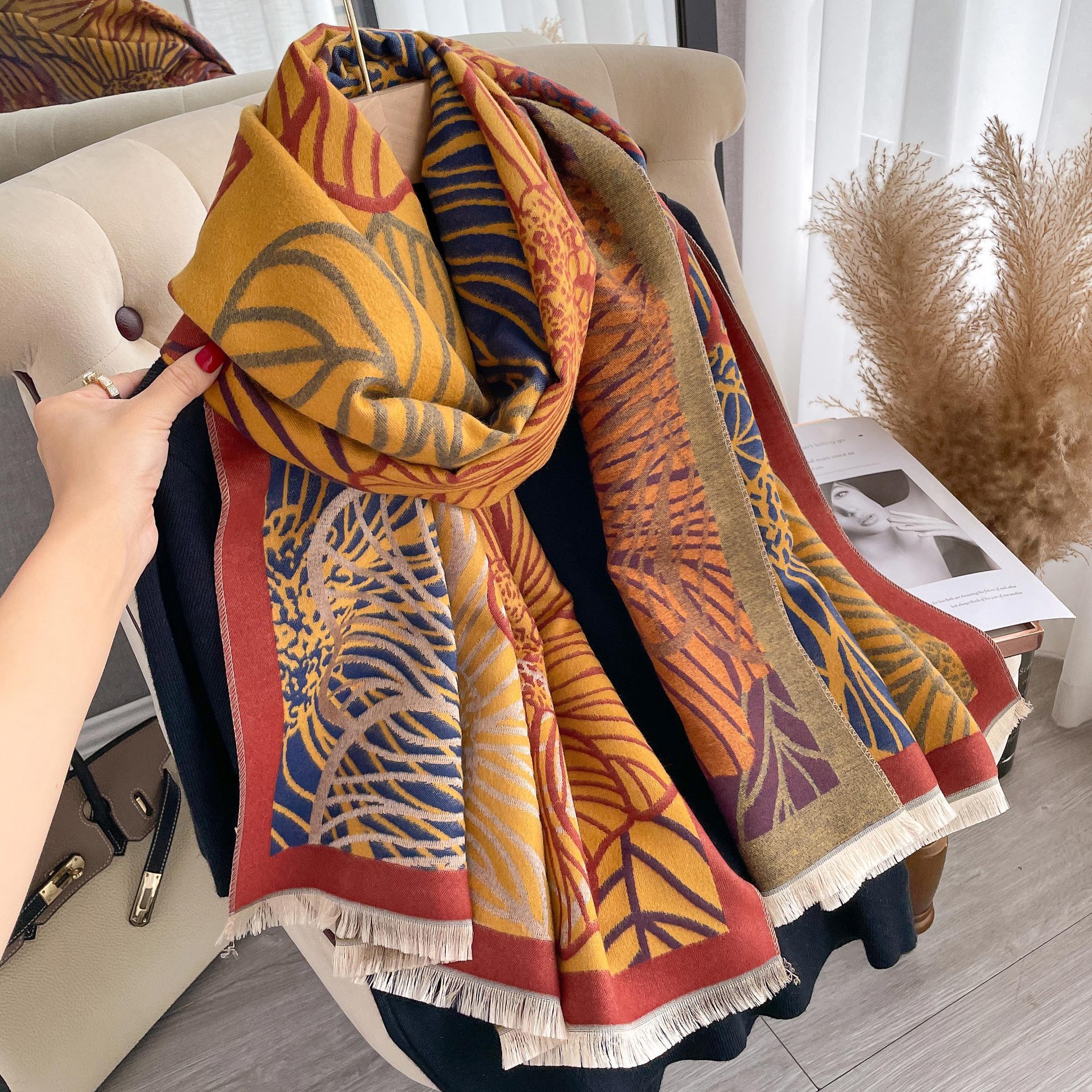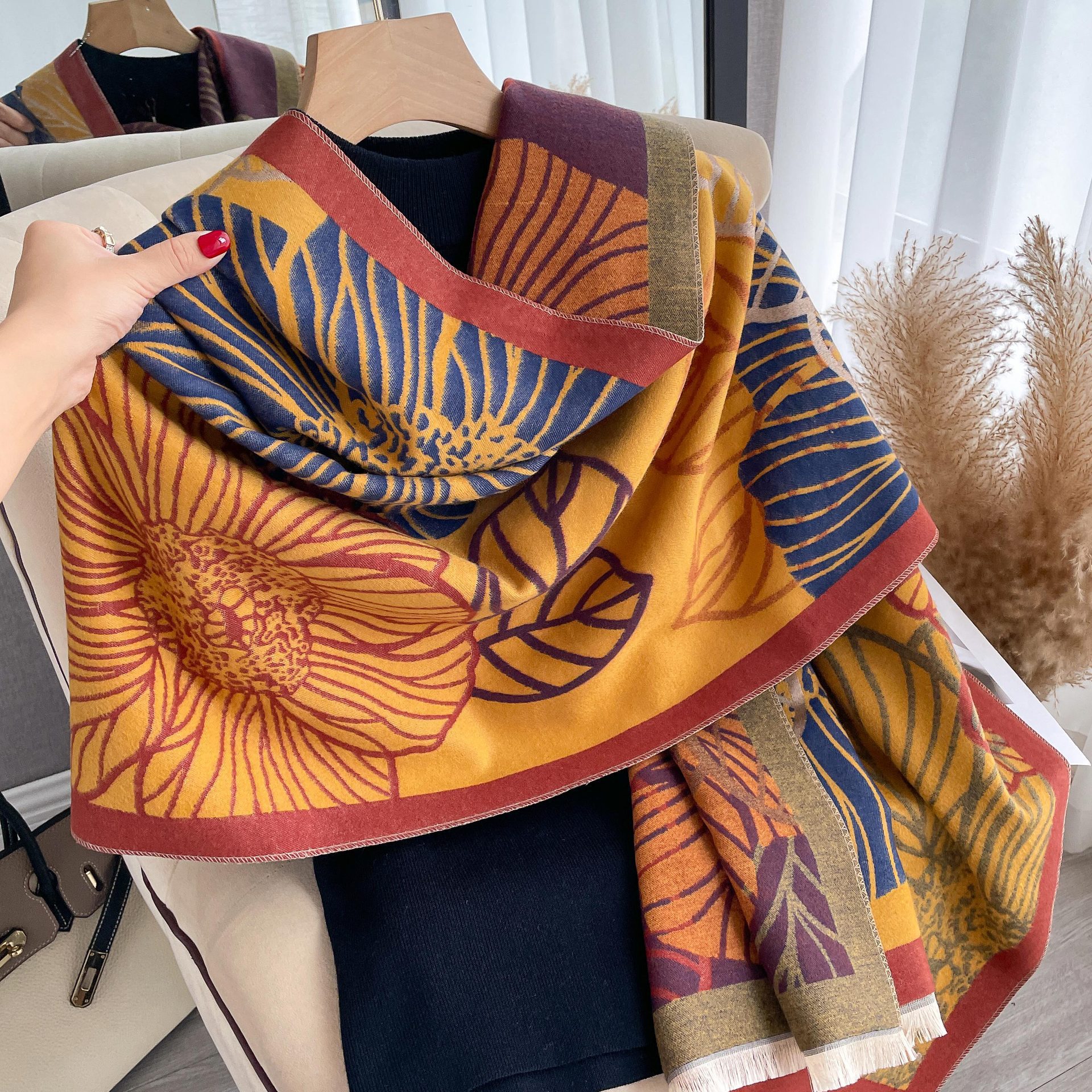 심플하고 우아한 절제 여성의 가을과 겨울 따뜻한 숄 식물 잎 자카드 캐시미어 스카프 따뜻한 목스토어 가기