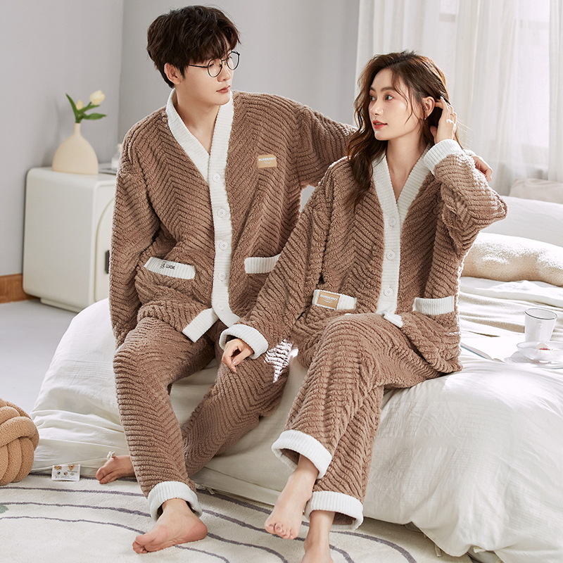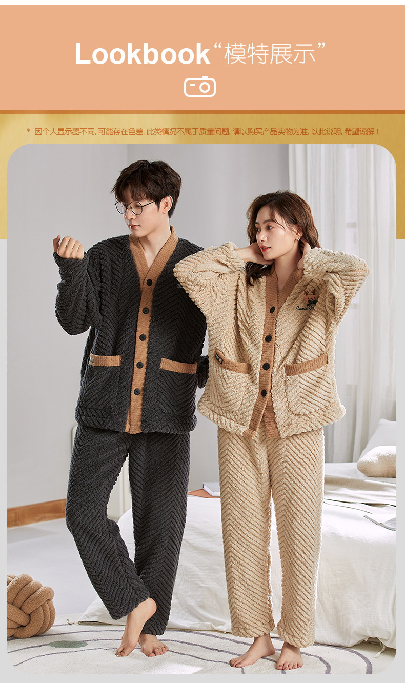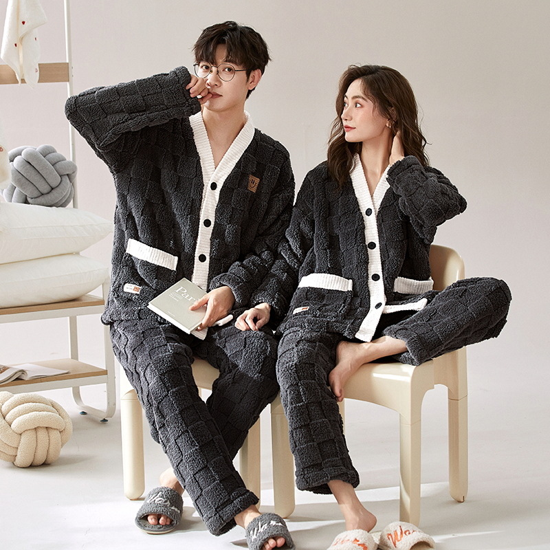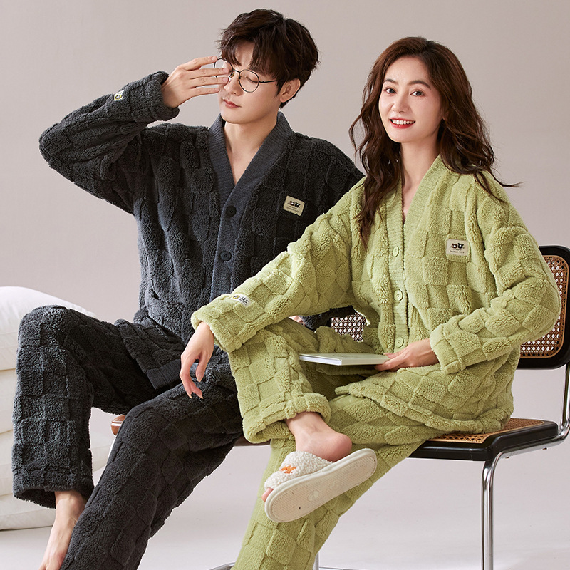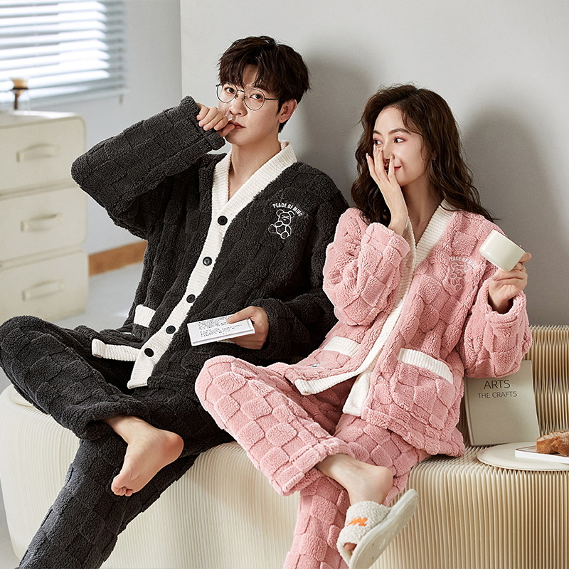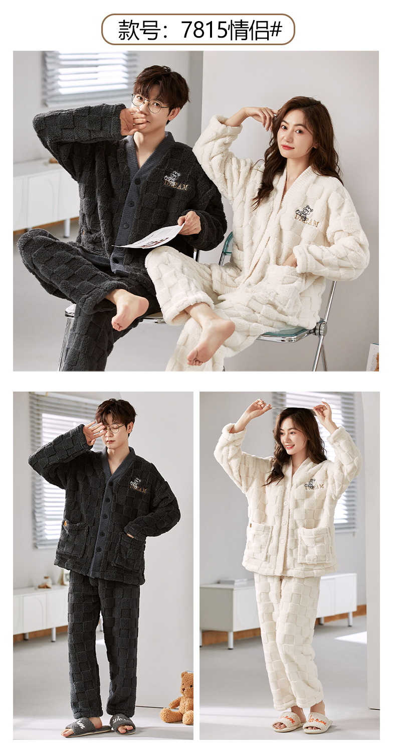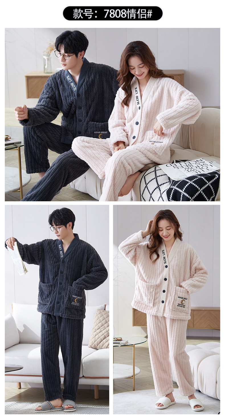 커플 잠옷 가을과 겨울 여자의 산호 양털 긴 소매 기모노 가정 옷 기모 두꺼운 남자의 플란넬 웨어러블 세트