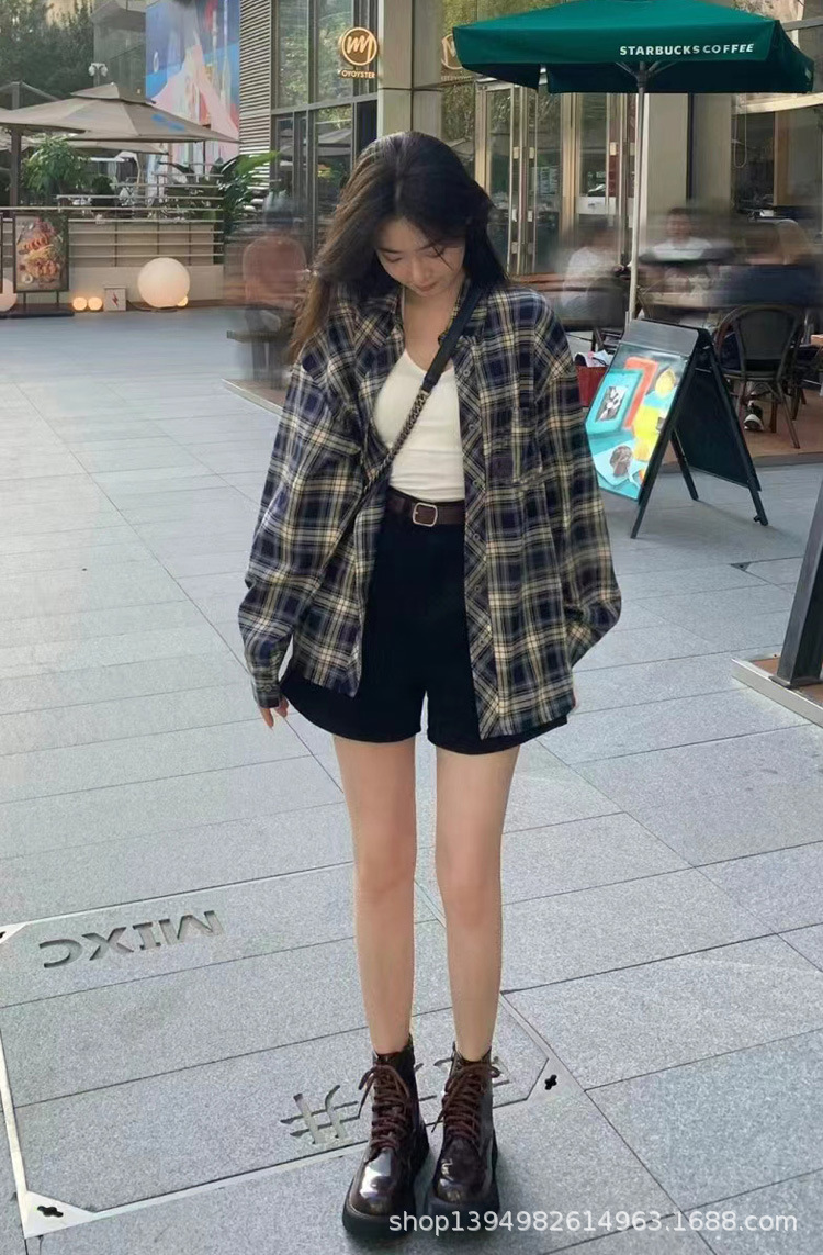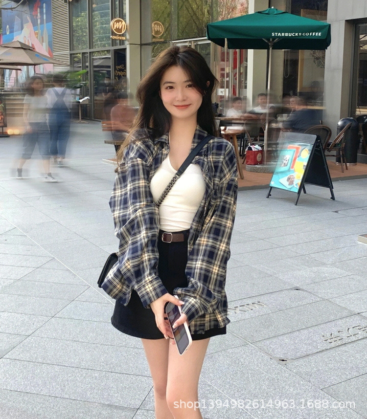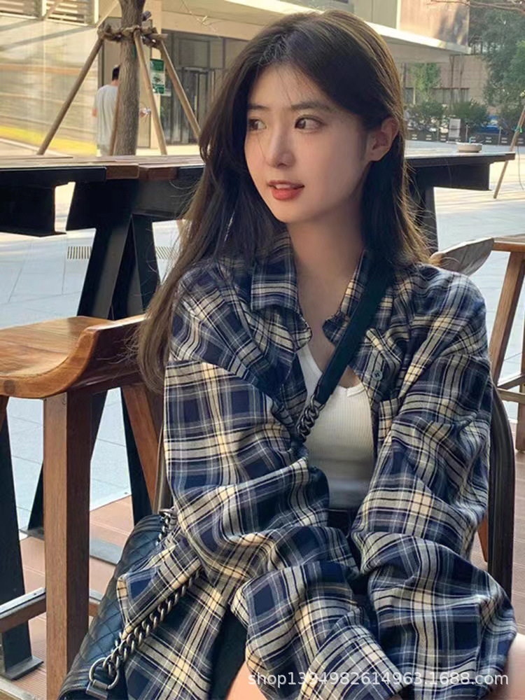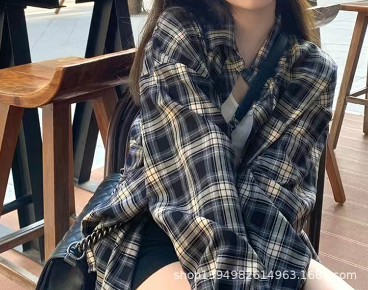 게으른 복고풍 중간 길이 격자 무늬 느슨한 블라우스 모든 매치 캐주얼 얇은 유행 우아한 긴팔 자외선 차단제 코트스토어 가기
