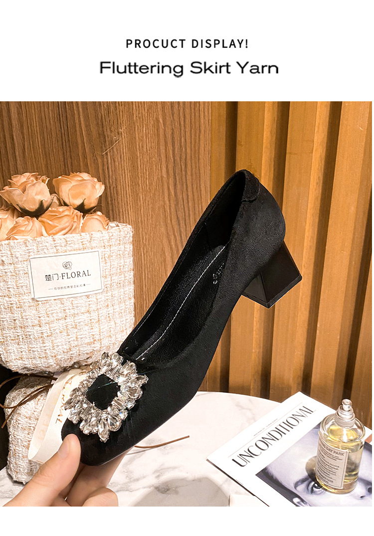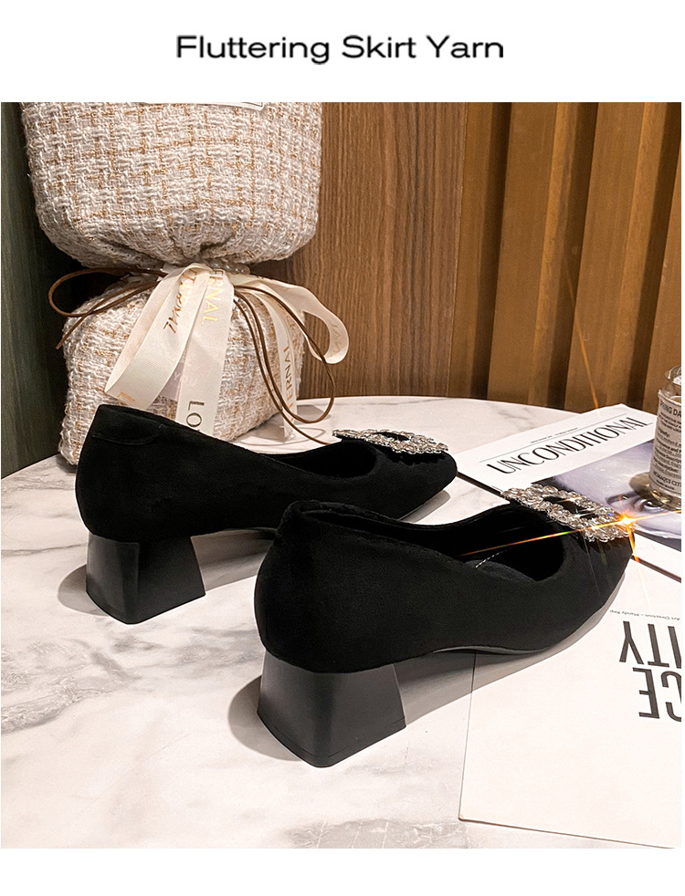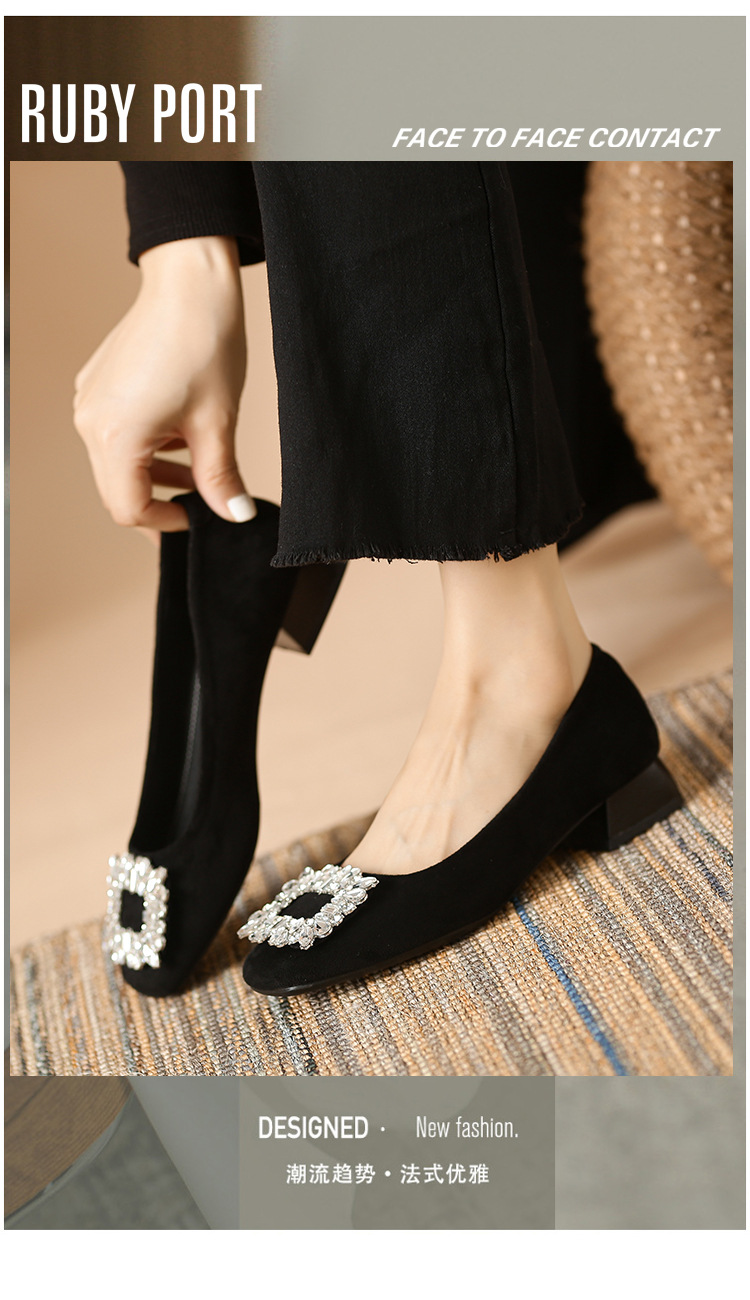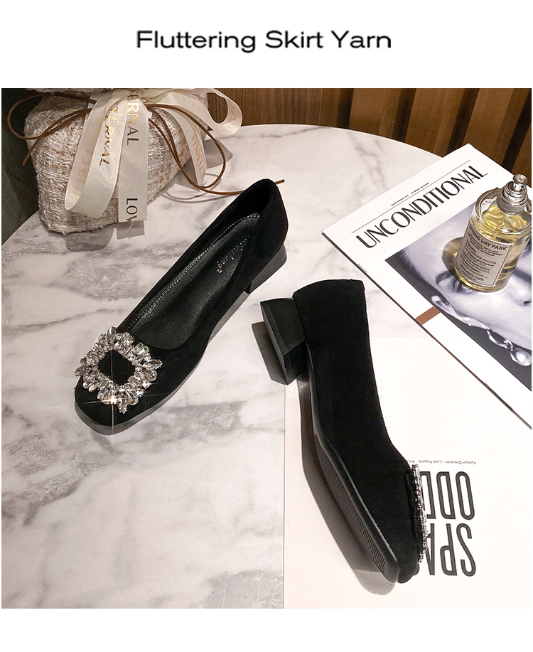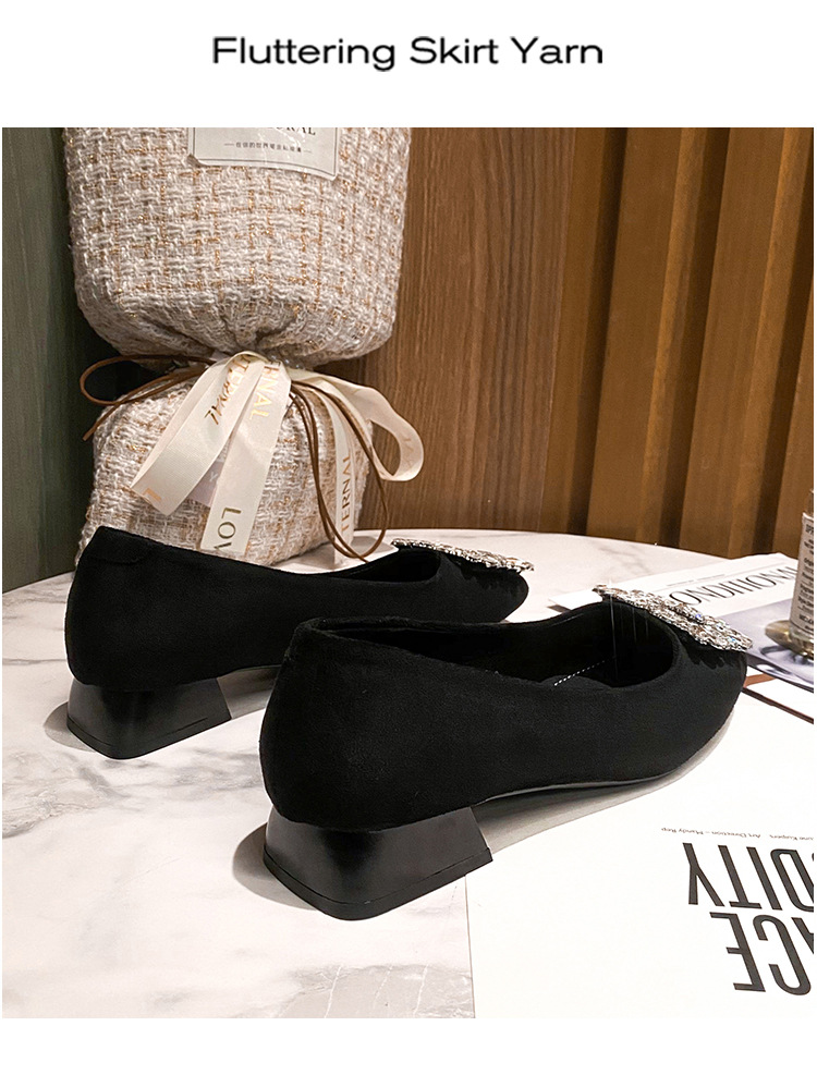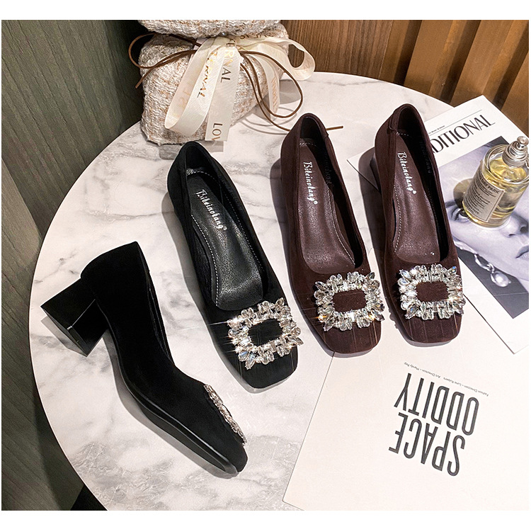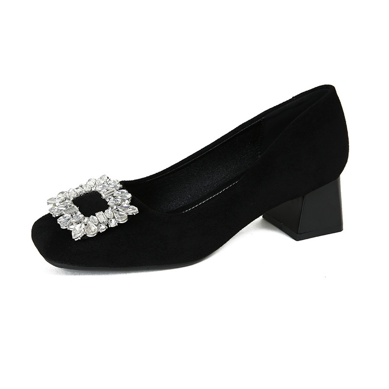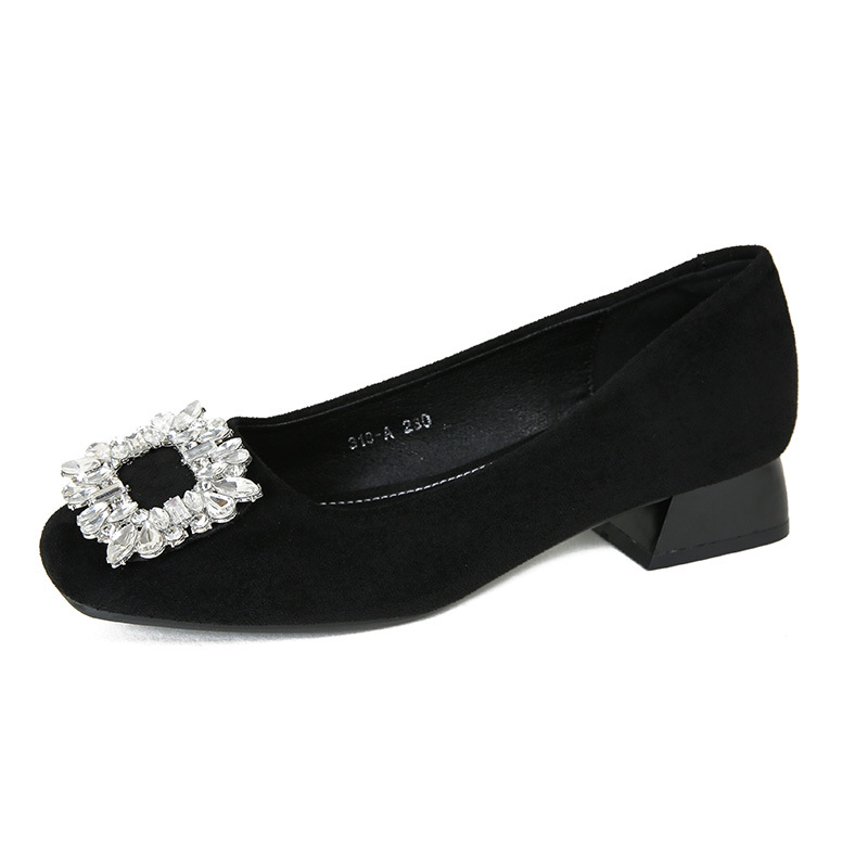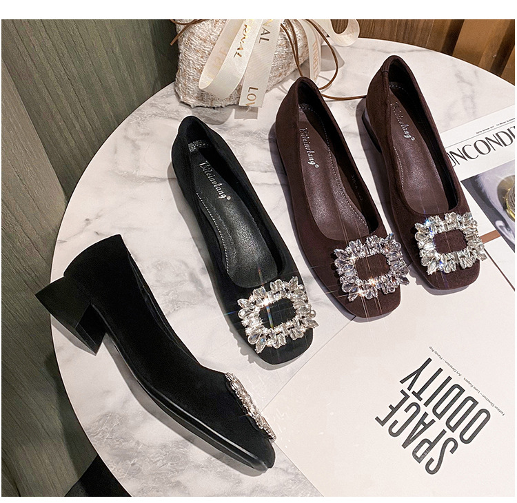 새로운 봄과 가을 스퀘어 헤드 로우 힐 신발 여성 통근 여성 신발 얕은 입 라인 석 스퀘어 버클 피곤하지 않은 발 두꺼운 굽 신발