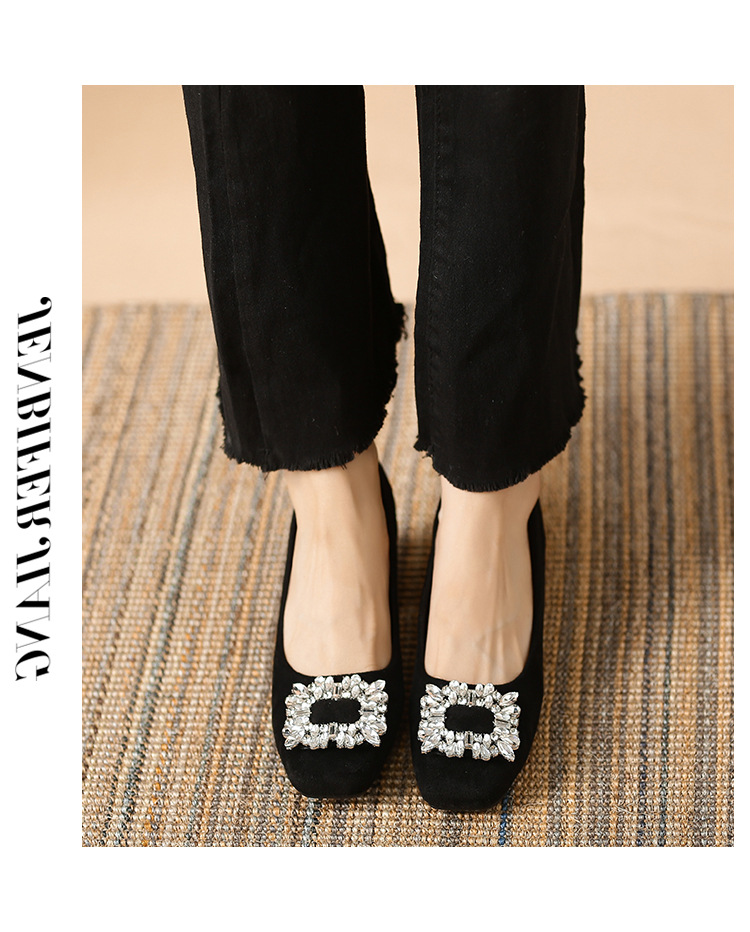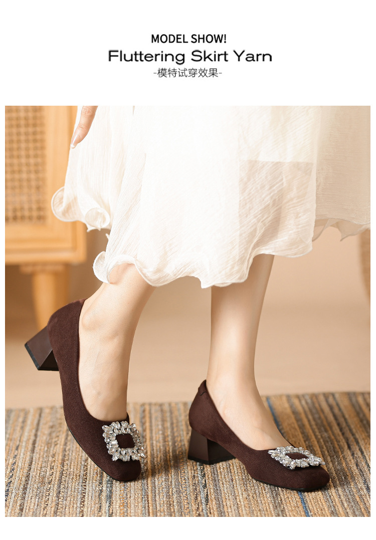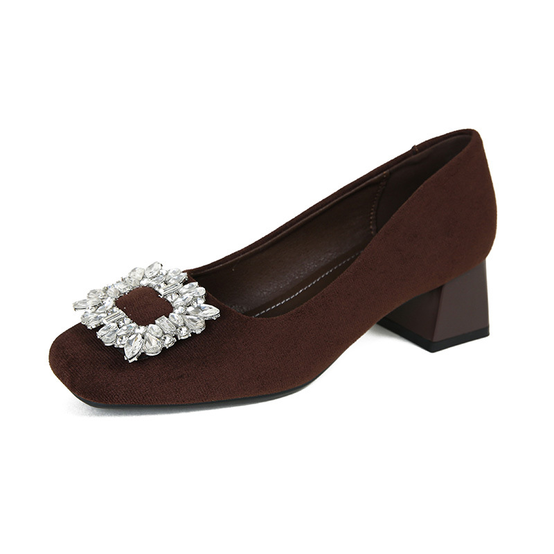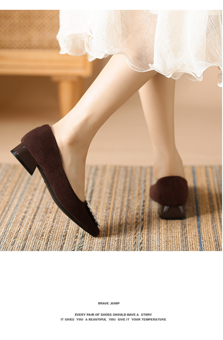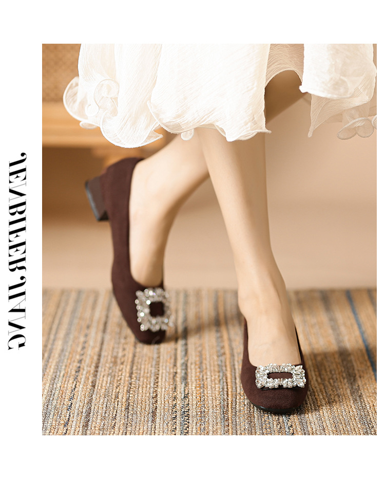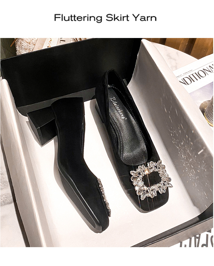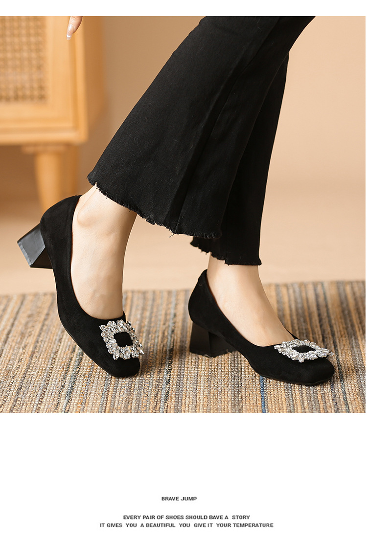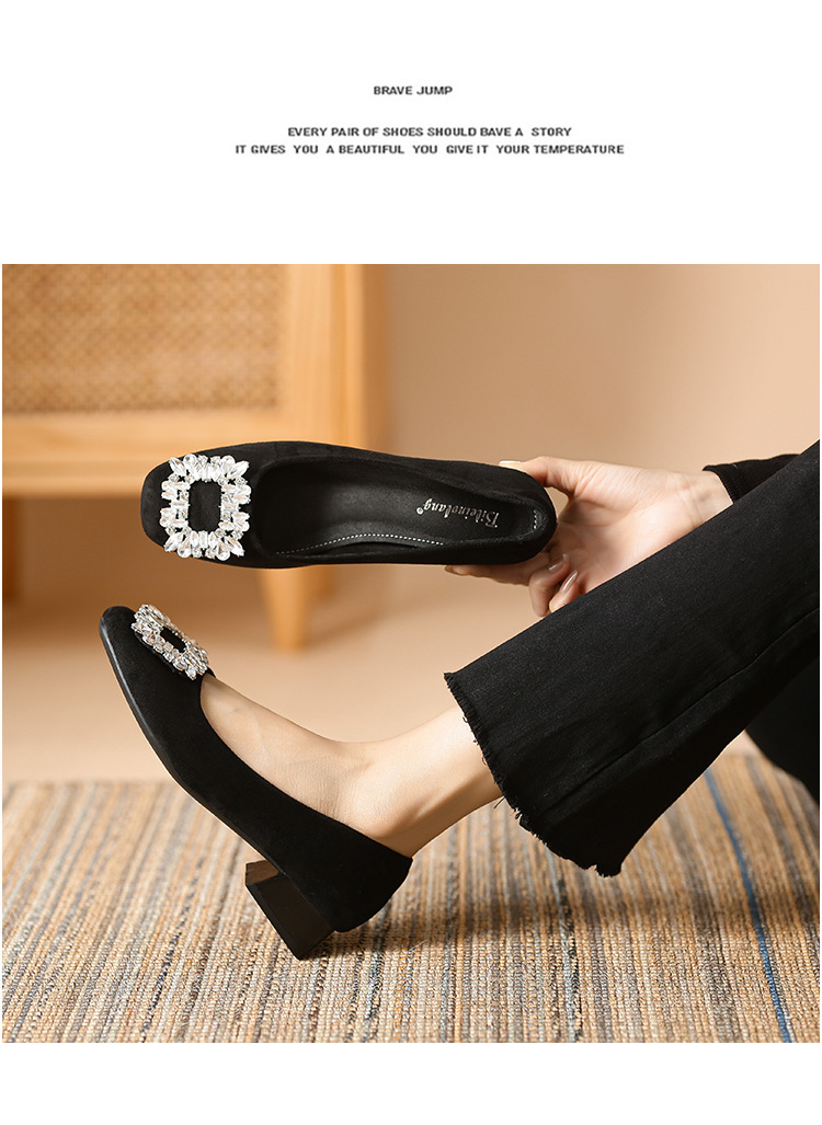새로운 봄과 가을 스퀘어 헤드 로우 힐 신발 여성 통근 여성 신발 얕은 입 라인 석 스퀘어 버클 피곤하지 않은 발 두꺼운 굽 신발