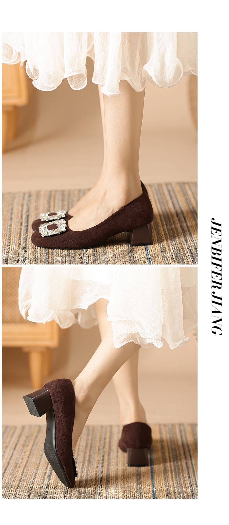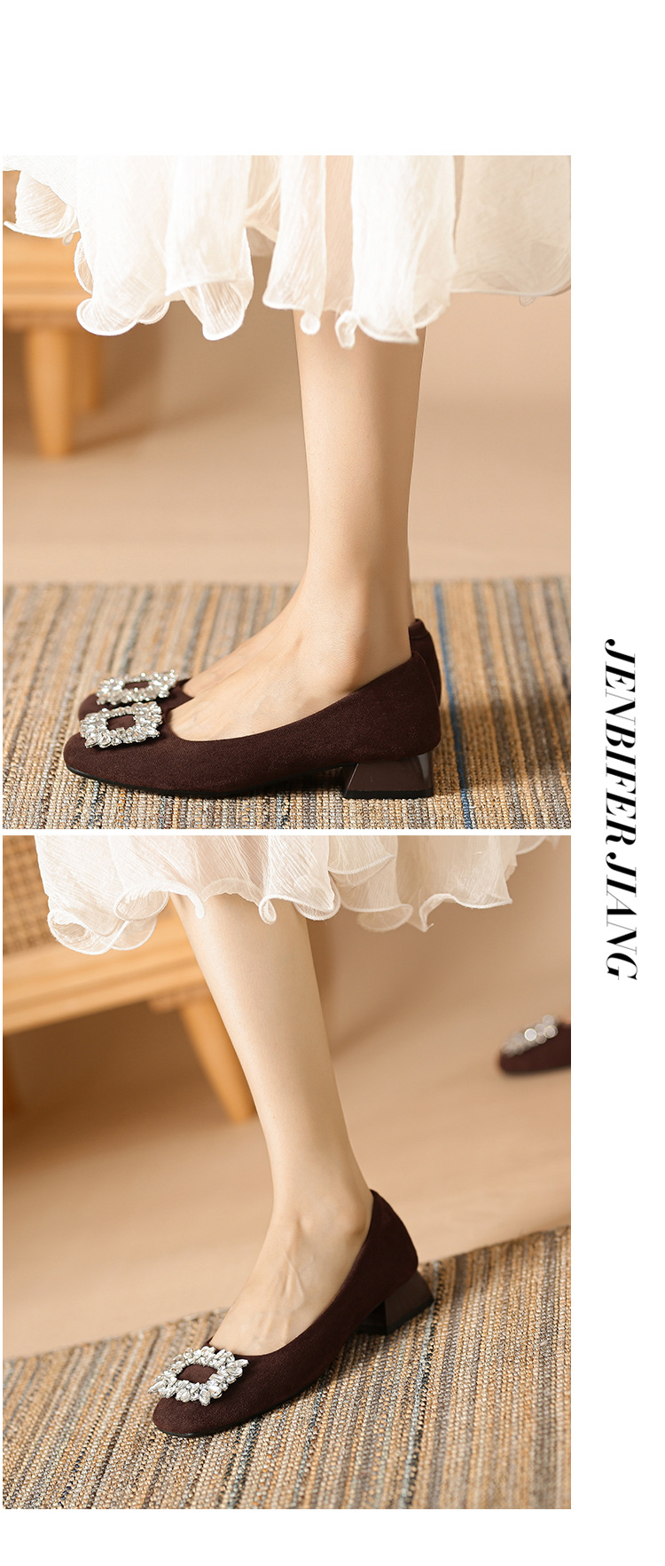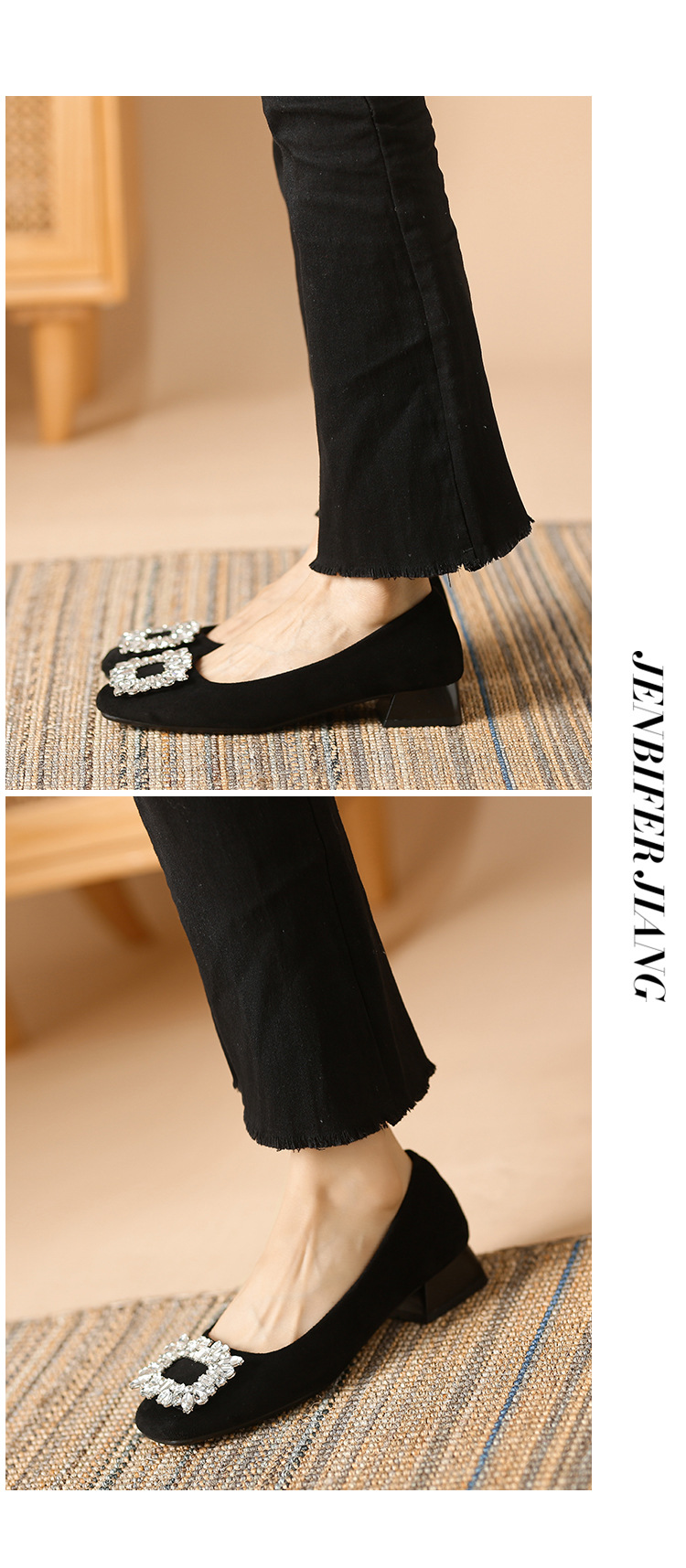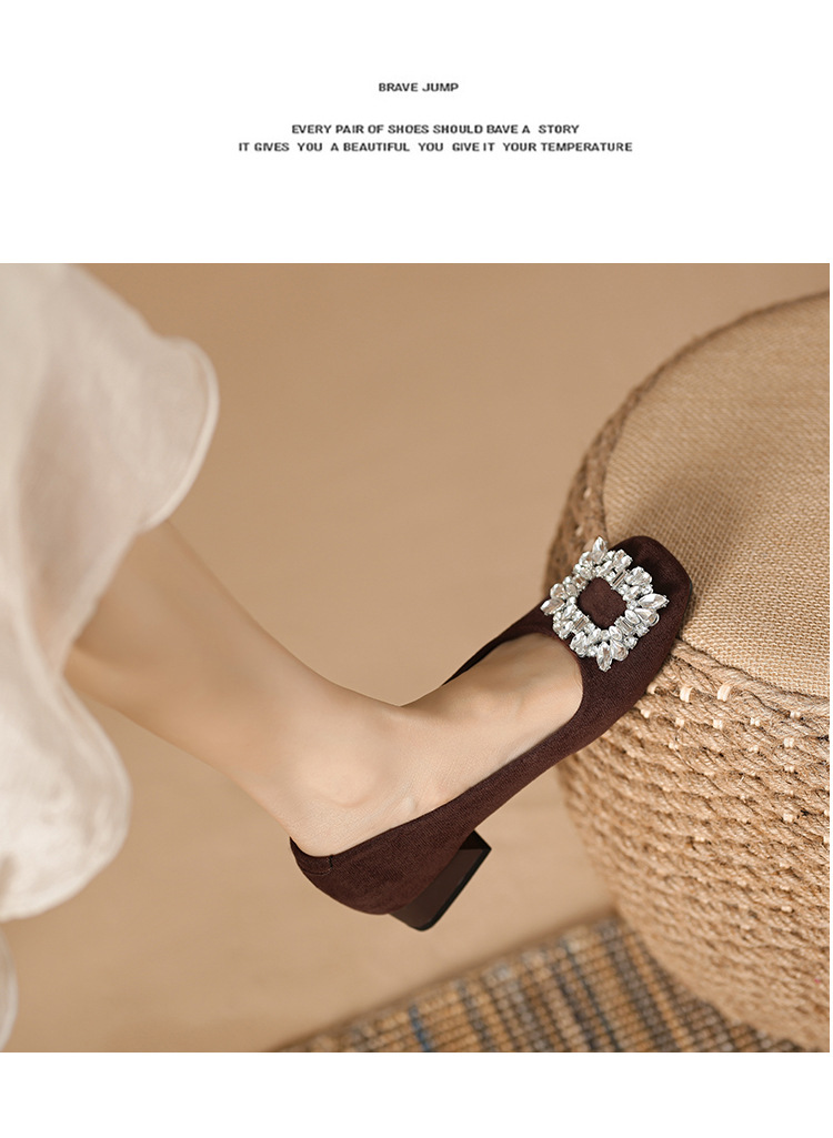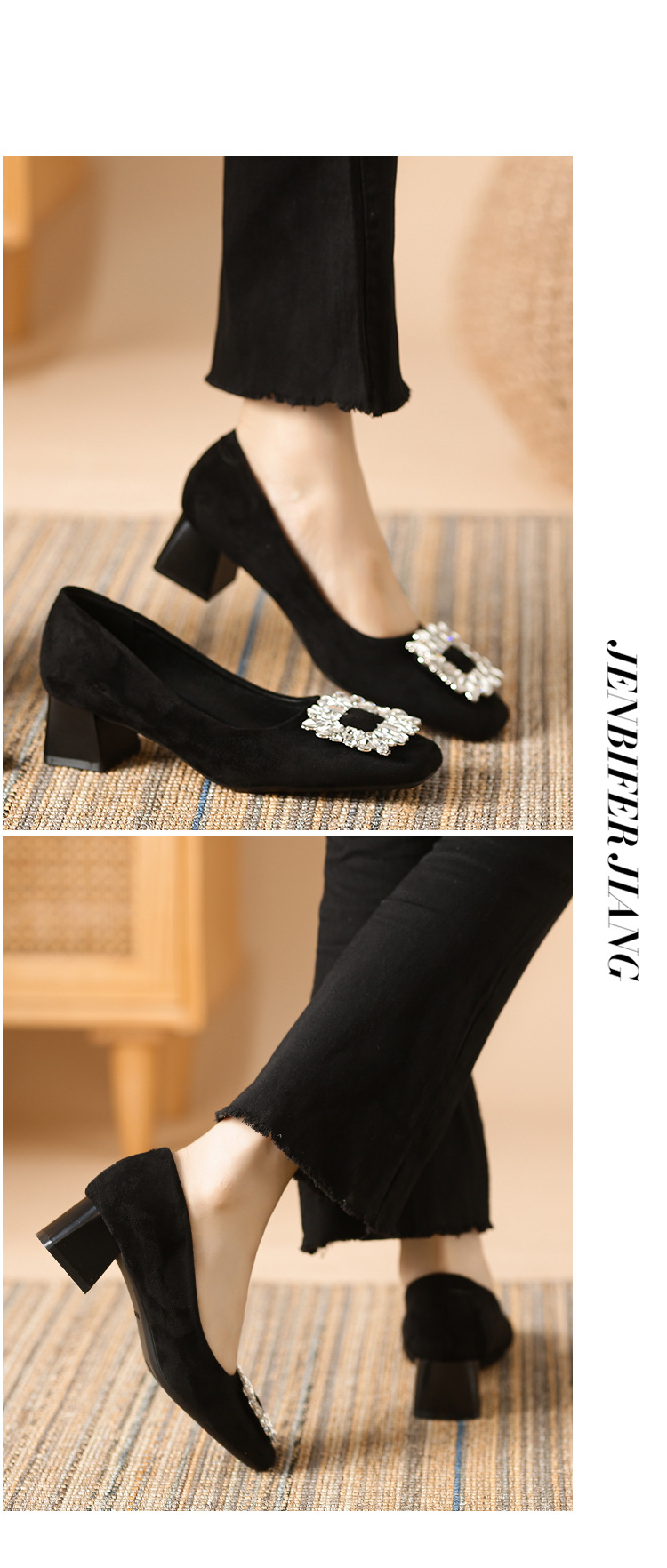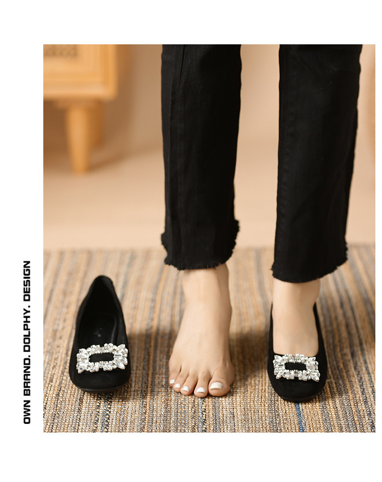 새로운 봄과 가을 스퀘어 헤드 로우 힐 신발 여성 통근 여성 신발 얕은 입 라인 석 스퀘어 버클 피곤하지 않은 발 두꺼운 굽 신발