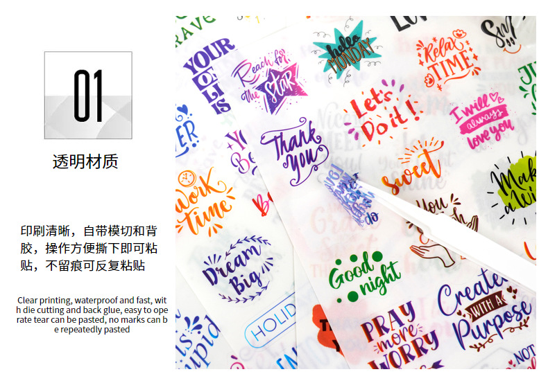 跨境新品文字贴纸单张透明英文鼓励手写名言剪贴簿手账励志贴纸