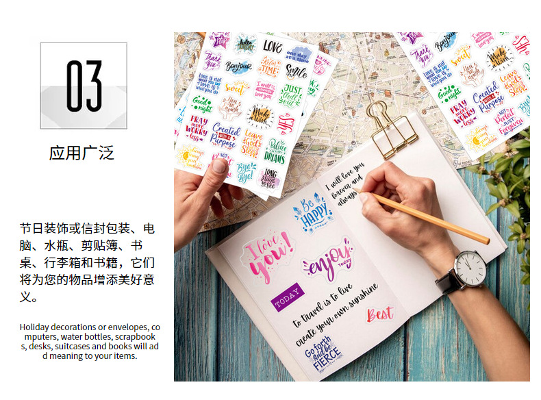应用场景:可贴于水杯,马克杯,信封,信纸,玻璃,汽车,礼盒,袋子,节日礼品,贺卡,生日派对,剪贴簿,计划册,笔记本,日记本,日历索引等任何光滑表面。