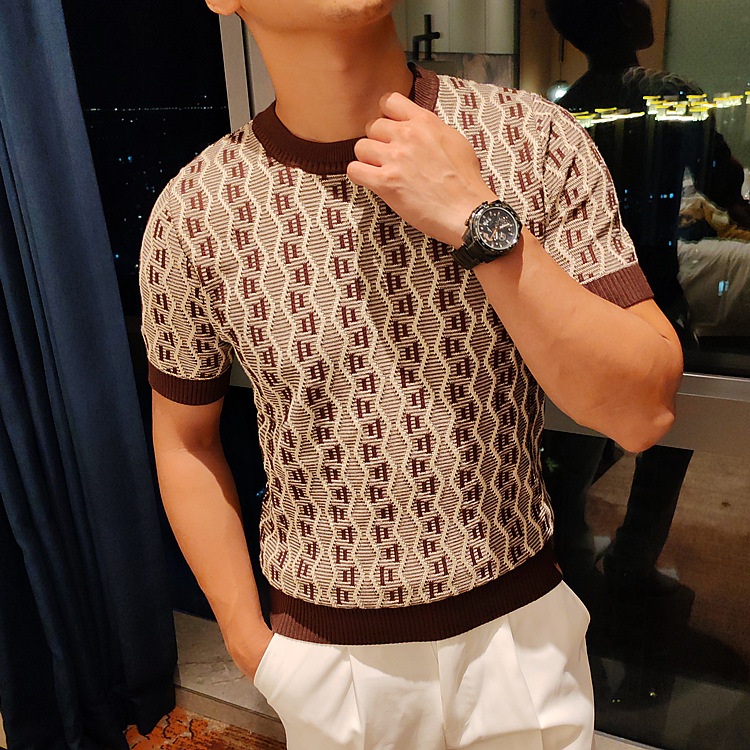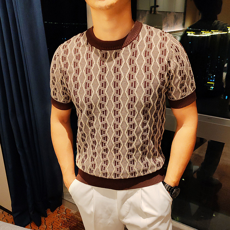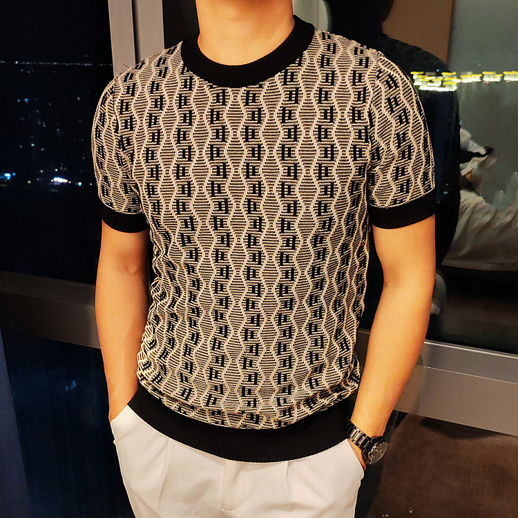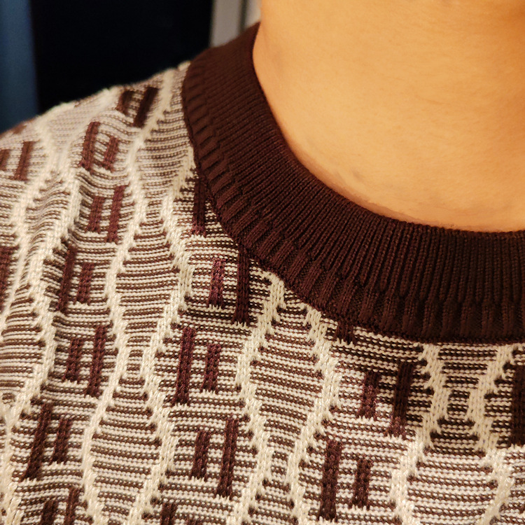 유럽 역 가을과 겨울 새로운 반팔 스웨터 남성용 슬림핏 크루넥 스웨터 자카드 두꺼운 남성용 유행 베이스 셔츠