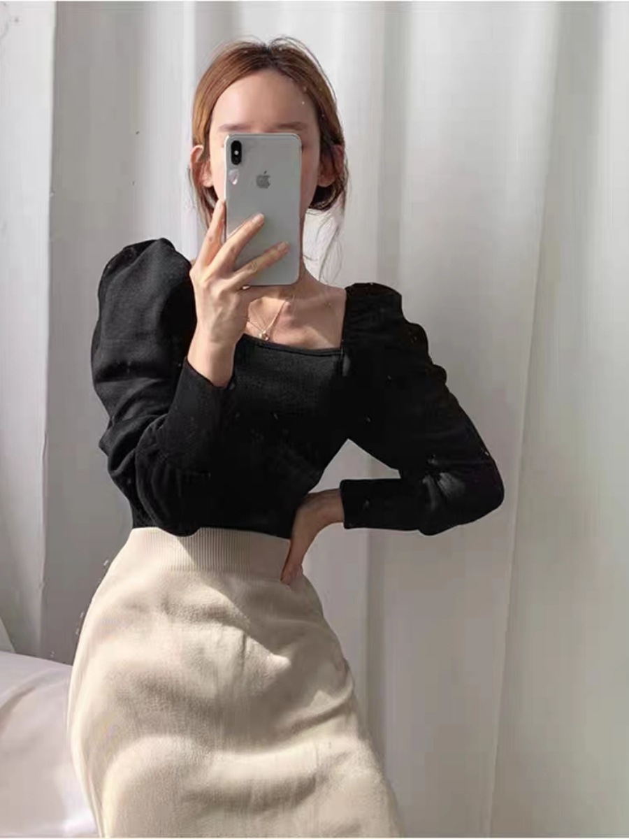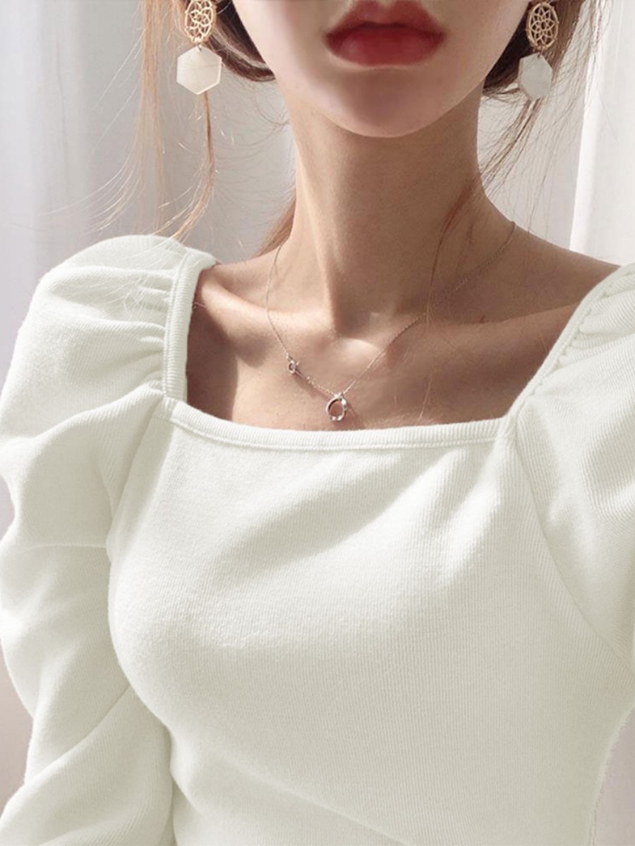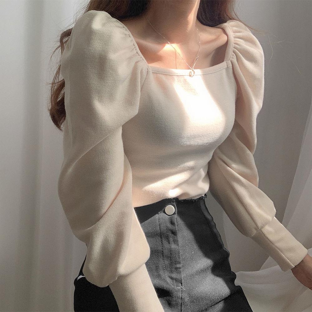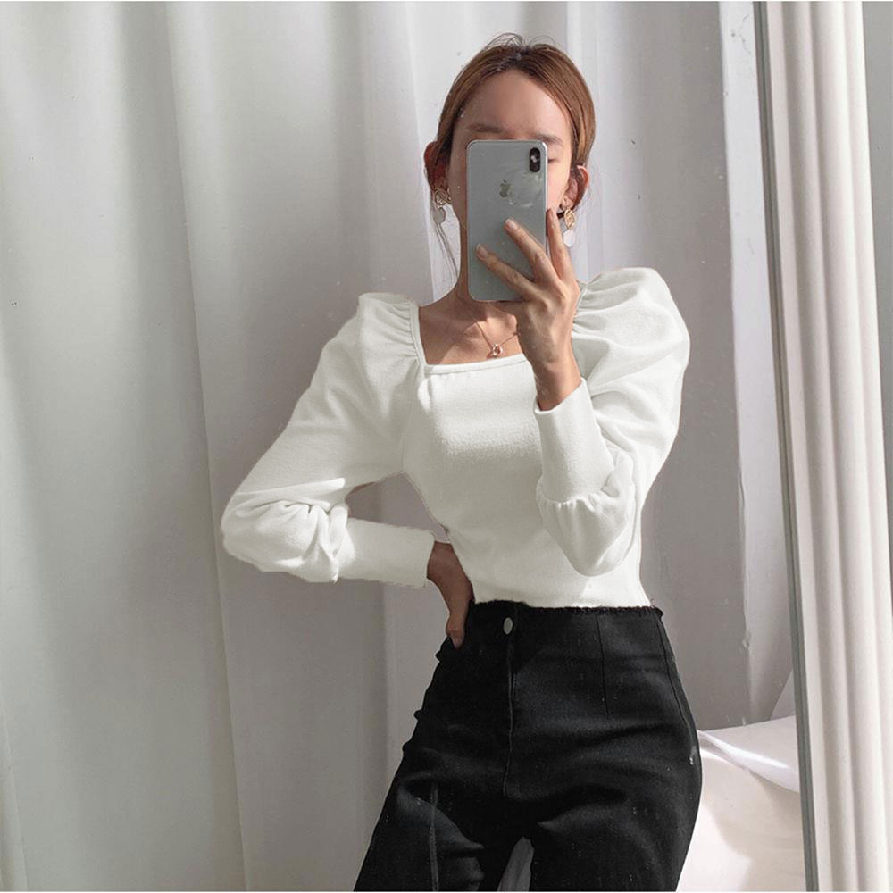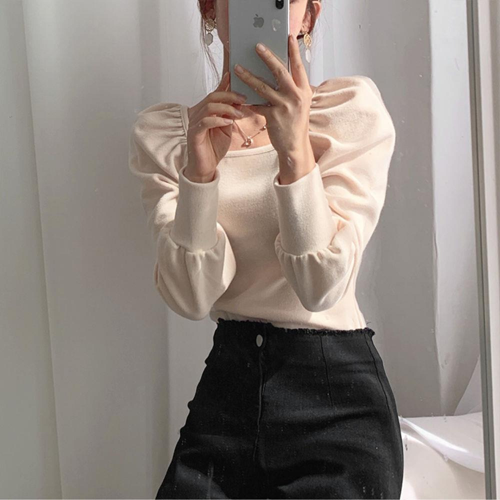 가을과 겨울 스퀘어 칼라 새는 쇄골 슬림핏 슬리밍 버블 슬리브 벨벳 짧은 긴팔 티셔츠 여성 탑스토어 가기