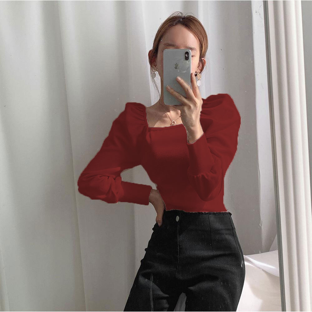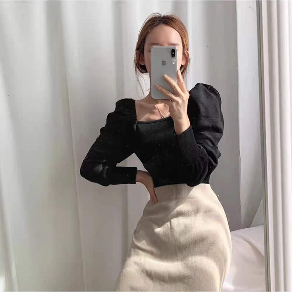 가을과 겨울 스퀘어 칼라 새는 쇄골 슬림핏 슬리밍 버블 슬리브 벨벳 짧은 긴팔 티셔츠 여성 탑