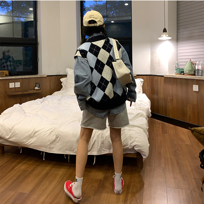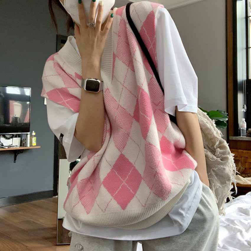 투톤 마름모 조끼 2025 한국 대학 스타일 루즈한 격자 무늬 니트 조끼 여성용 가을 레이어드 탑스토어 가기