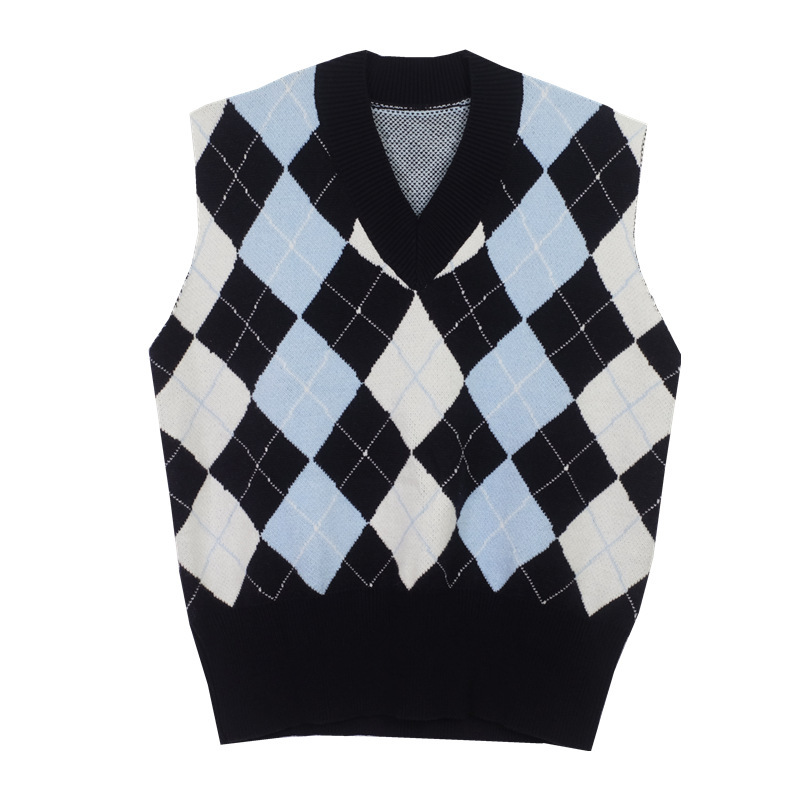 투톤 마름모 조끼 2025 한국 대학 스타일 루즈한 격자 무늬 니트 조끼 여성용 가을 레이어드 탑