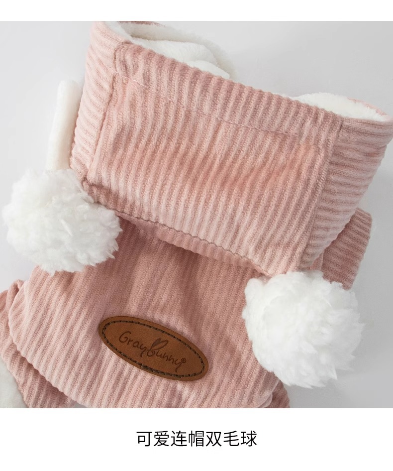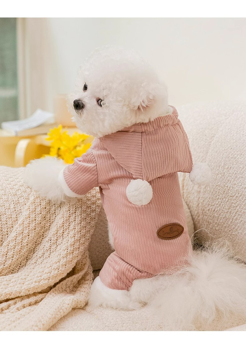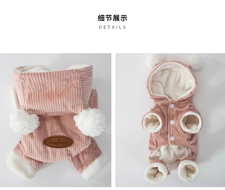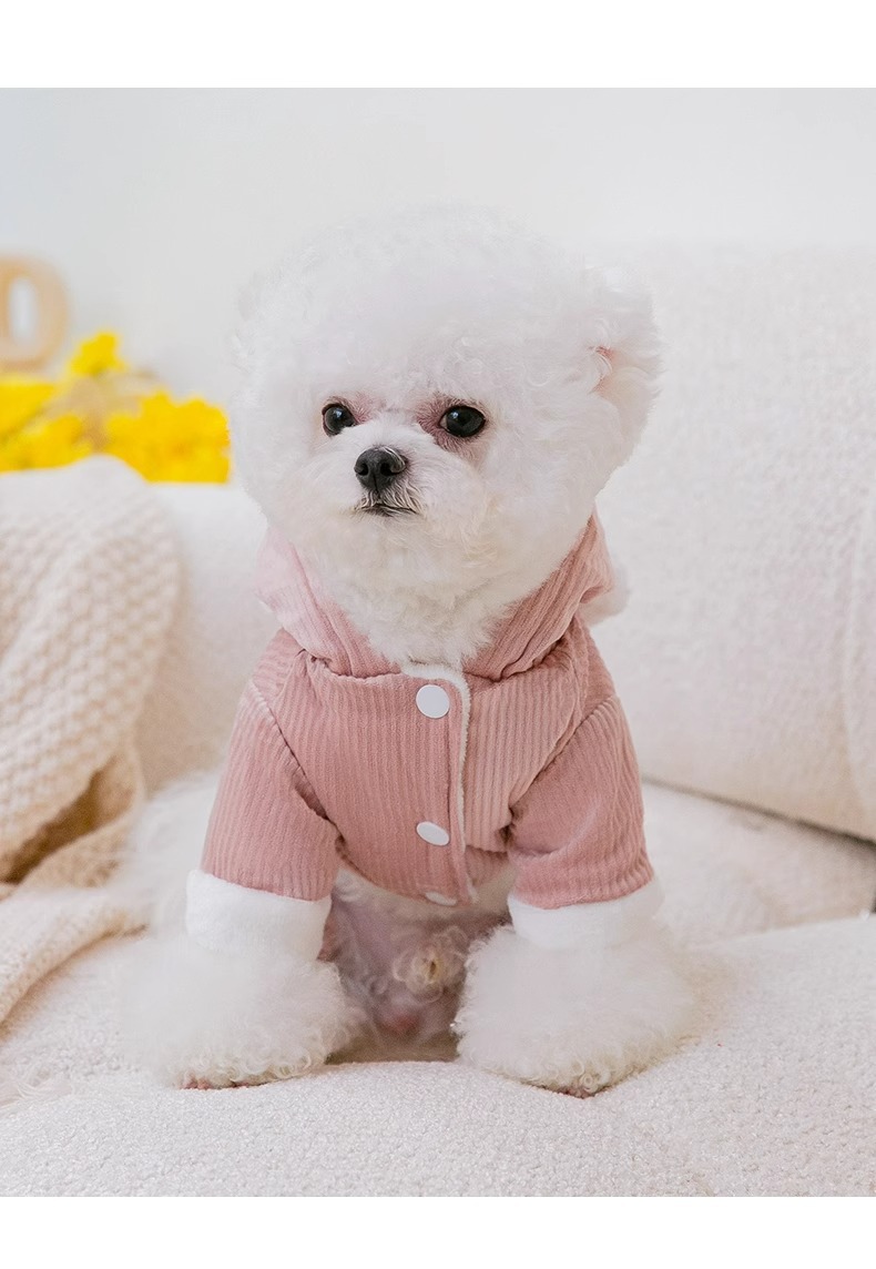 핑크 더블 모피 공 가죽 라벨 코듀로이 두건면 패딩 코트 두꺼운 발 봄과 가을 애완견 개 옷 도매