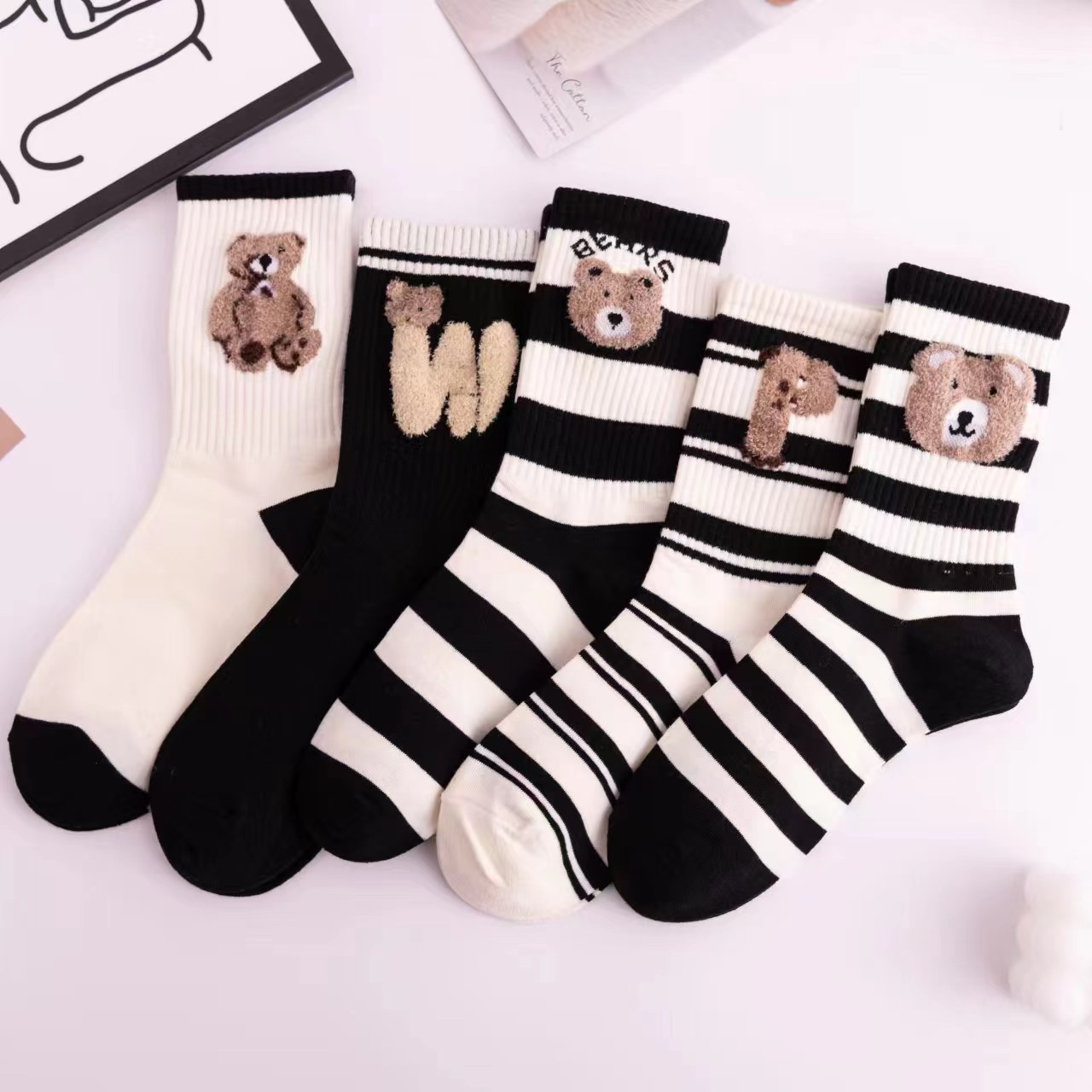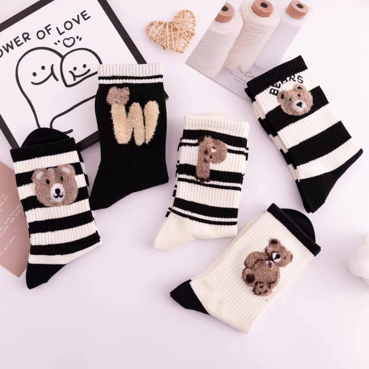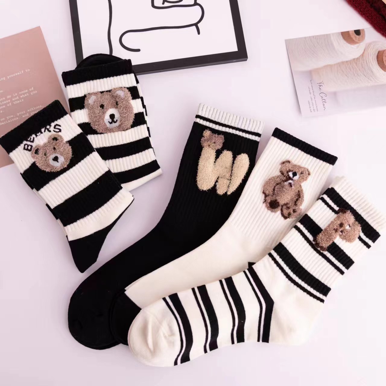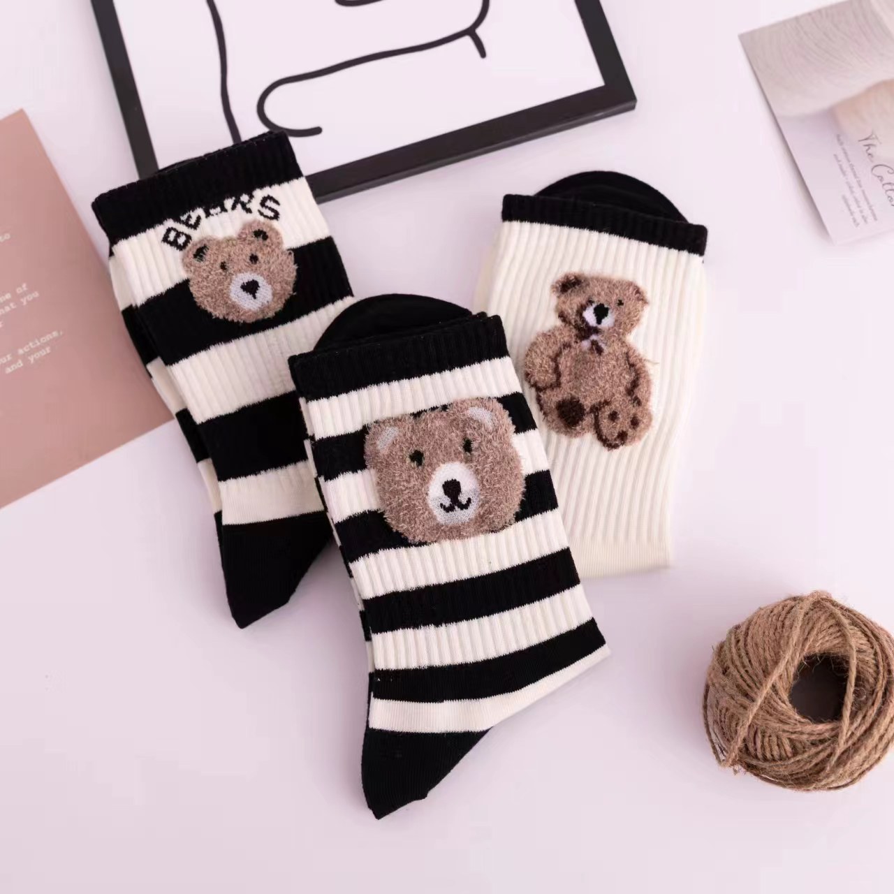 따뜻한 양말 여성용 가을과 겨울 새로운 여성용 양말 긴 입체 봉제 곰 흰색 양말 머리를위한 한국 줄무늬 양말스토어 가기