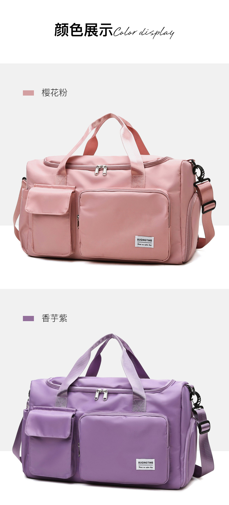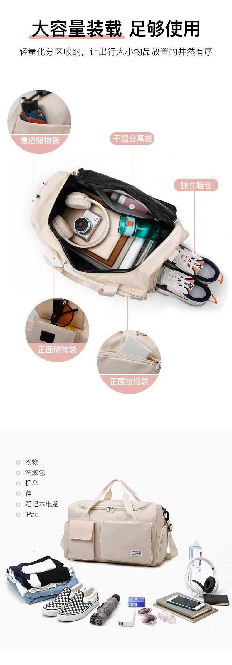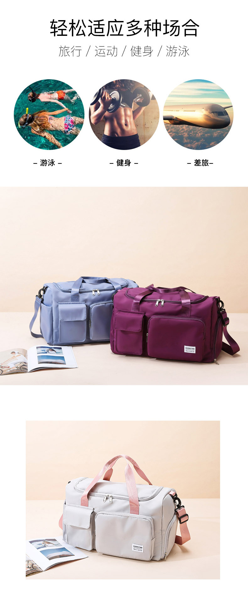 대용량 여행 가방 여성용 캐주얼 스포츠 휴대용 요가 피트니스 가방 건식 및 습식 분리 신발 수납칸 포함 수하물 가방으로도 사용 가능스토어 가기