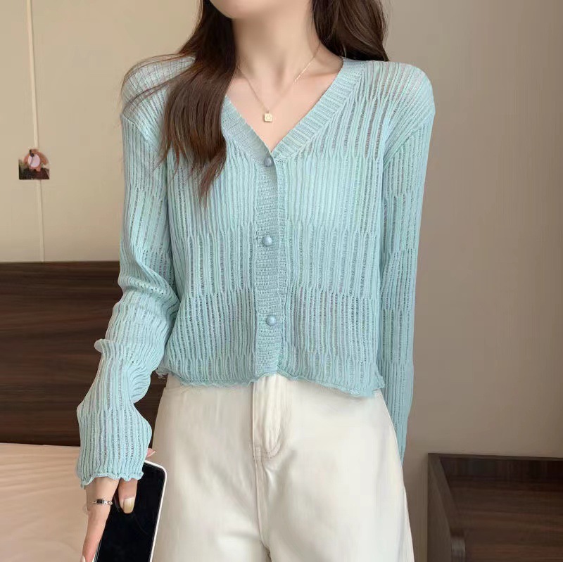얇은 나무 귀 V 넥 스웨터 여성의 가을 흰색 코트 긴 소매 선 스크린 카디건 슬리밍 짧은 바깥 쪽 상단