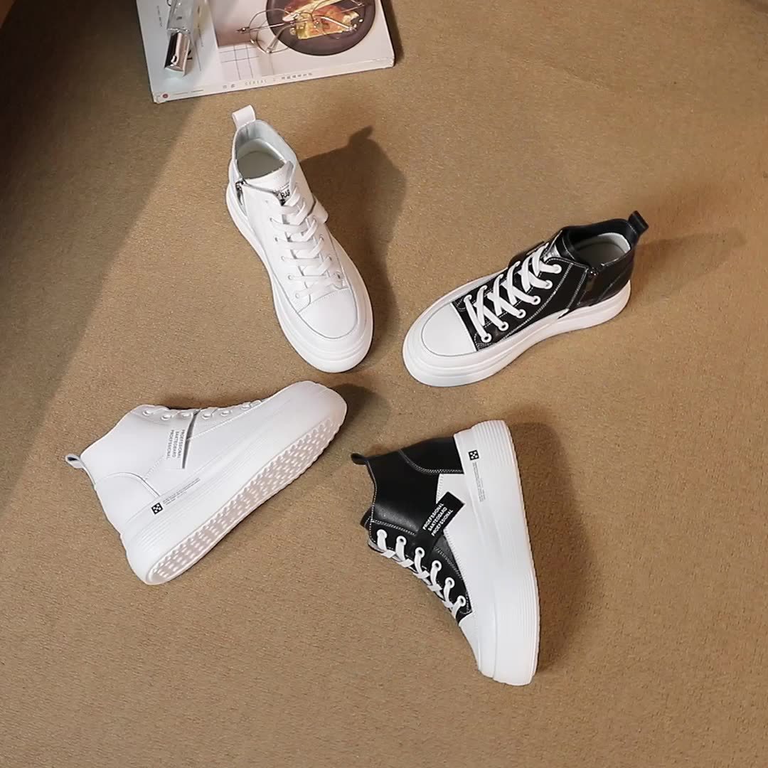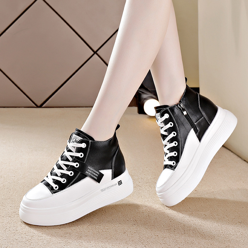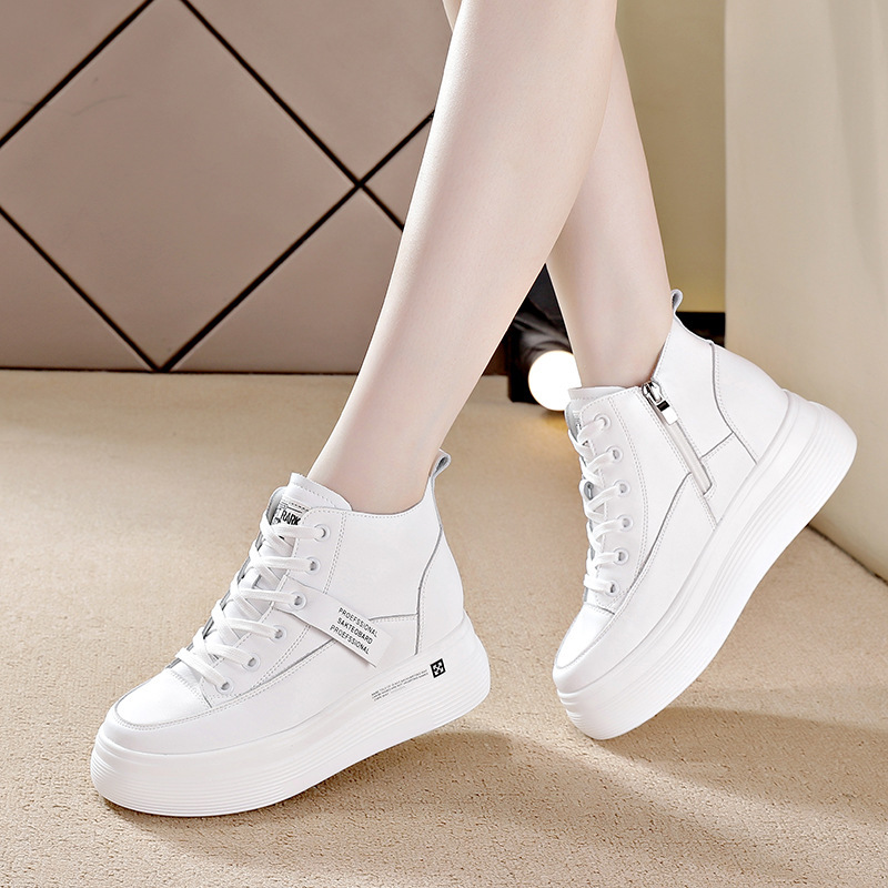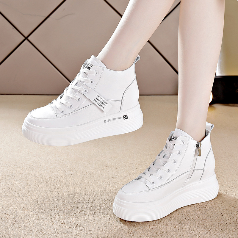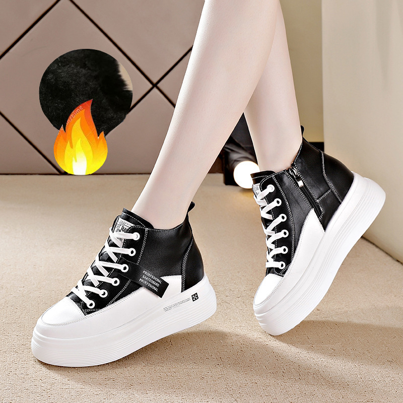 2023 새로운 리얼 소가죽 8cm 높이 증가 두꺼운 바닥 미끄럼 방지 흰색 신발 여성용 기모 캐주얼 하이탑 신발 여성용 겨울스토어 가기