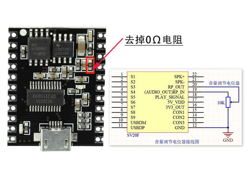 可以通过外接电位器调节音量大小;去掉0Ω电阻,在引脚RP_IN,RP_OUT处接入电位器