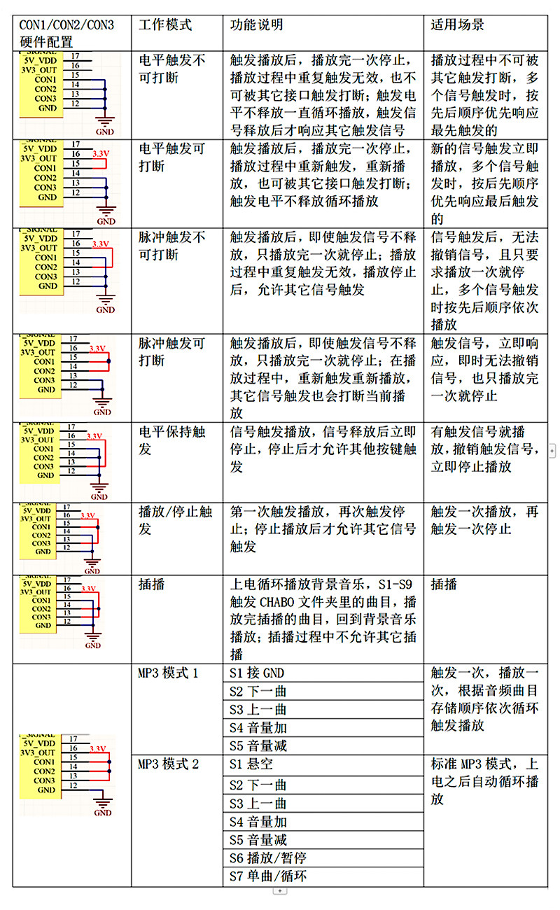 DY-SV20F是一款一对一分段触发控制播放器,支持MP3,WAV解码格式;可分段触发9首曲目;低电平触发;3.7-5VDC宽电压供电,直驱4-8Ω喇叭,最大输出功率5W;板载32Mbit(4MByte)flash存储,通过USB数据线连接电脑更换音频文件;支持外部接音量电位器调节音量大小,可设置8种触发工作模式,适合众多场景应用
