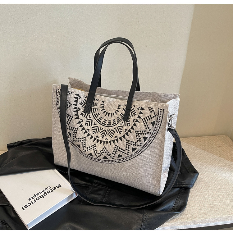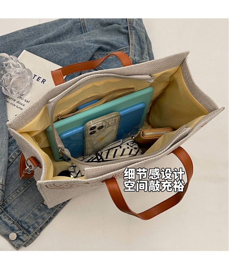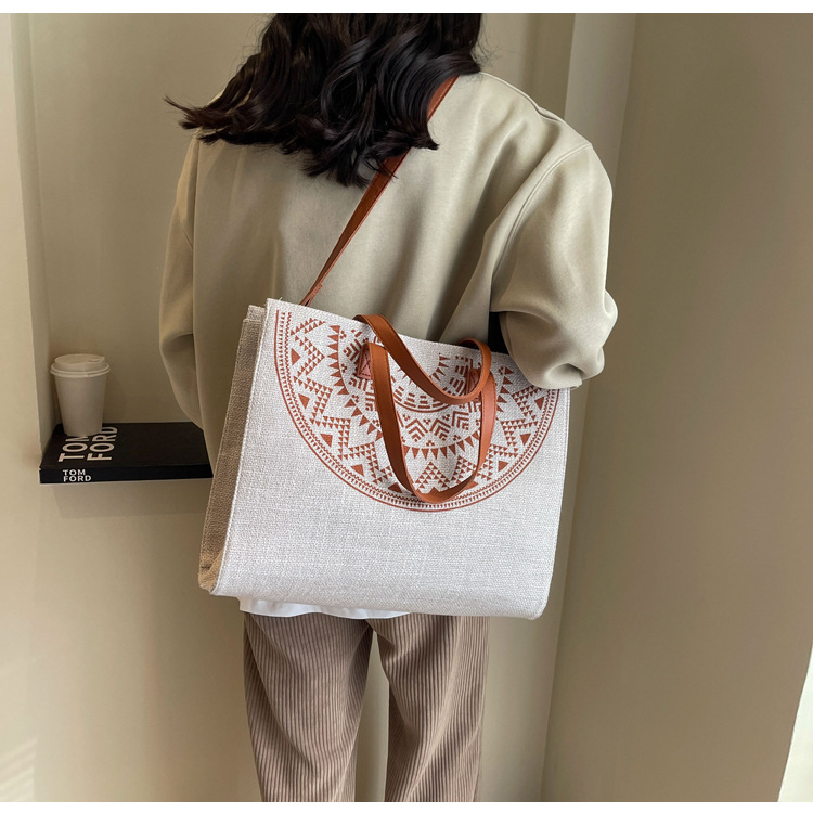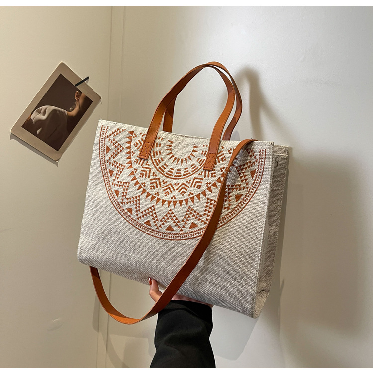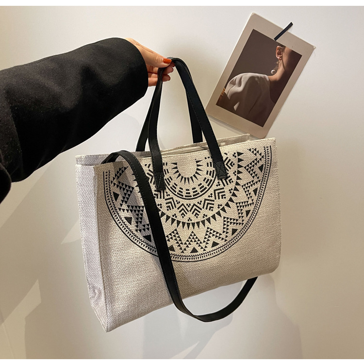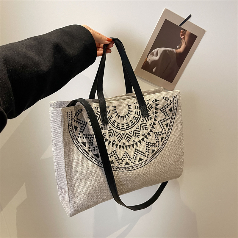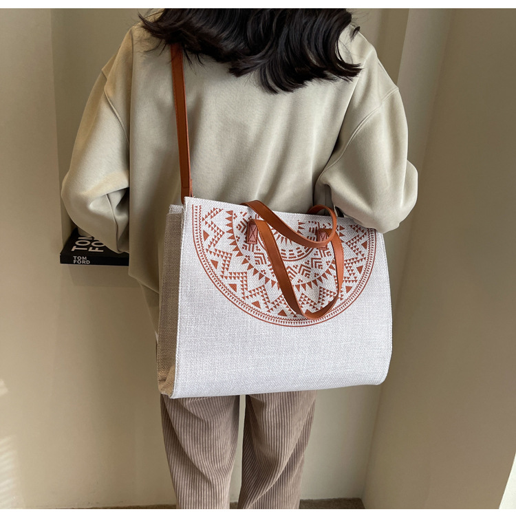 린넨 민족 스타일 캔버스 가방 대용량 2023 캐주얼 새로운 간단한 PU 스티칭 토트 어깨 핸드백