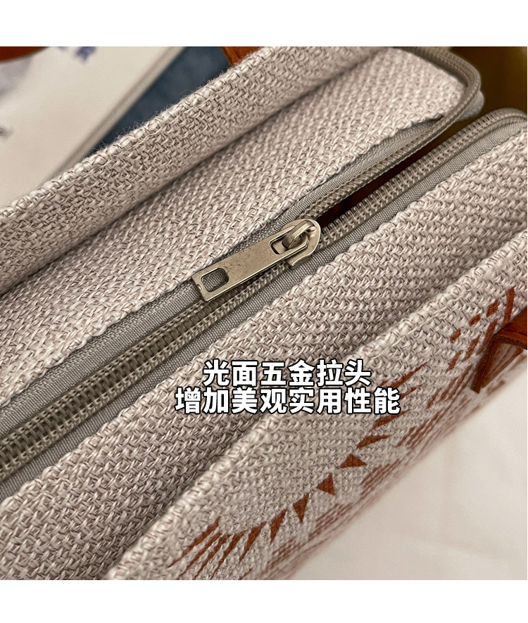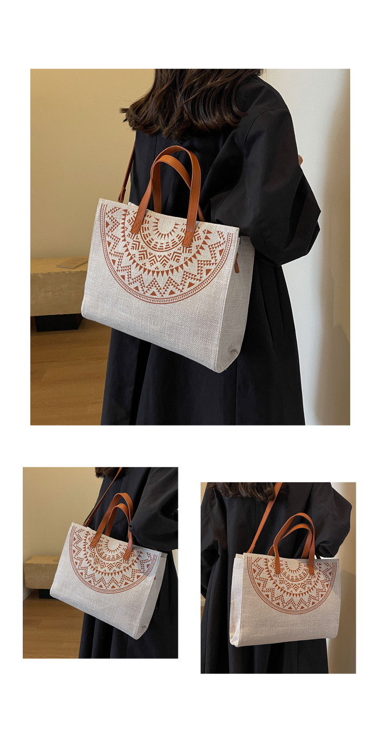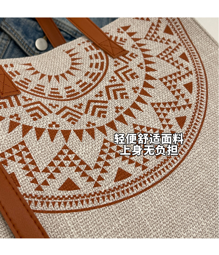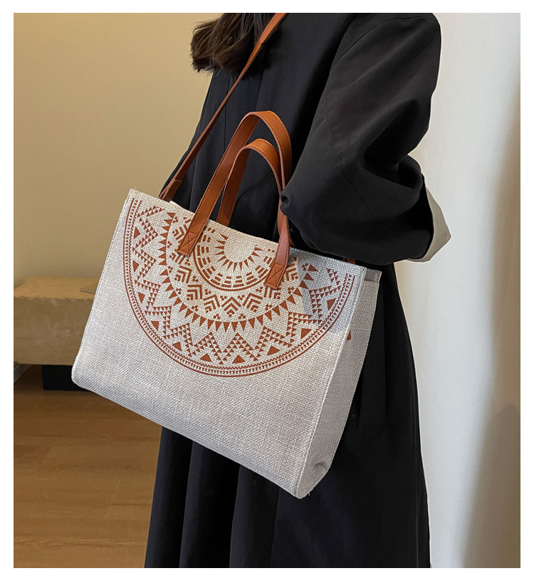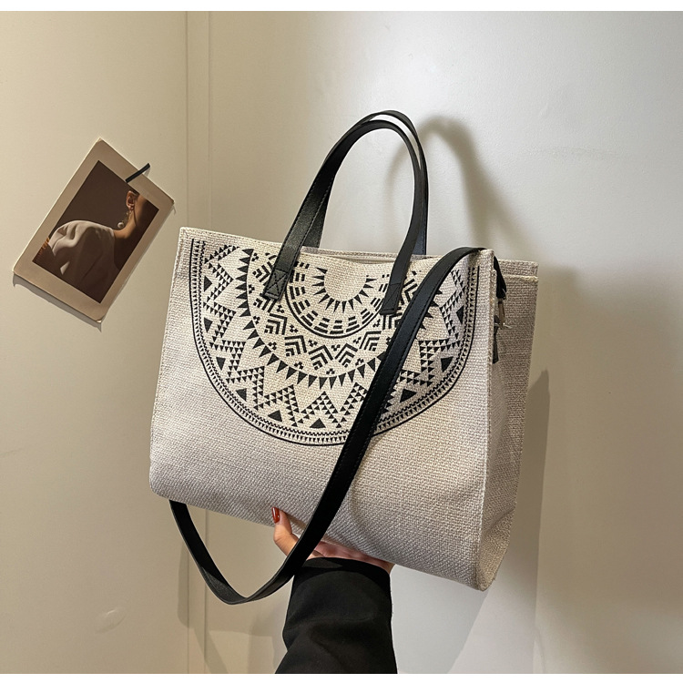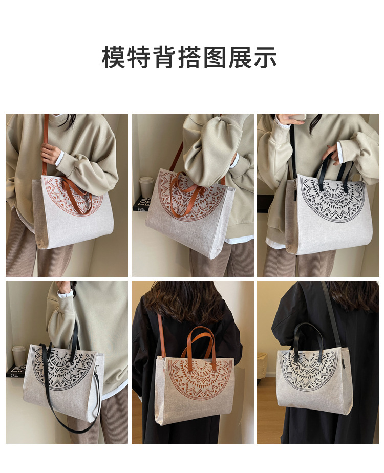 린넨 민족 스타일 캔버스 가방 대용량 2023 캐주얼 새로운 간단한 PU 스티칭 토트 어깨 핸드백