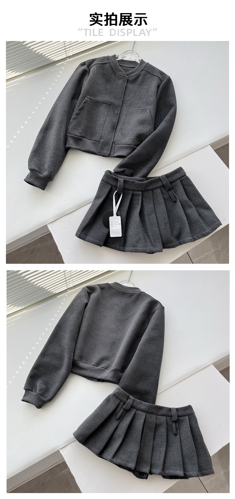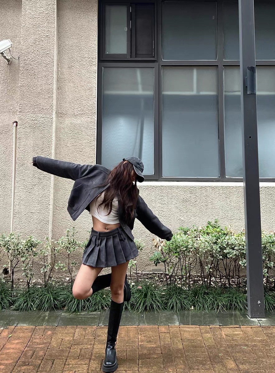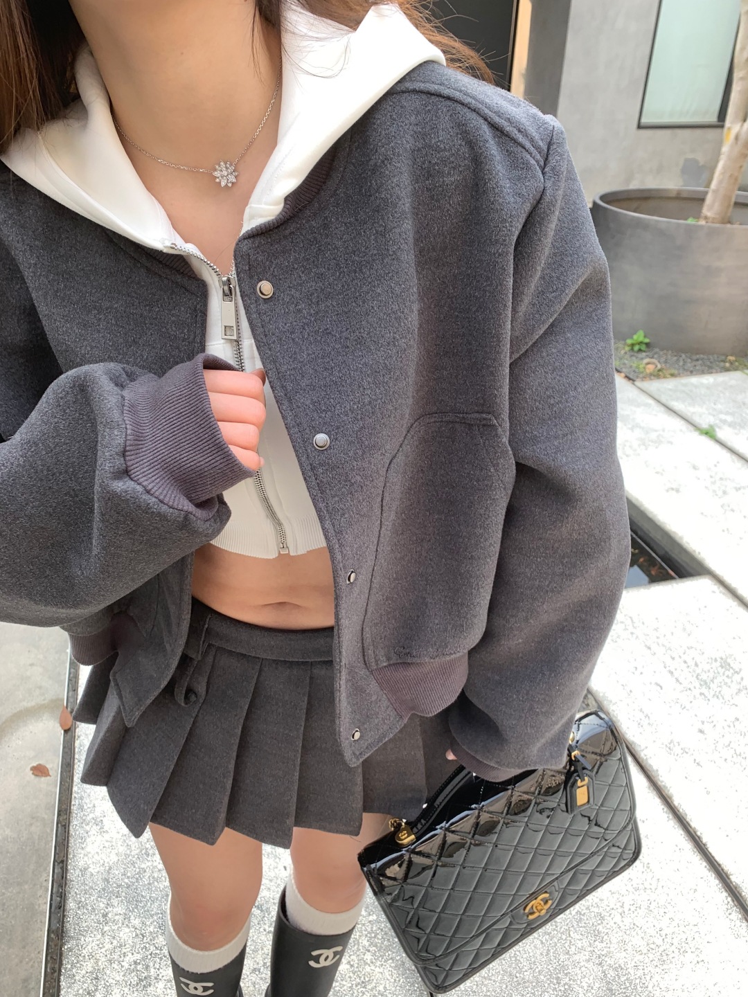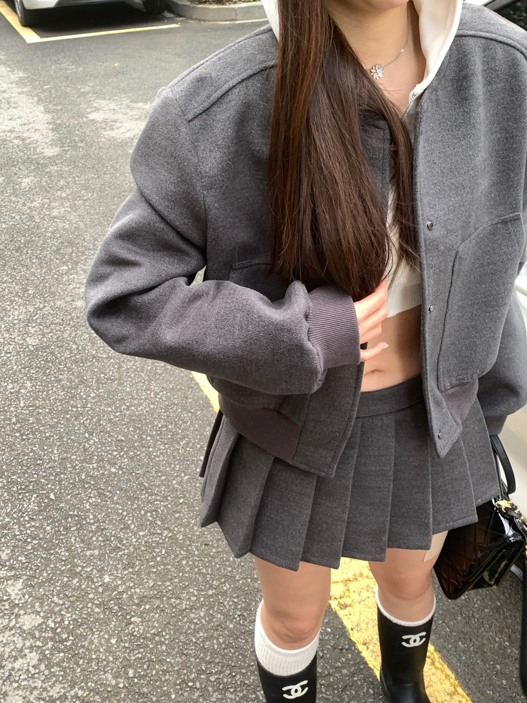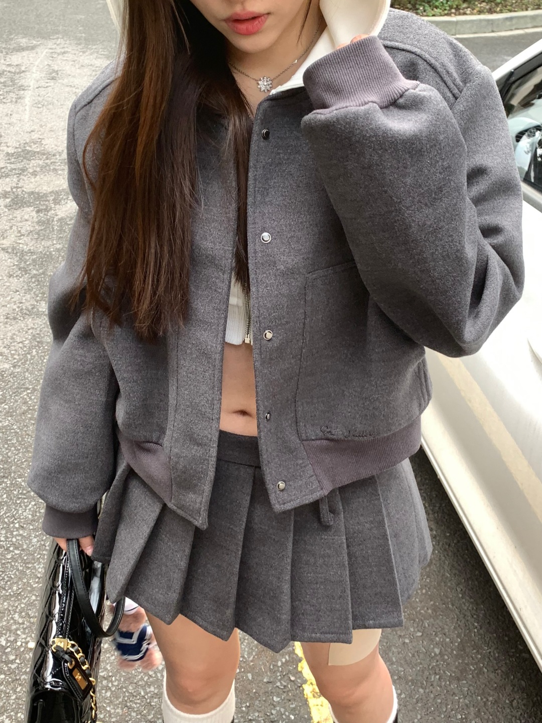 모직 세트 여성용 모직 짧은 야구 재킷 & 모직 더블 행 벨트 버클 플리츠 스커트 바지 3240-3241스토어 가기