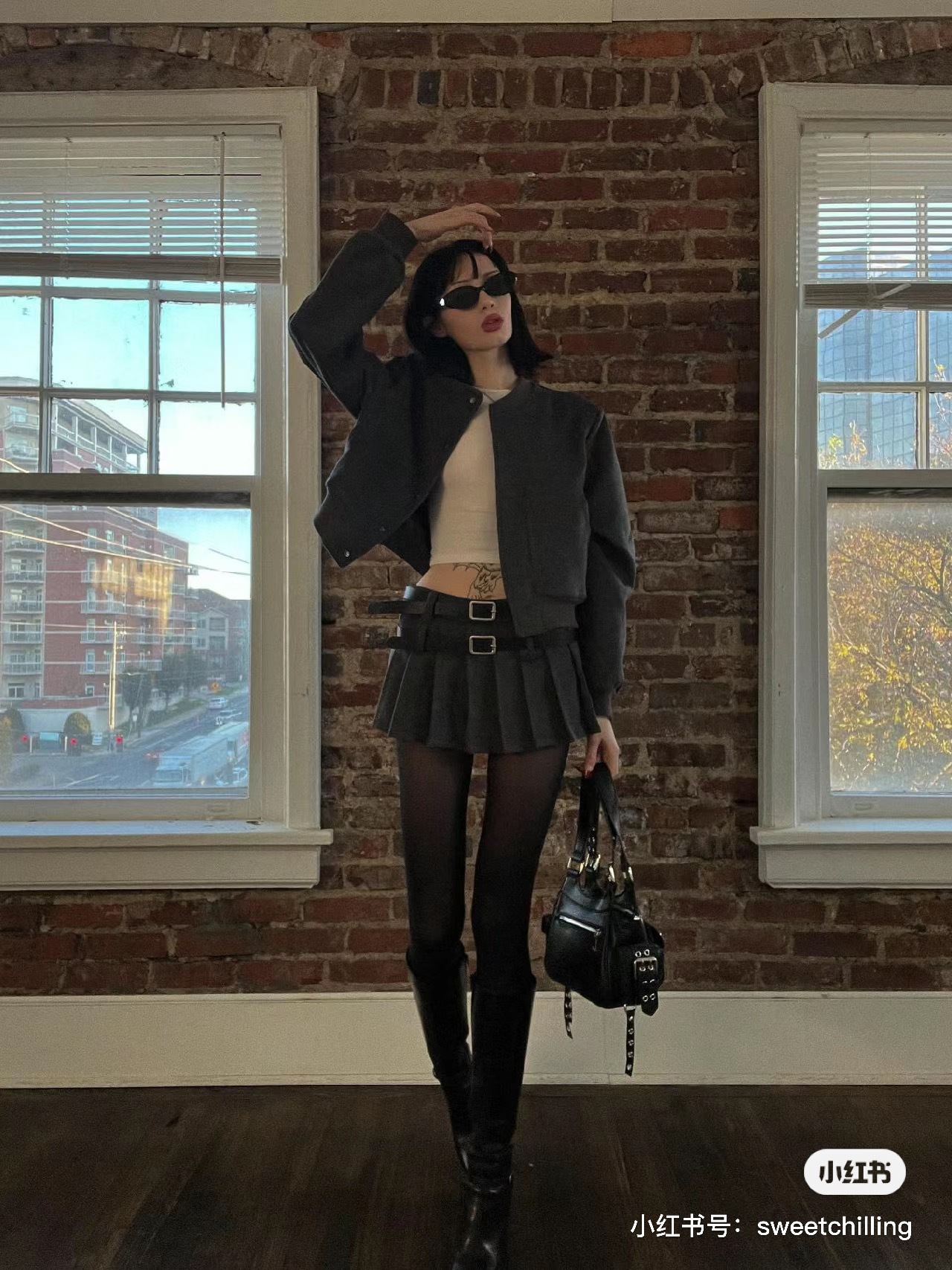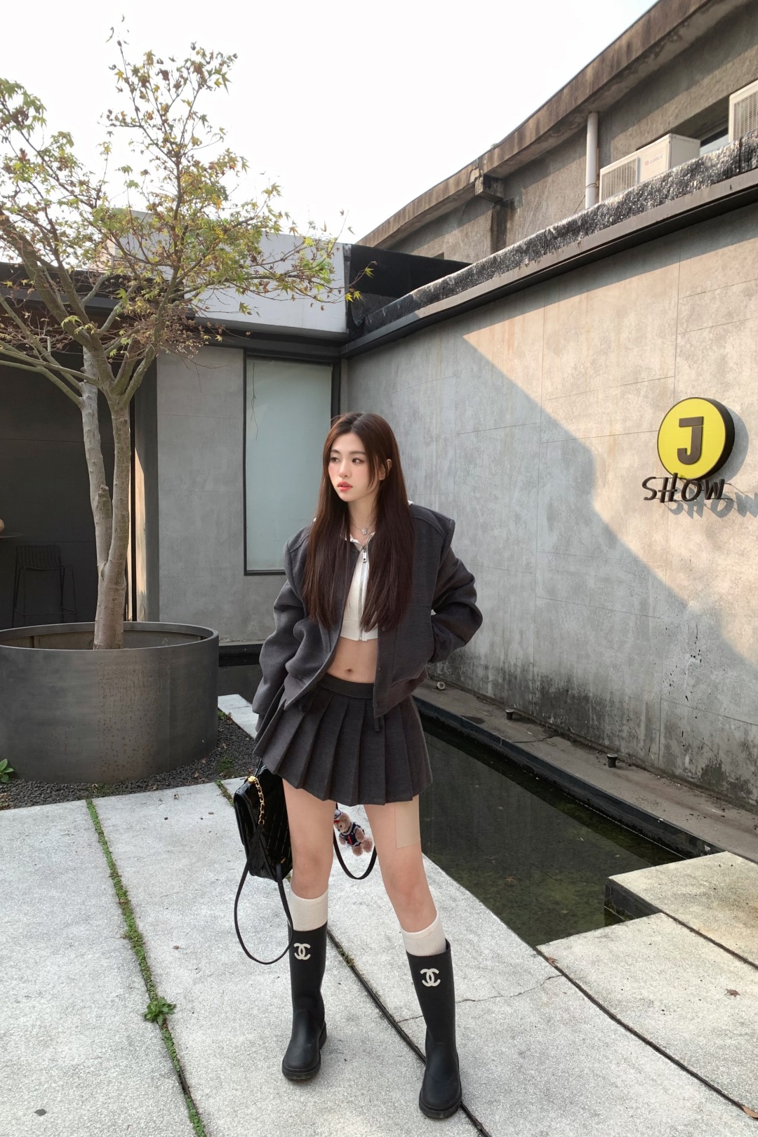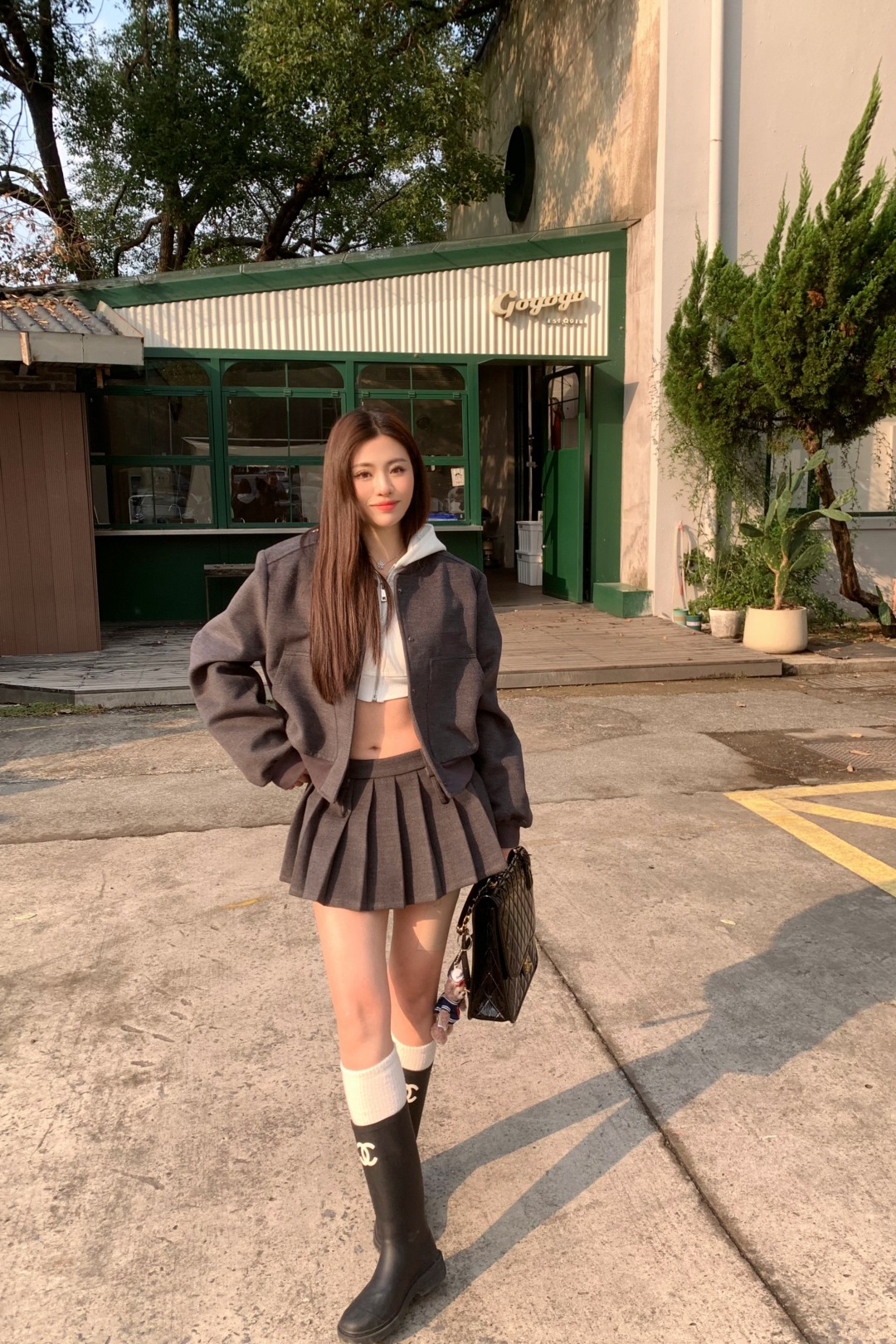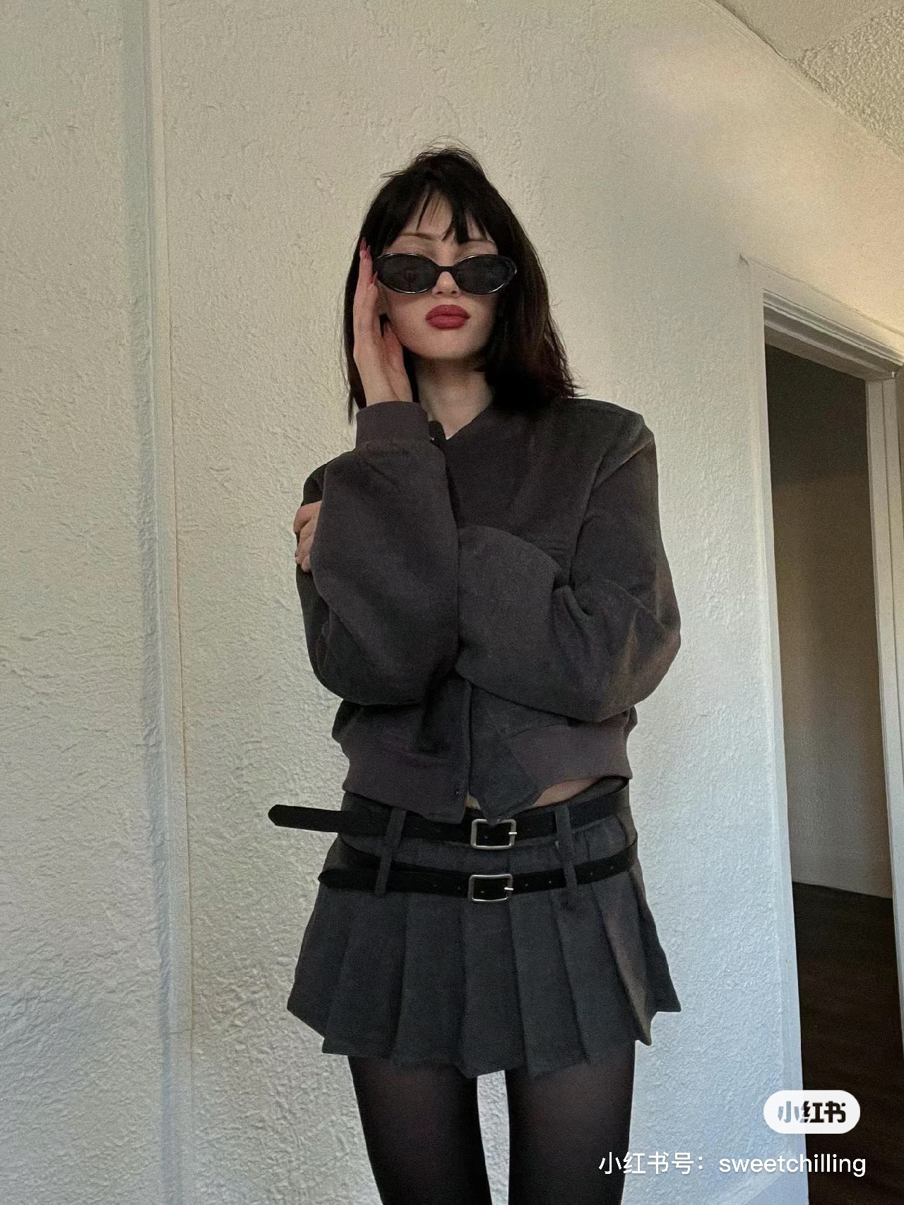 모직 세트 여성용 모직 짧은 야구 재킷 & 모직 더블 행 벨트 버클 플리츠 스커트 바지 3240-3241스토어 가기