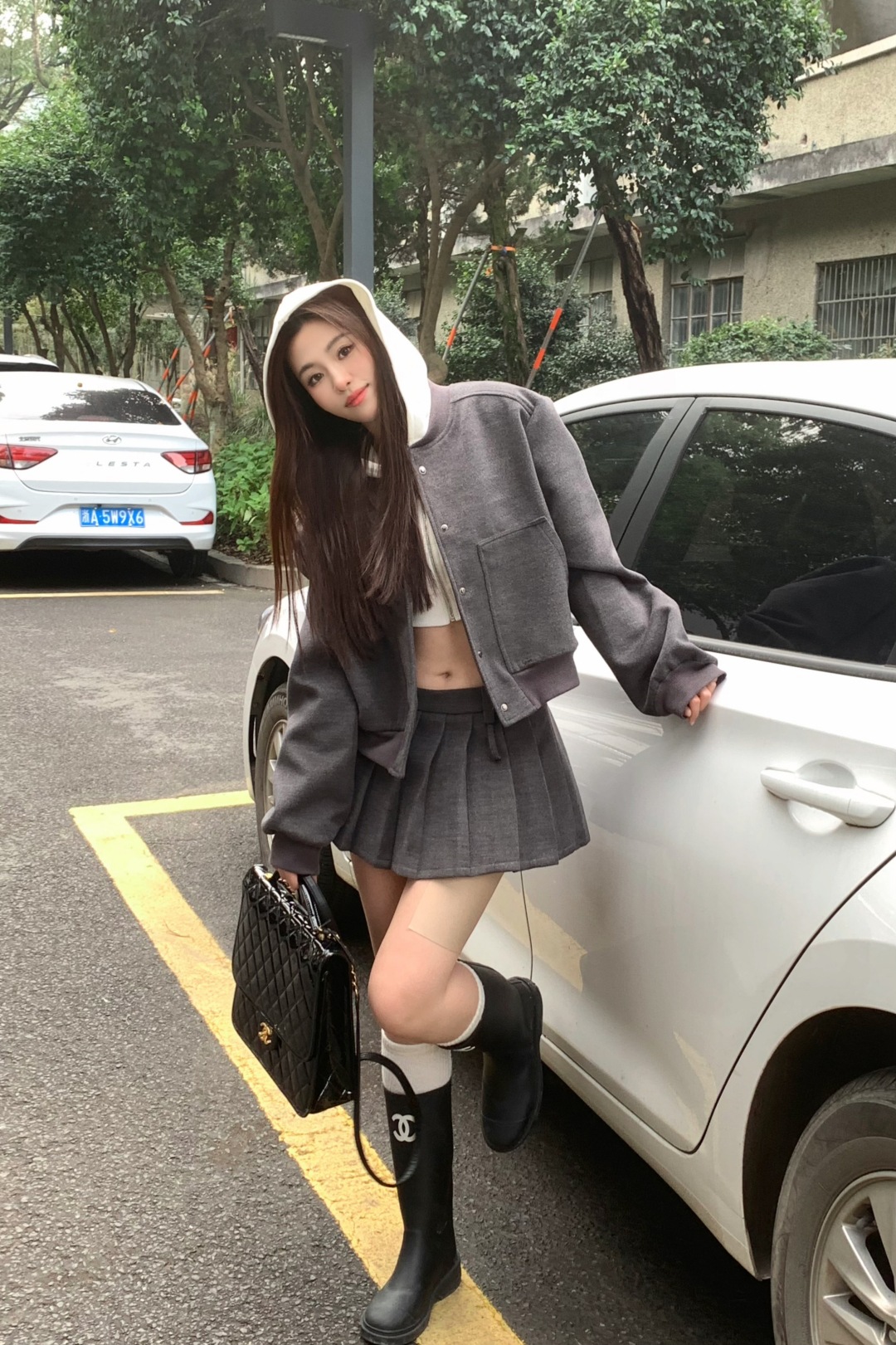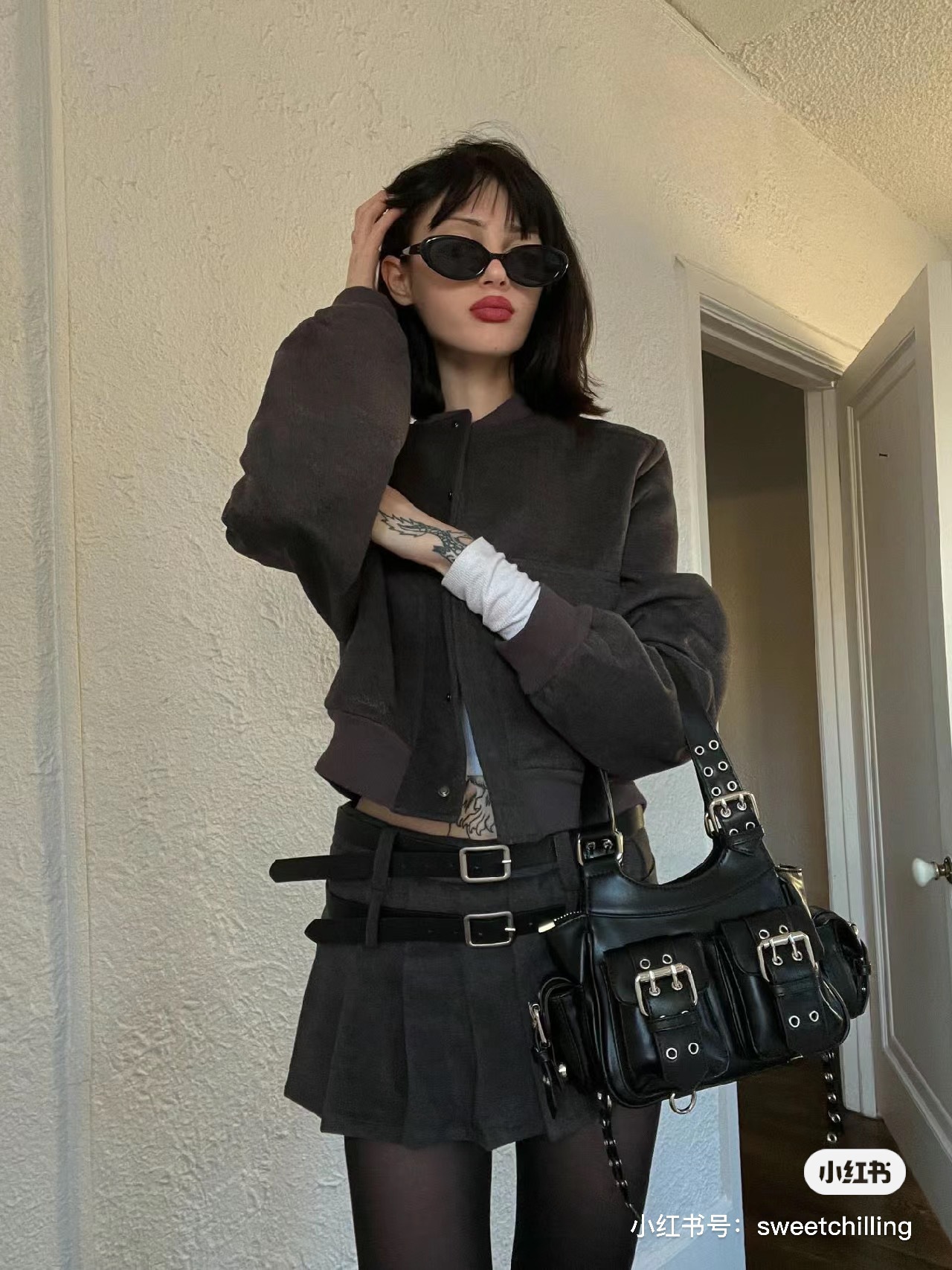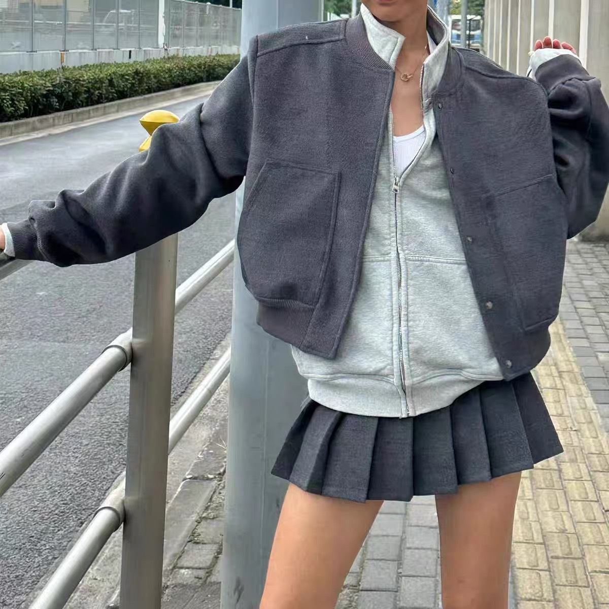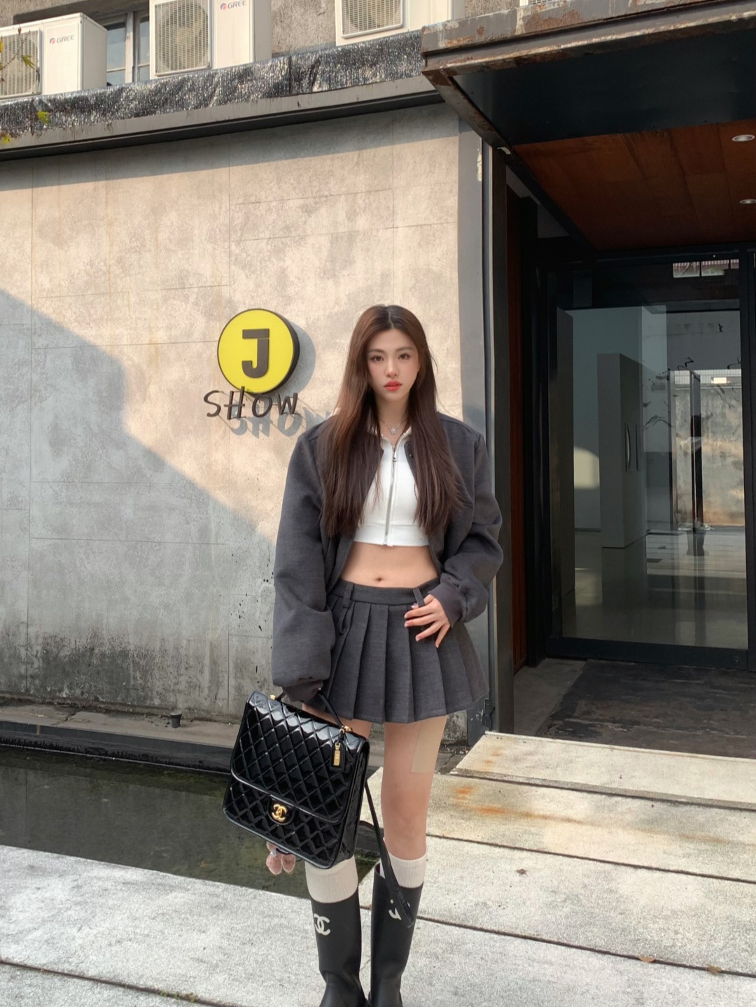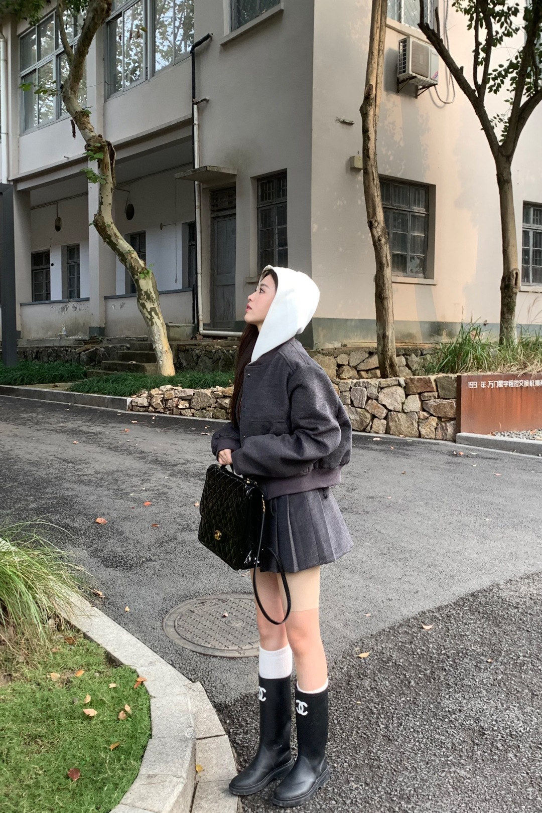모직 세트 여성용 모직 짧은 야구 재킷 & 모직 더블 행 벨트 버클 플리츠 스커트 바지 3240-3241스토어 가기