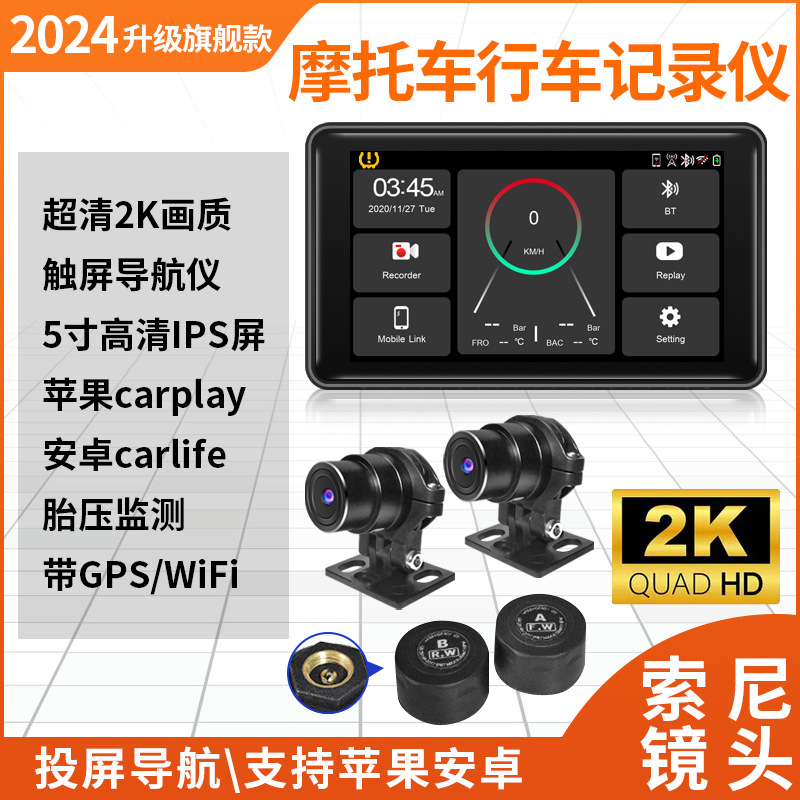 摩托车行车记录仪carplay投屏导航2K胎压检测防水5寸大屏记录仪