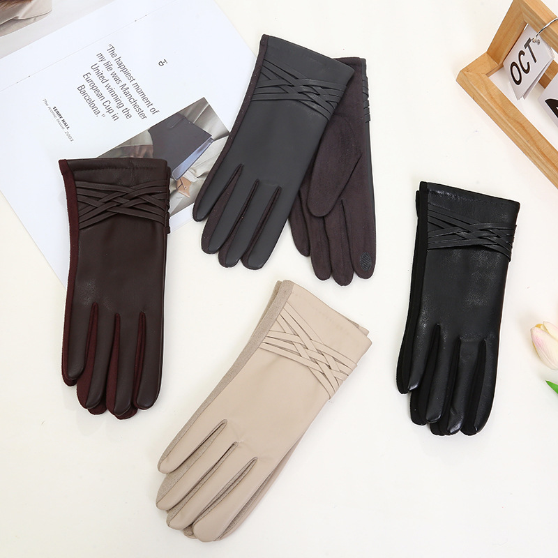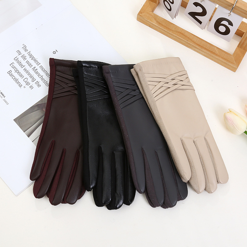가을과 겨울 따뜻한 장갑 여성용 터치 스크린 기모 PU 가죽 장갑 야외 사이클링 모조 가죽 두꺼운 기모 장갑