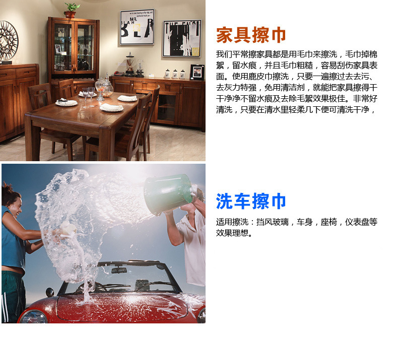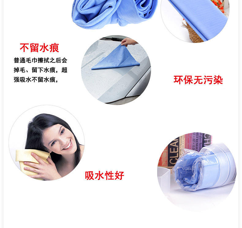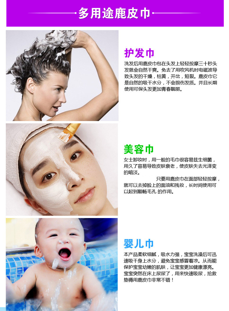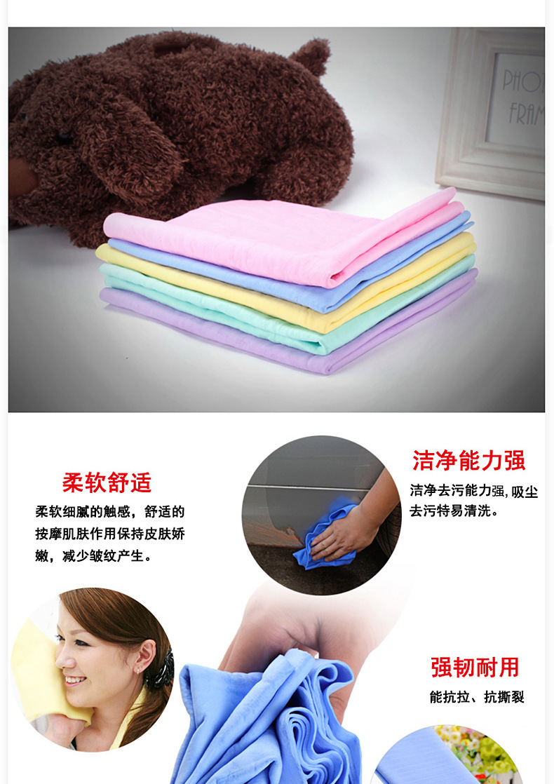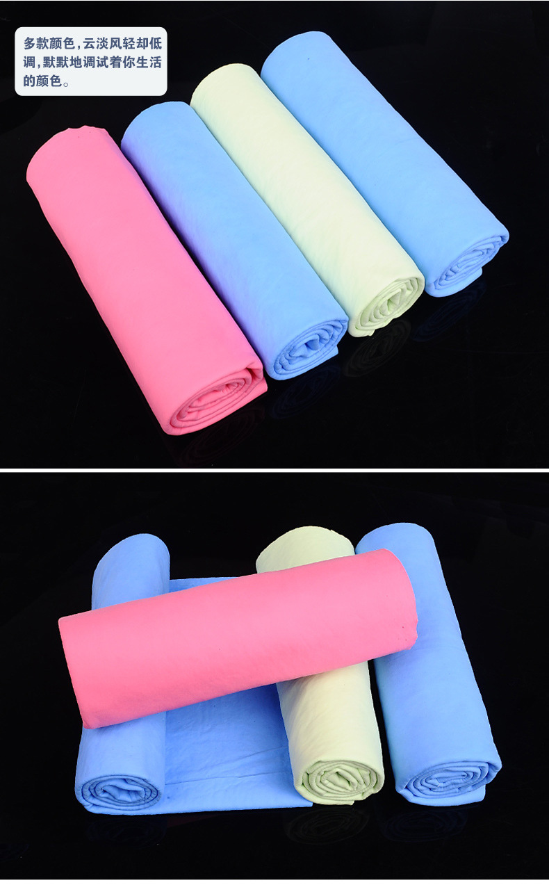鹿皮巾解释:人体用仿鹿皮巾(Chamois Towel or Sport Towel)采用了PVA特殊防霉处理,质地柔软不掉棉絮,具有微细结构,利用毛细现象将物体表面的水迅速吸干,因而具有强大的吸水力,洗完头轻擦几下即可将头发擦干九成。,成为科技时代新生活的日用必需品。本产品韧度强,能抗拉、抗撕裂;吸水性强;触感,柔软细腻,经久耐用;环保PVA材料制造,干燥时呈硬块状,以阻止病菌入侵和繁殖。
