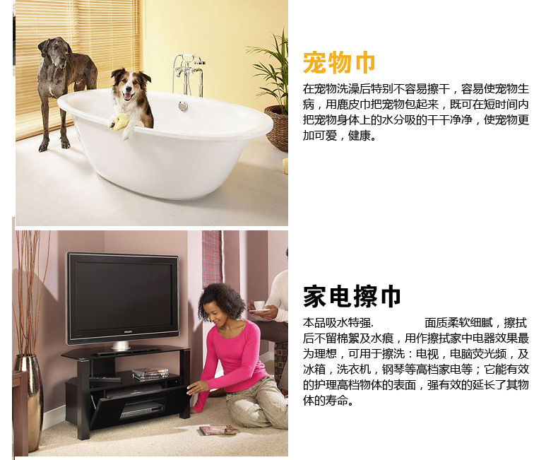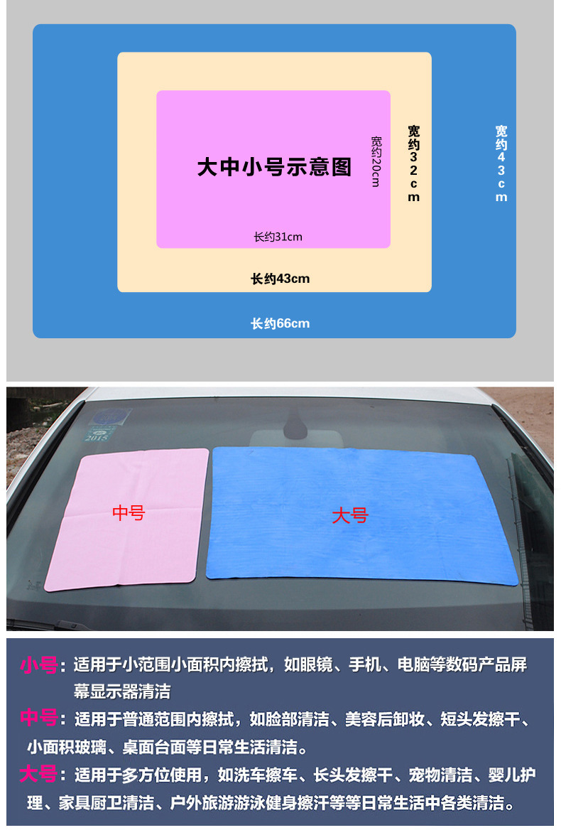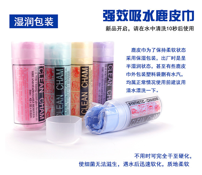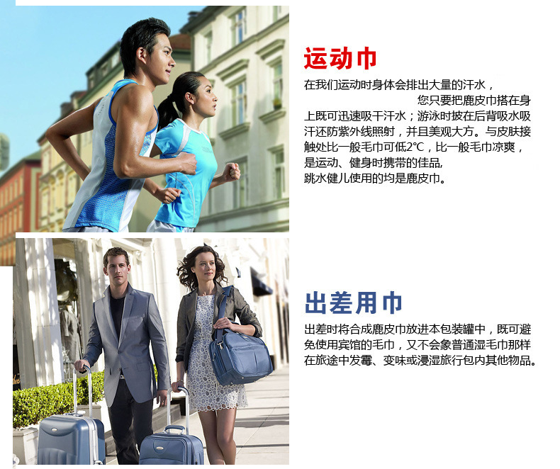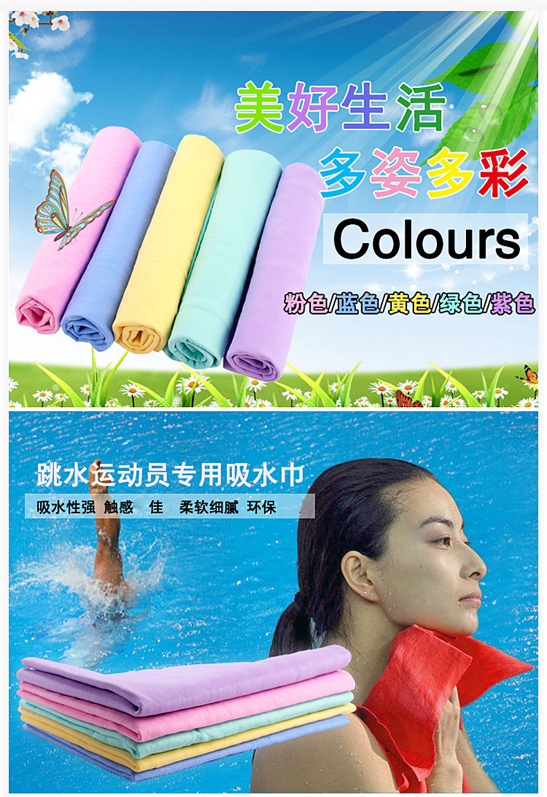 鹿皮巾解释:人体用仿鹿皮巾(Chamois Towel or Sport Towel)采用了PVA特殊防霉处理,质地柔软不掉棉絮,具有微细结构,利用毛细现象将物体表面的水迅速吸干,因而具有强大的吸水力,洗完头轻擦几下即可将头发擦干九成。,成为科技时代新生活的日用必需品。本产品韧度强,能抗拉、抗撕裂;吸水性强;触感,柔软细腻,经久耐用;环保PVA材料制造,干燥时呈硬块状,以阻止病菌入侵和繁殖。