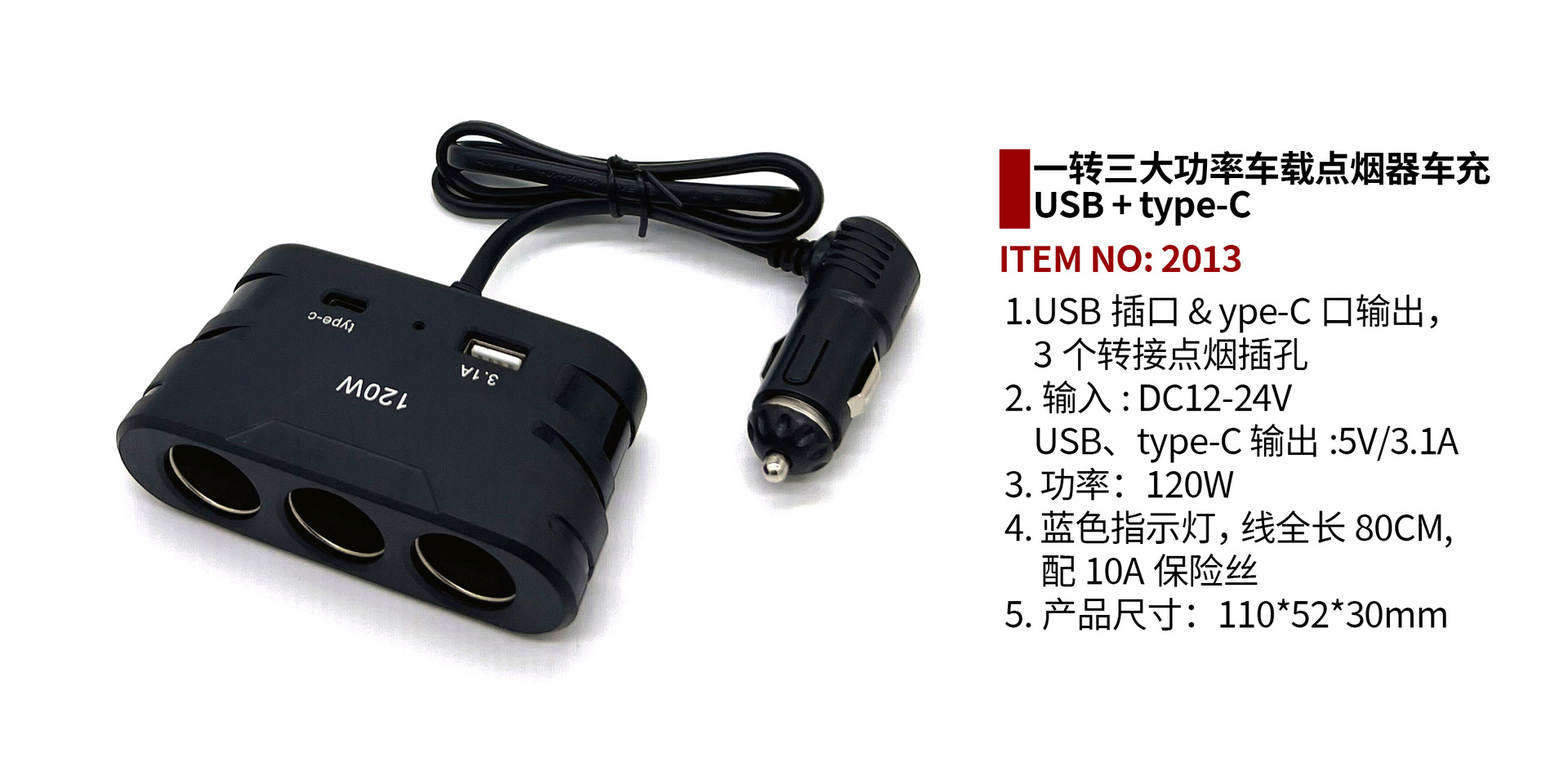 1.USB插口 & type-C口输出, 3个转接点烟插孔