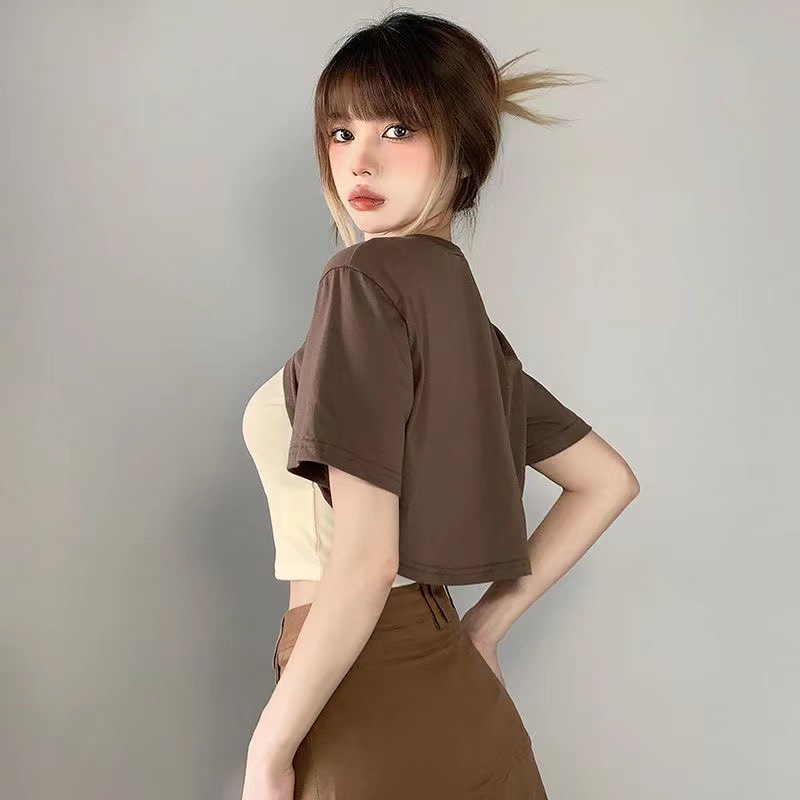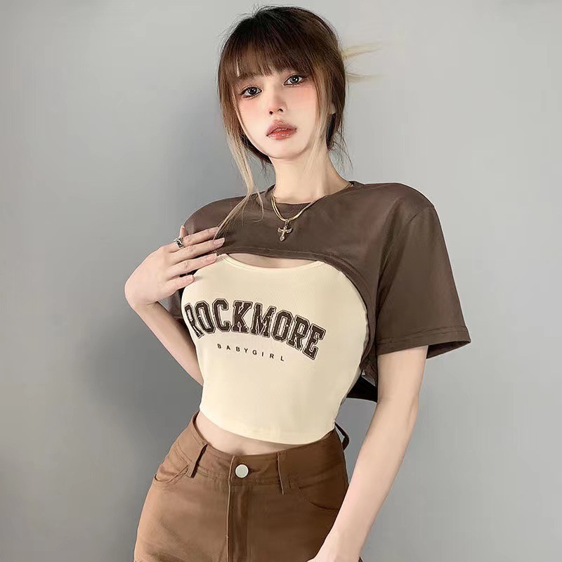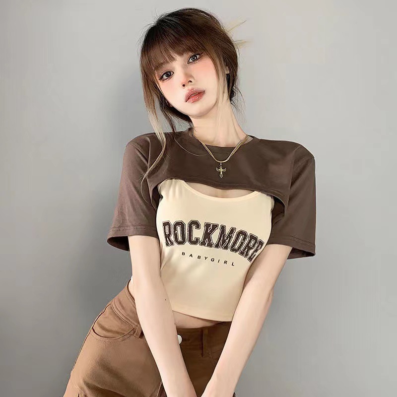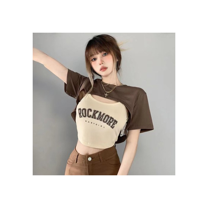 470 # 아이스 실크 스레드 스트리트 슬링 블라우스 투피스 인 프린트 특성 중공 스티치 반팔 티셔츠