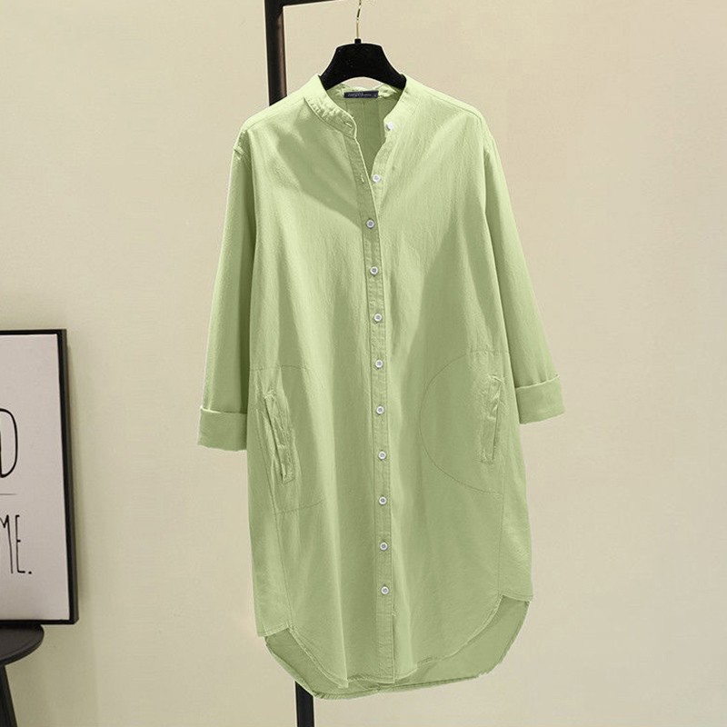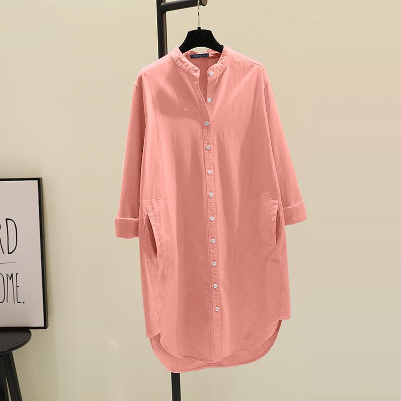 中长衬衫女式春秋立领长袖衬衫带口袋宽松中长衬衫,多色