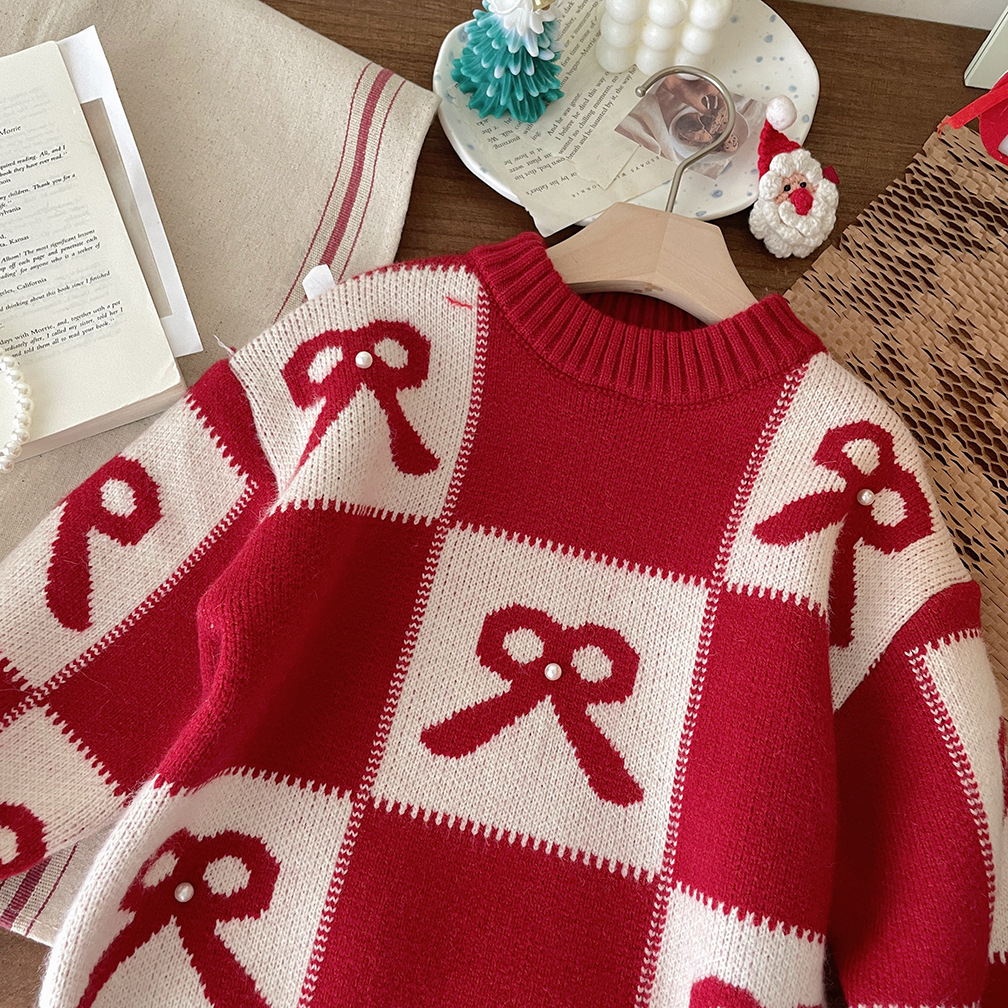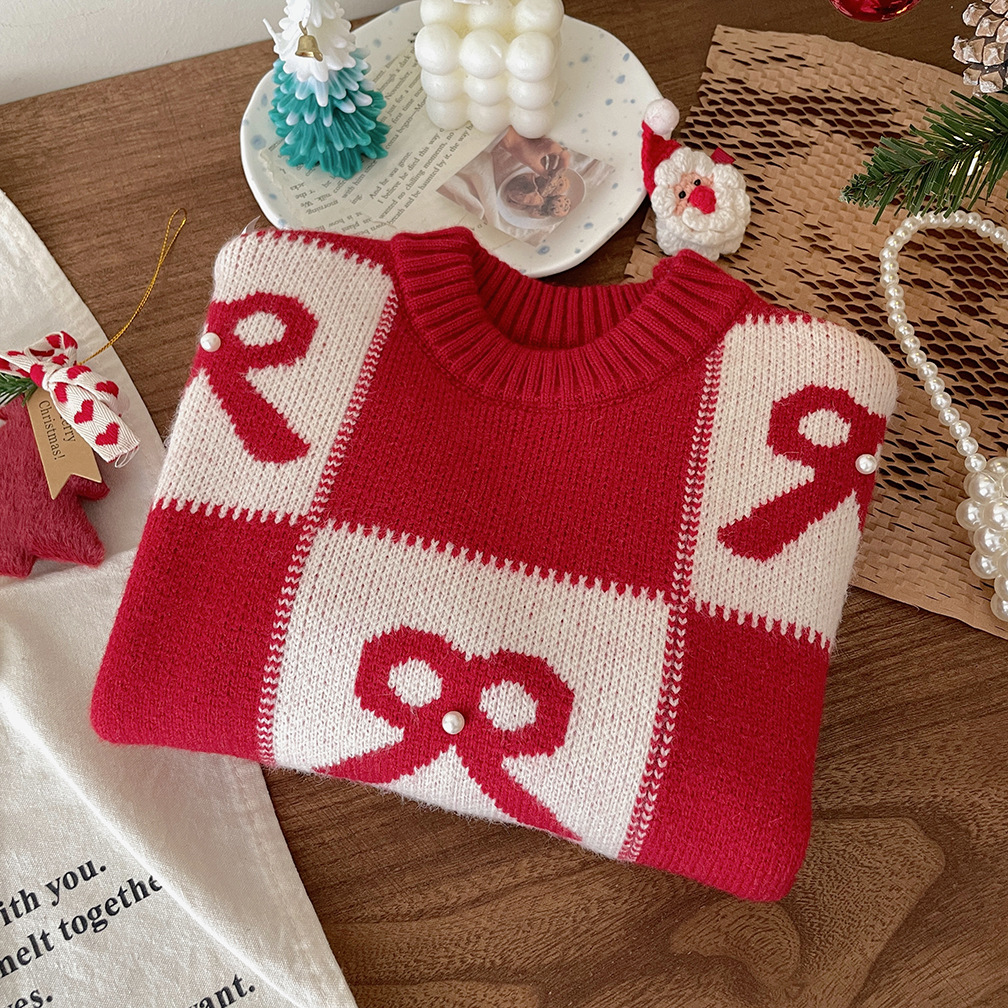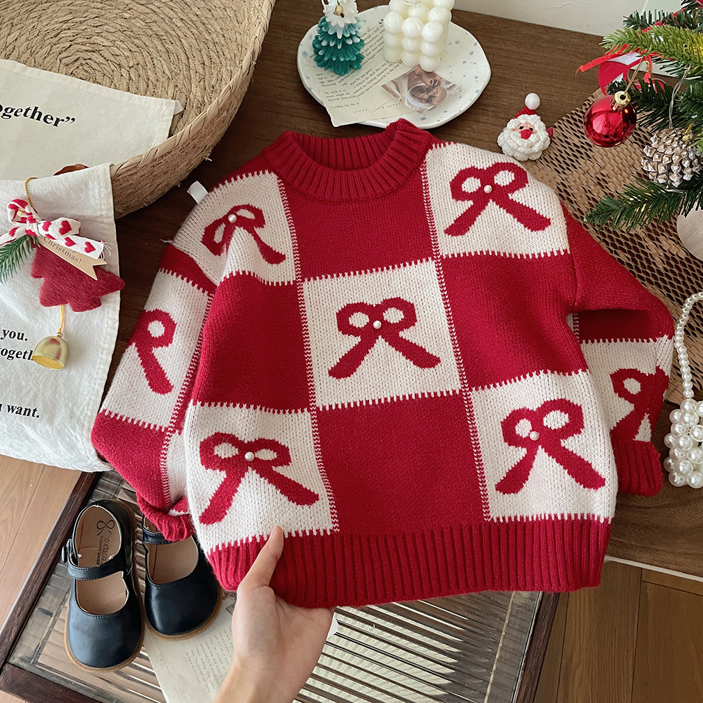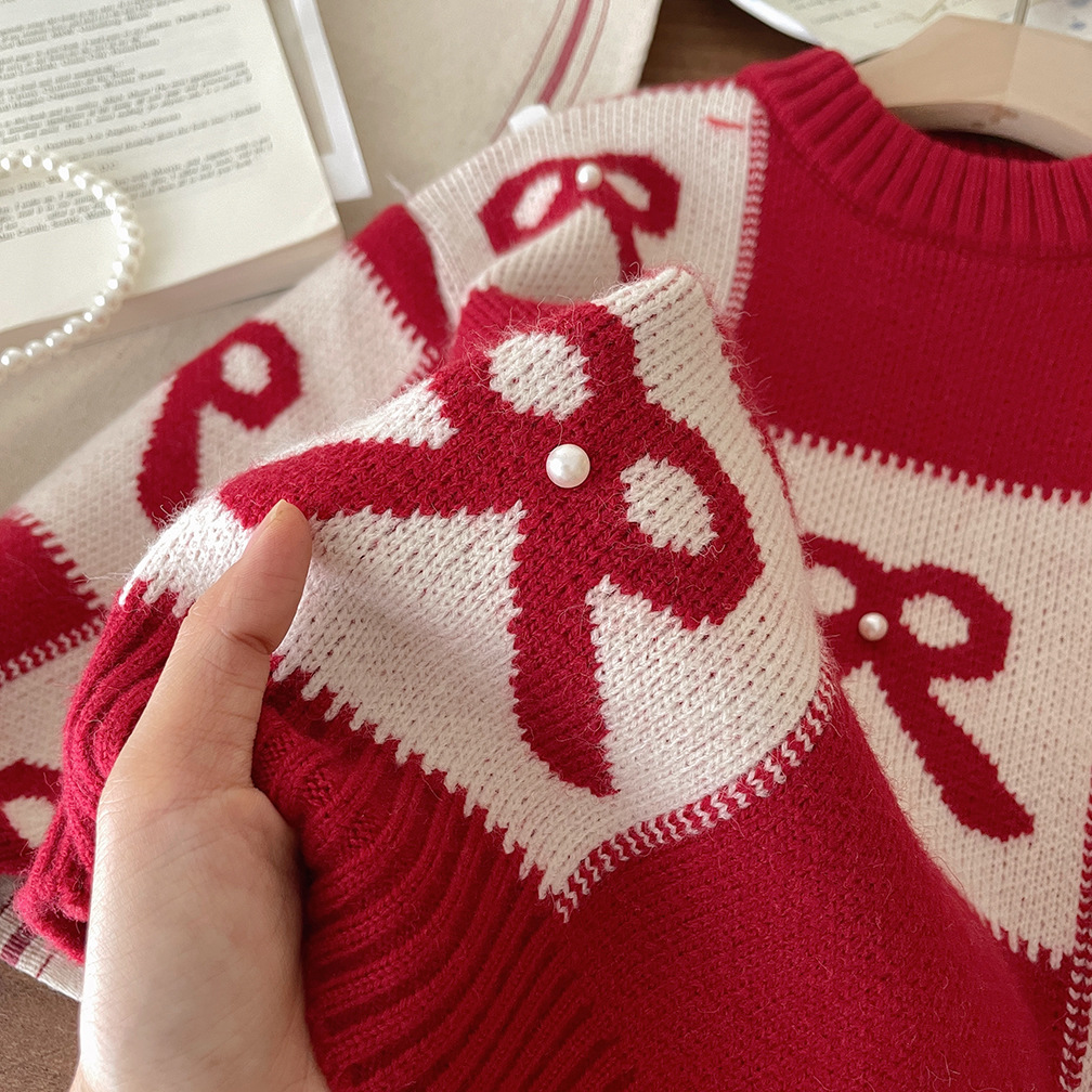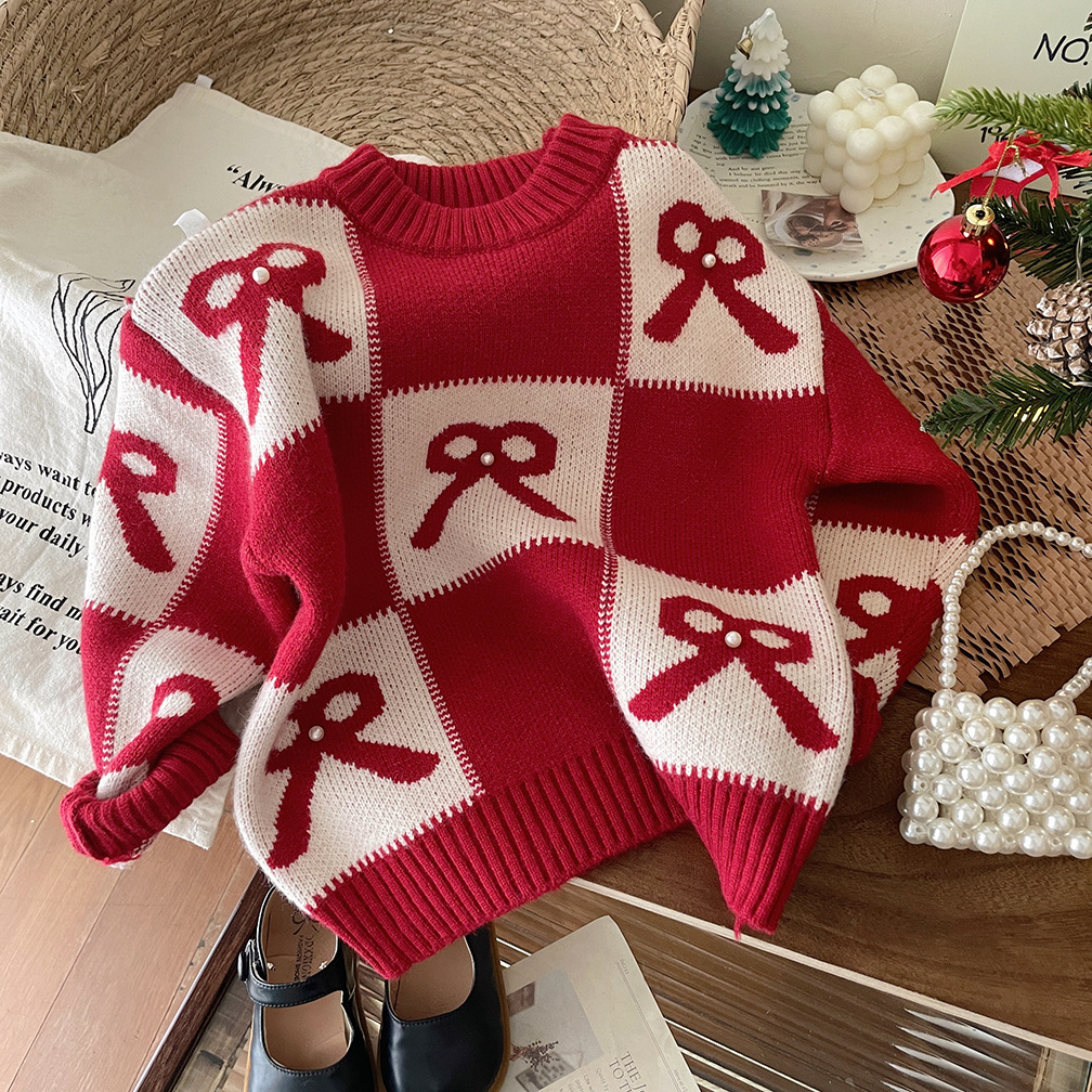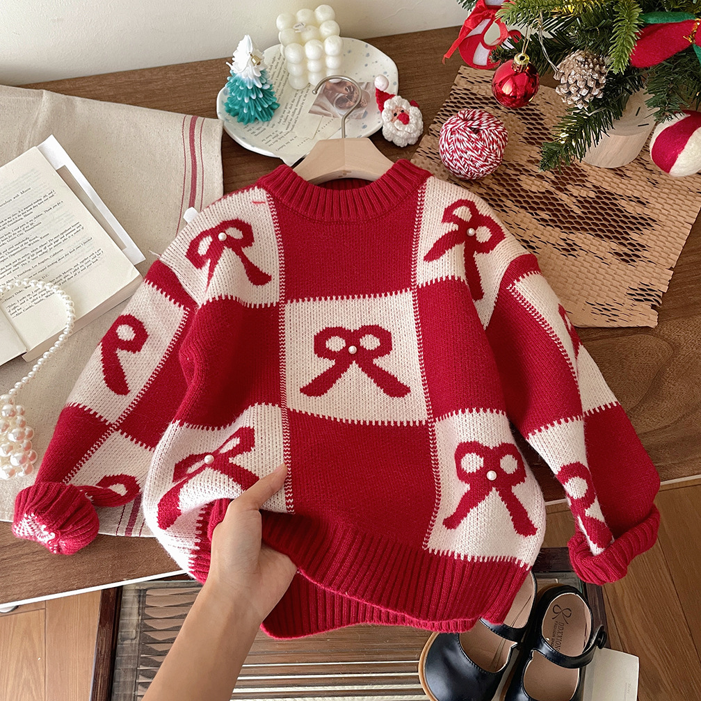 여아용 빨간색 두꺼운 스웨터 2025 가을 겨울 신상 패션 어린이 니트웨어 크리스마스 및 설날 의류스토어 가기