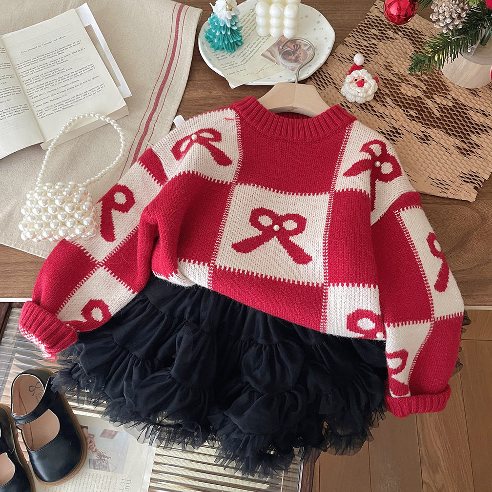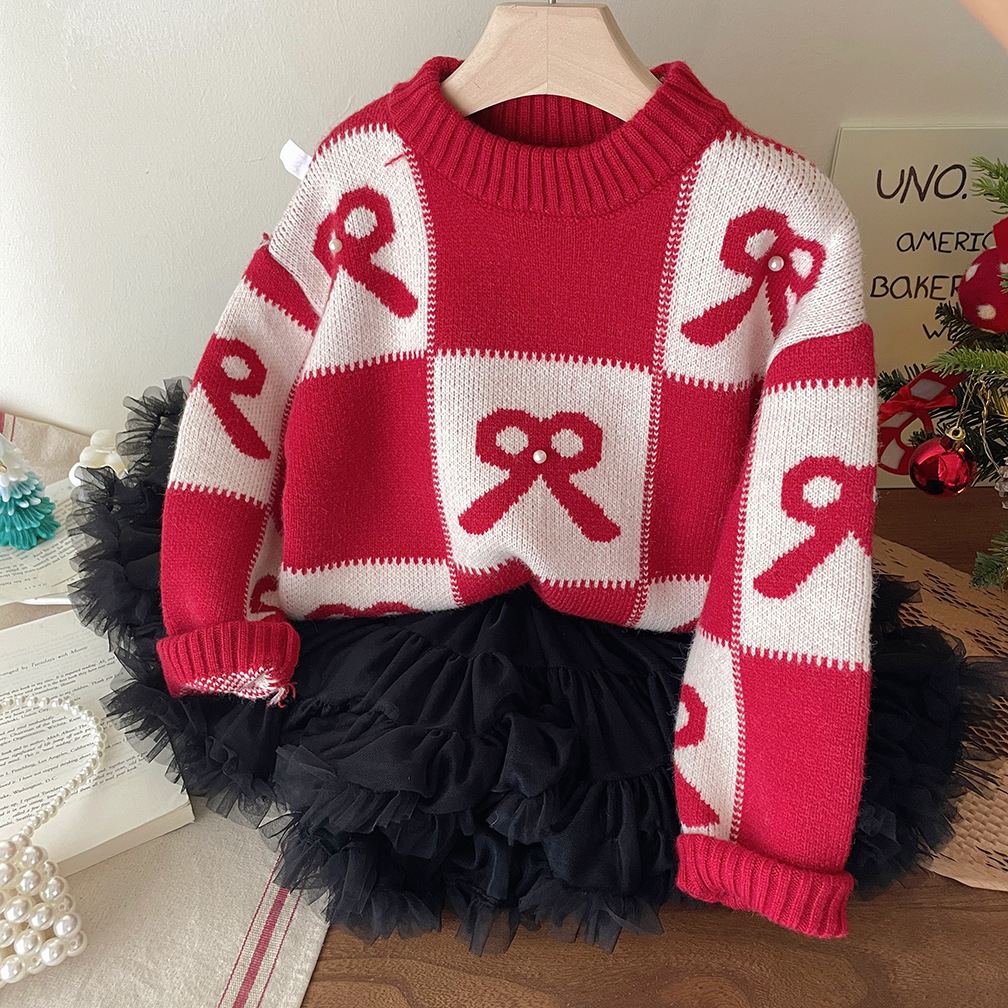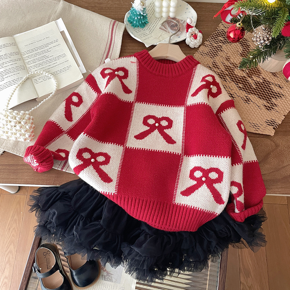 여아용 빨간색 두꺼운 스웨터 2025 가을 겨울 신상 패션 어린이 니트웨어 크리스마스 및 설날 의류
