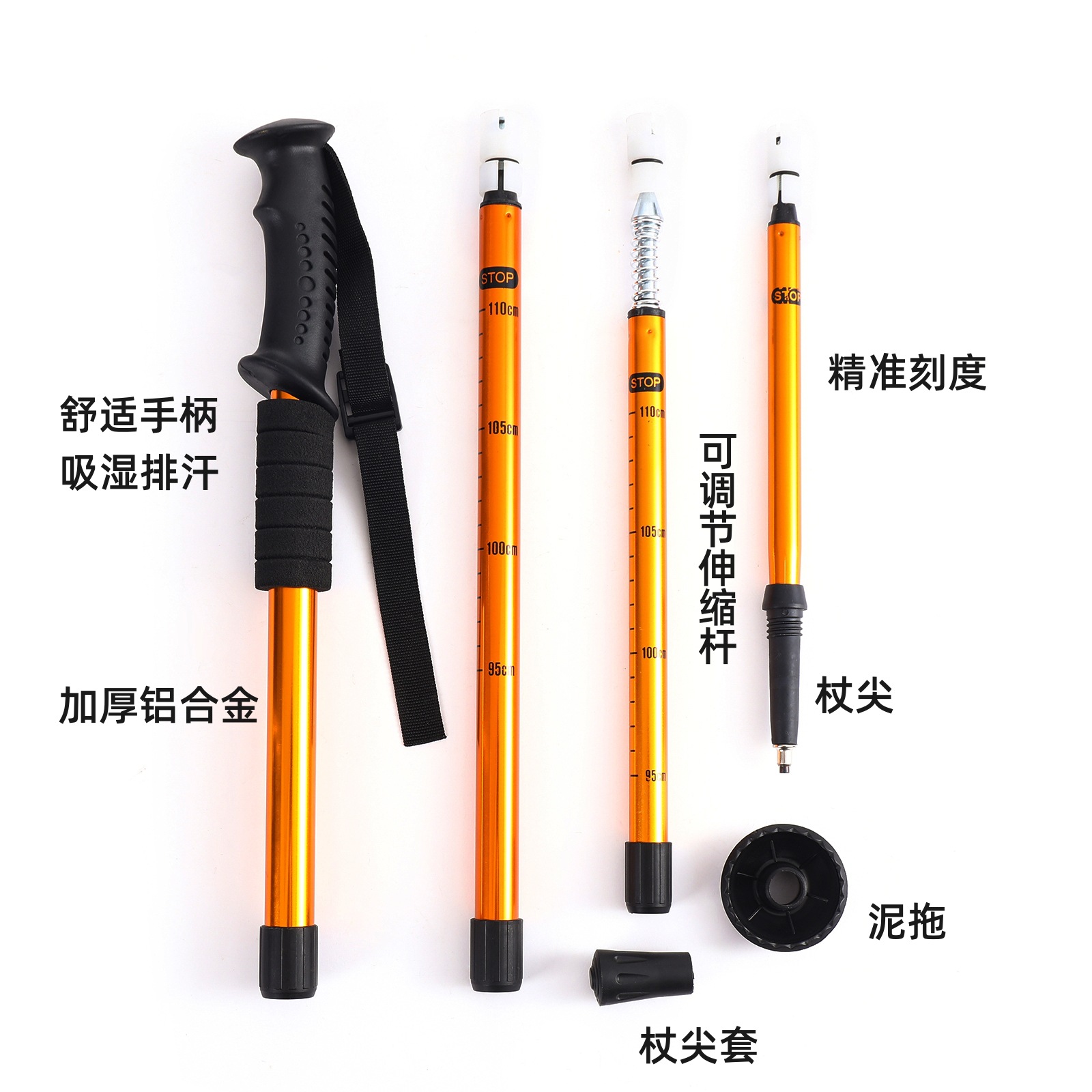 材质:杖杆—硬铝合金 杖尖—碳钢 手柄—PP/TPR