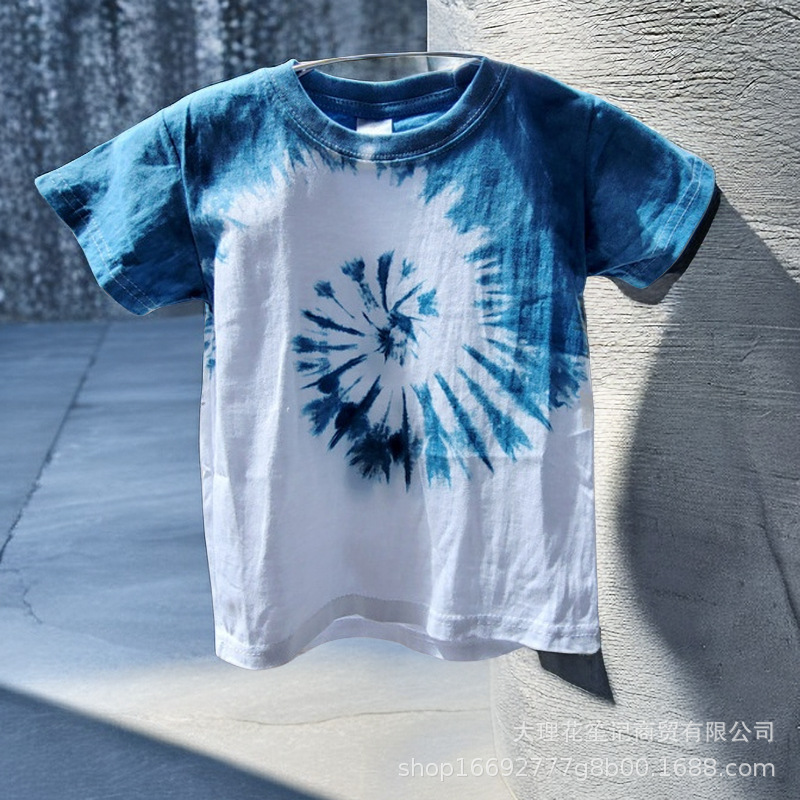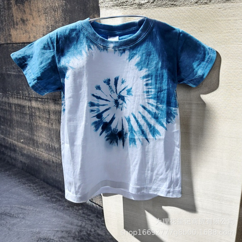 Yunnan 수제 타이 다이 티셔츠 어린이 라운드 넥 탑 반팔 형제 자매의 파란색과 흰색 통기성 편안한베이스 셔츠 아동복